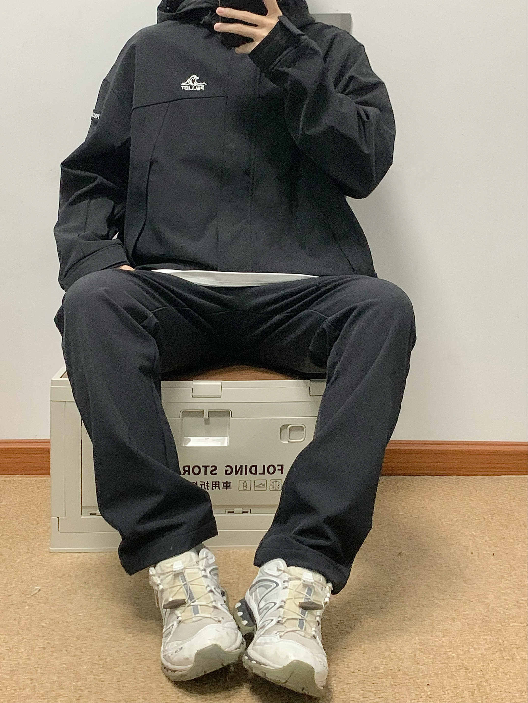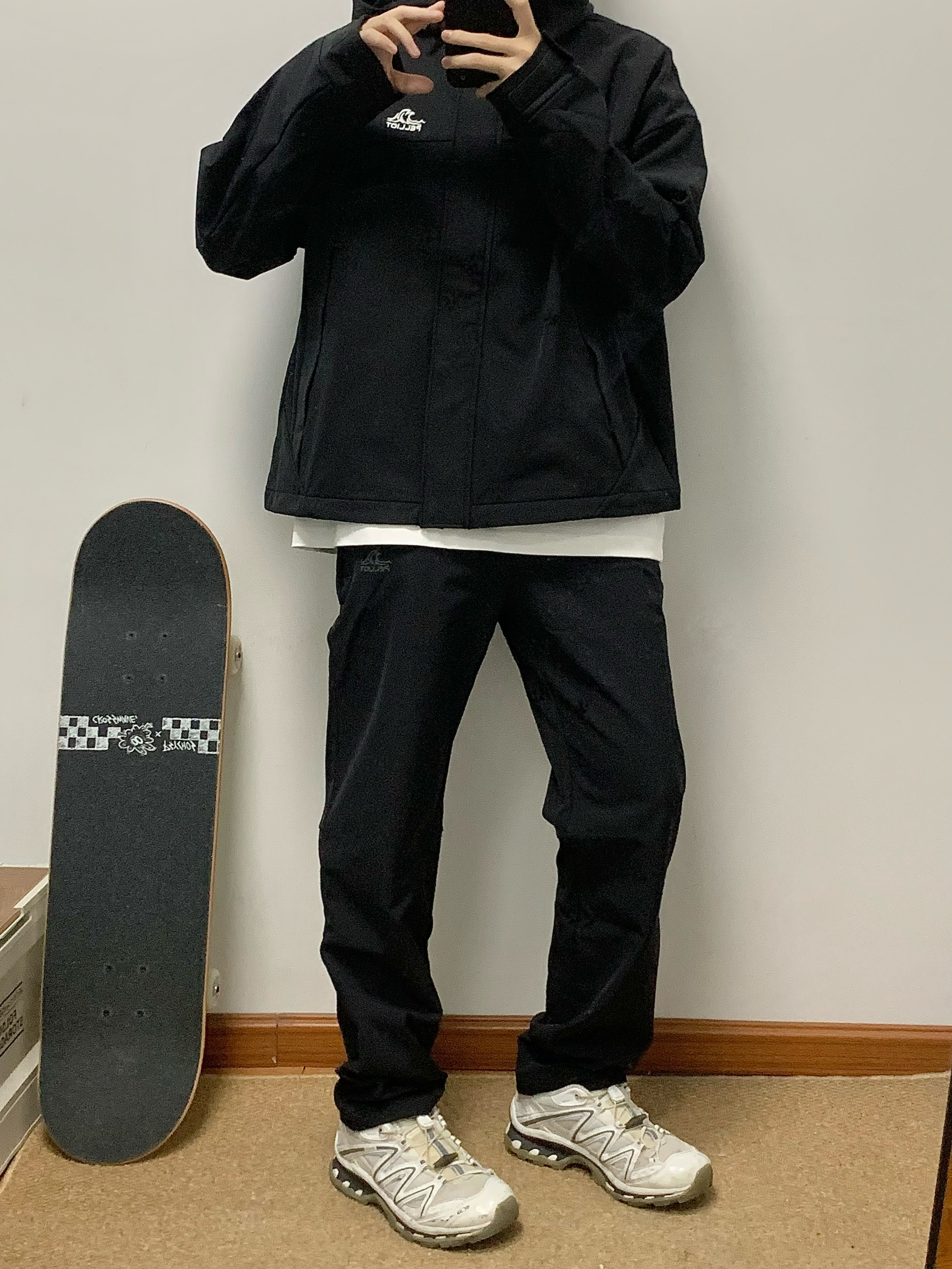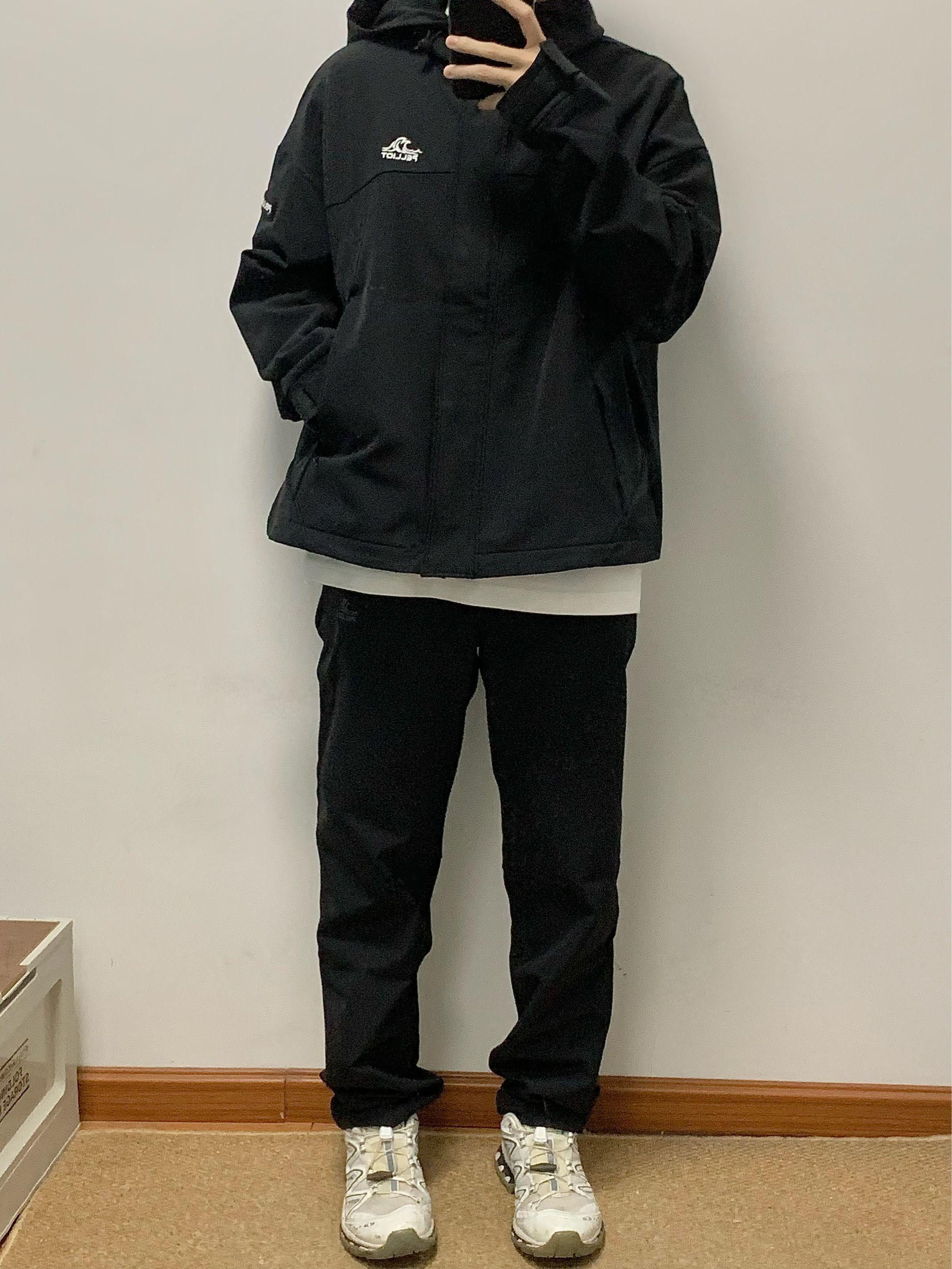 黑色夹克搭配黑色冲锋裤 帅酷拿捏 软壳的面料 上身舒适方便活动 防风防泼水材质 内里还有加绒 日常通勤或者户外穿都可 户外出游就穿这一身 包出片的! 👔:伯希和 👖:伯希和