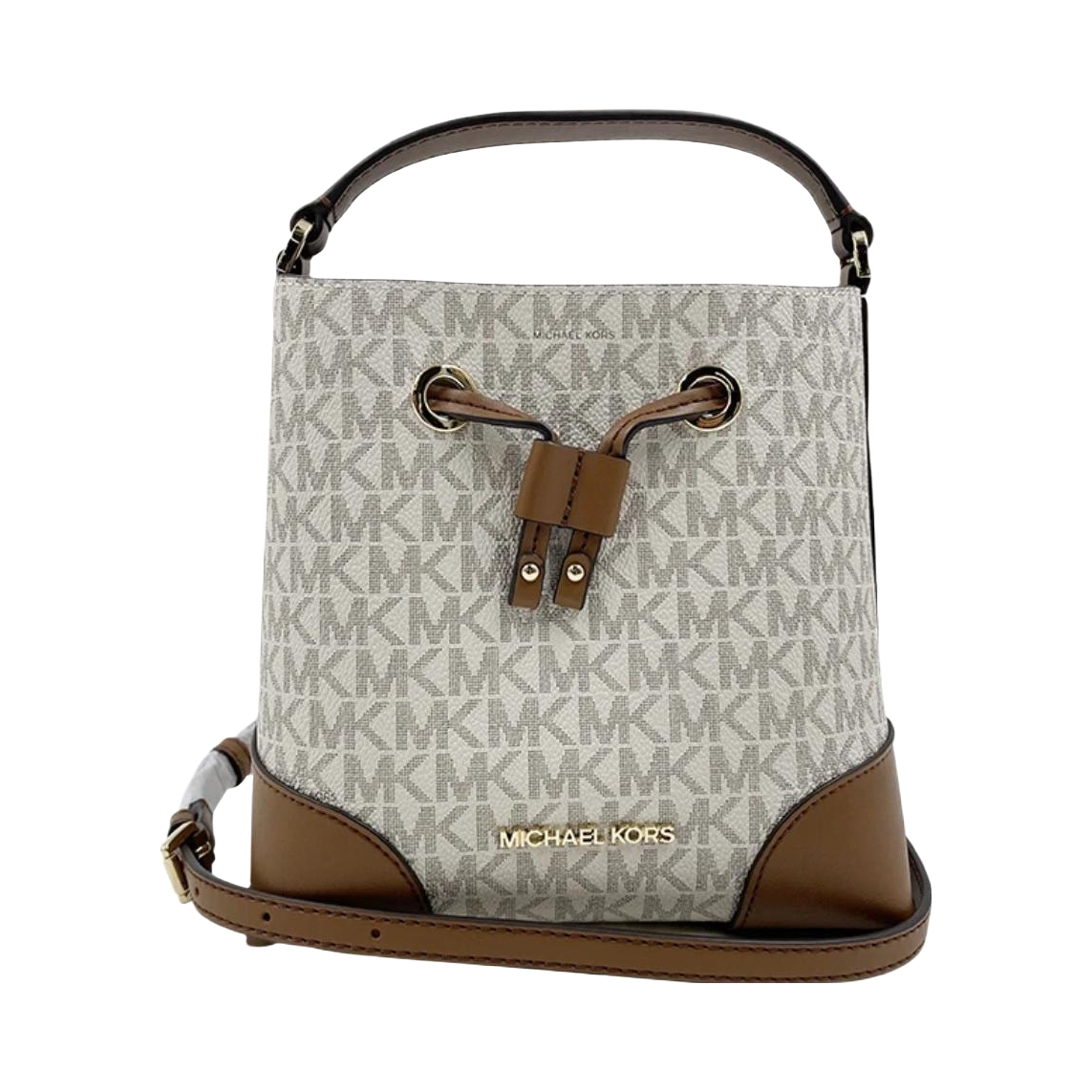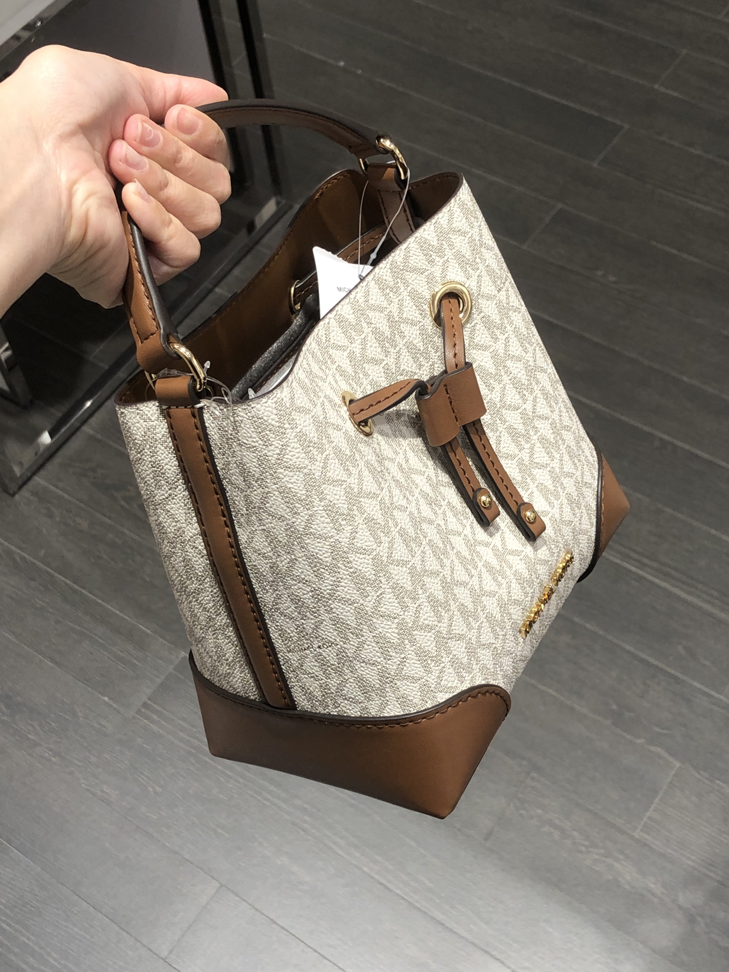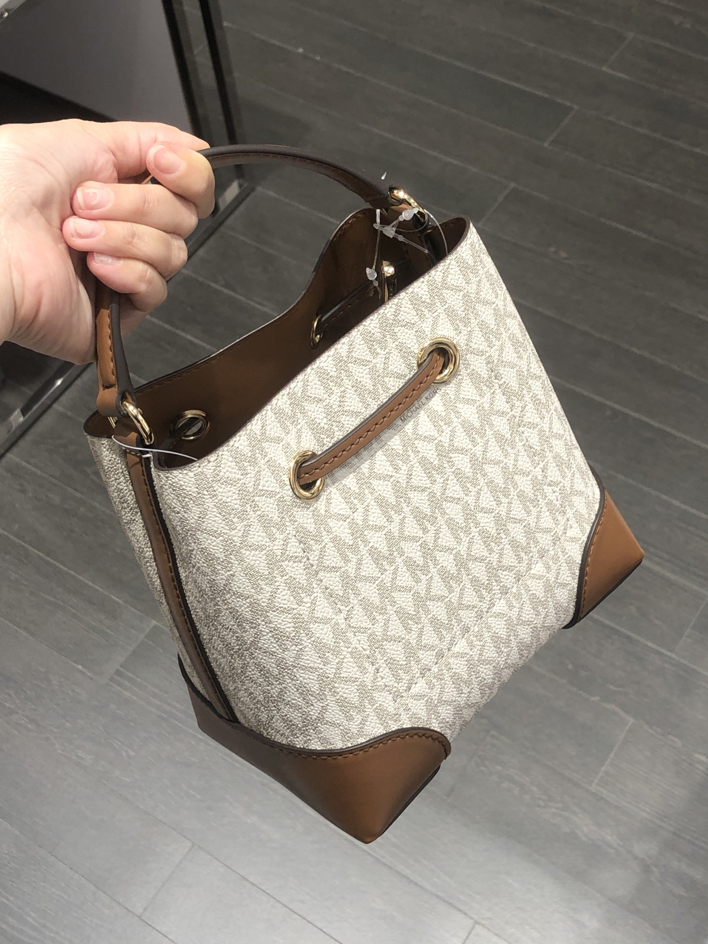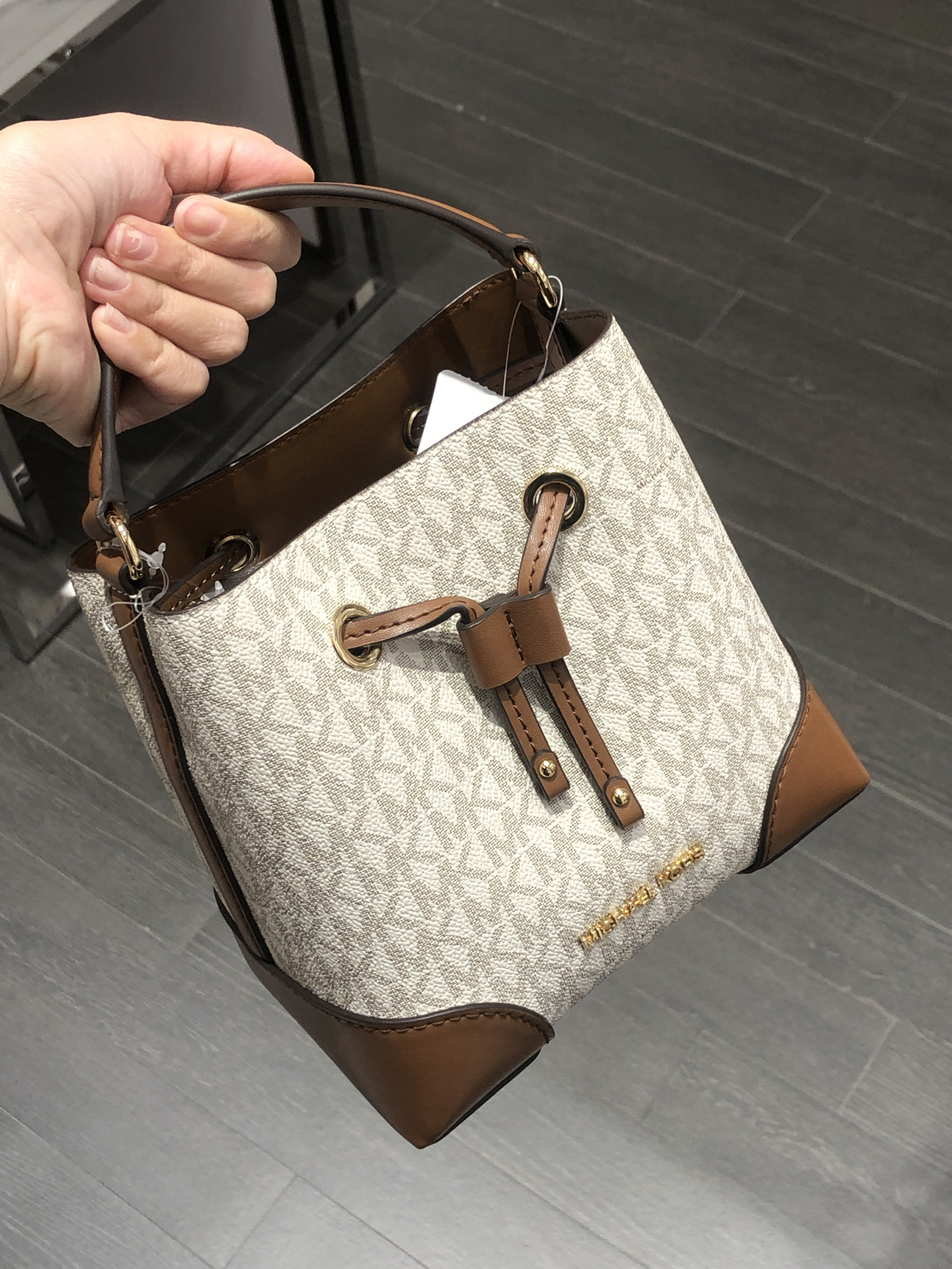 本篇笔记关联了Michael Kors Mercer 18 小号 经典老花涂层帆布抽绳开合单肩斜挎水桶包 白色拼棕色等商品,为用户提供真实的使用体验和购买参考。