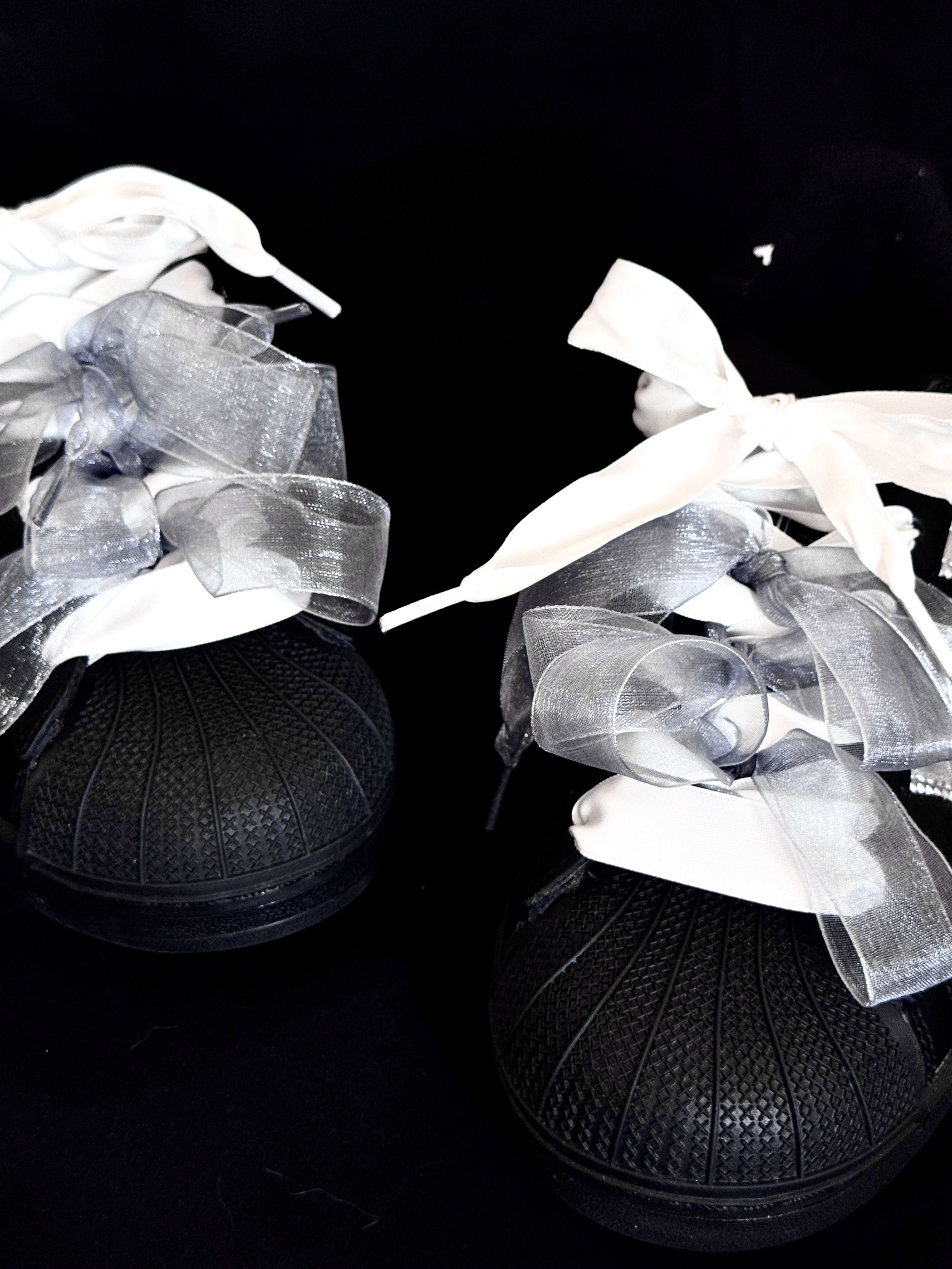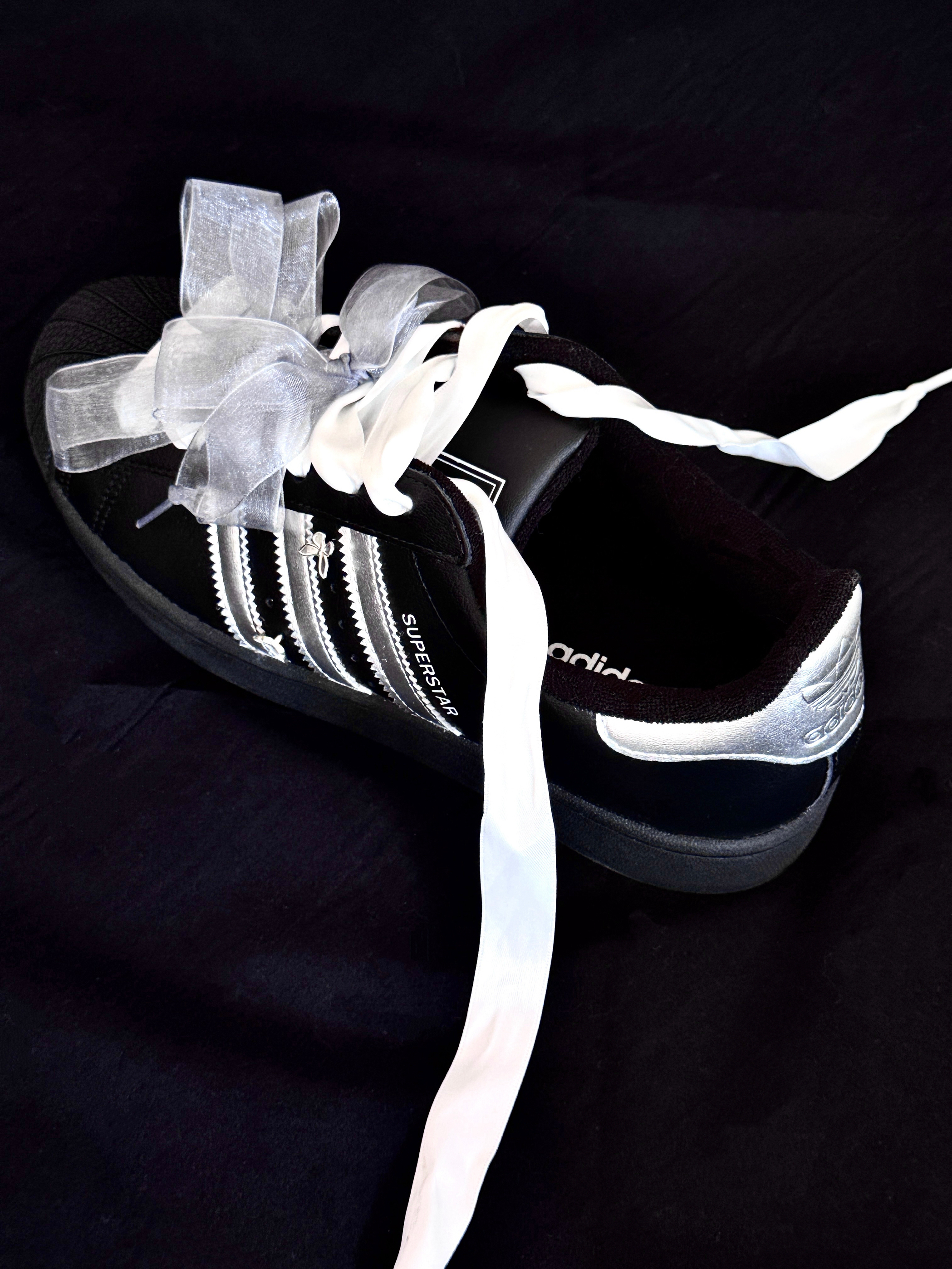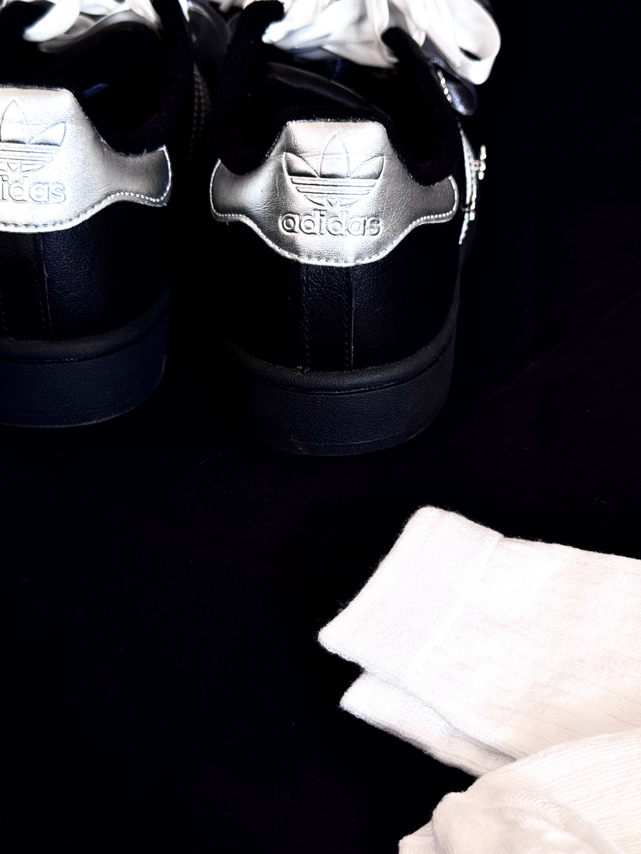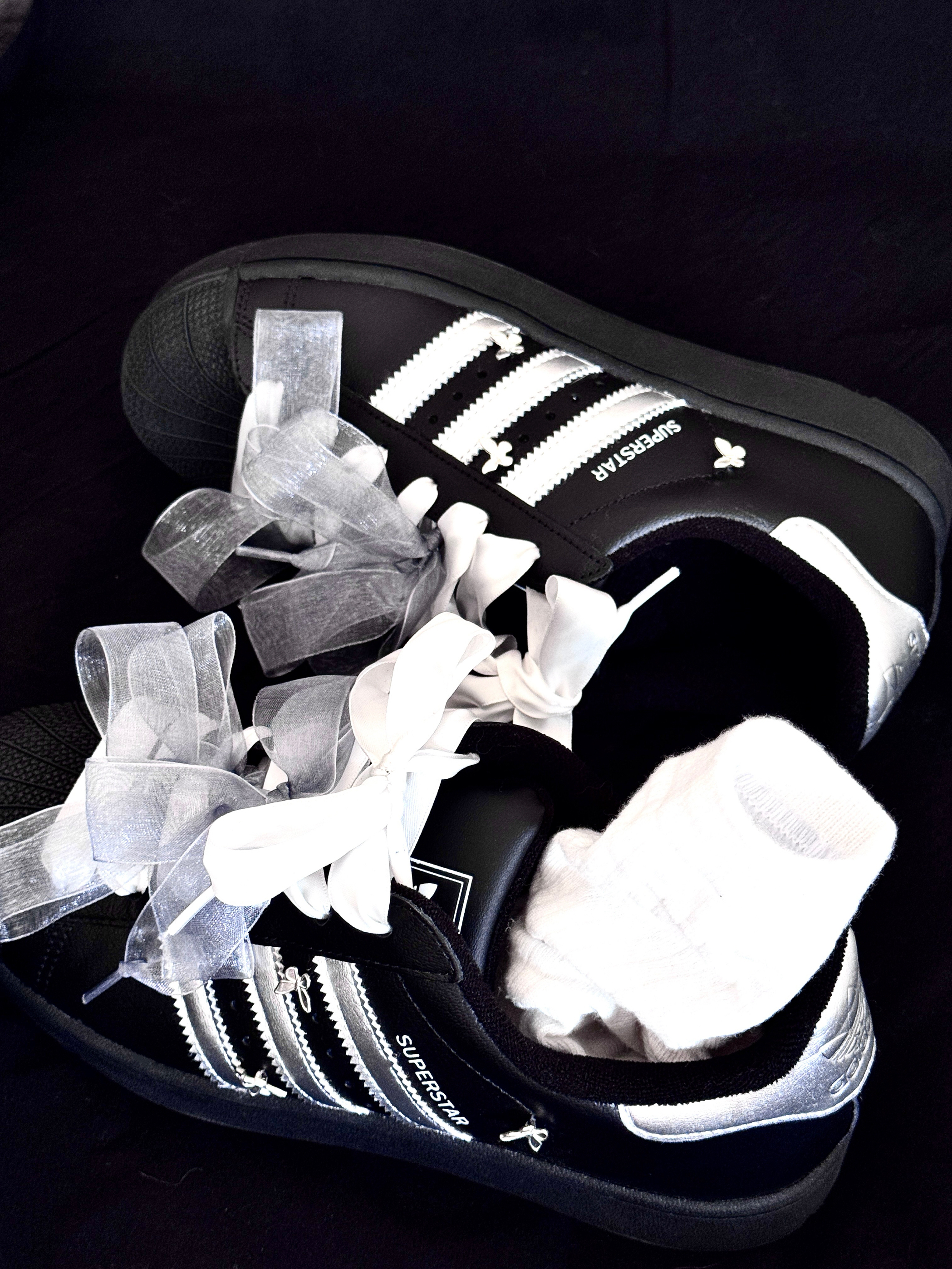 谁懂啊!刷到这双黑银阿迪直接移不开眼!双鞋带蝴蝶结也太会戳审美了吧,银边配黑色高级感直接拉满,穿牛仔裤搭卫衣秒变甜酷女孩,走路都忍不住多看脚两眼,这波入手真的血赚!