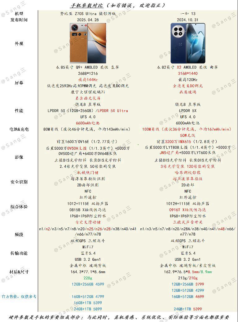 🛸手机对比——Z70S Ultra 摄影师版「对比」13🚁 ☞努比亚 Z70S Ultra 摄影师版☜ 直屏设计,配备更高刷新率的显示屏,实现真全面无孔屏体验,更高速的内存规格,更大容量的电池,以及更卓越的后置主摄像头,配备机械快门键和自定义滑动键,支持更多种的5G频段…… ☞一加 13☜ 曲面屏幕,采用更优质的屏幕材料和更高的分辨率显示,支持更先进的护眼调光技术,以及更耐用的盖板材质,更快速...