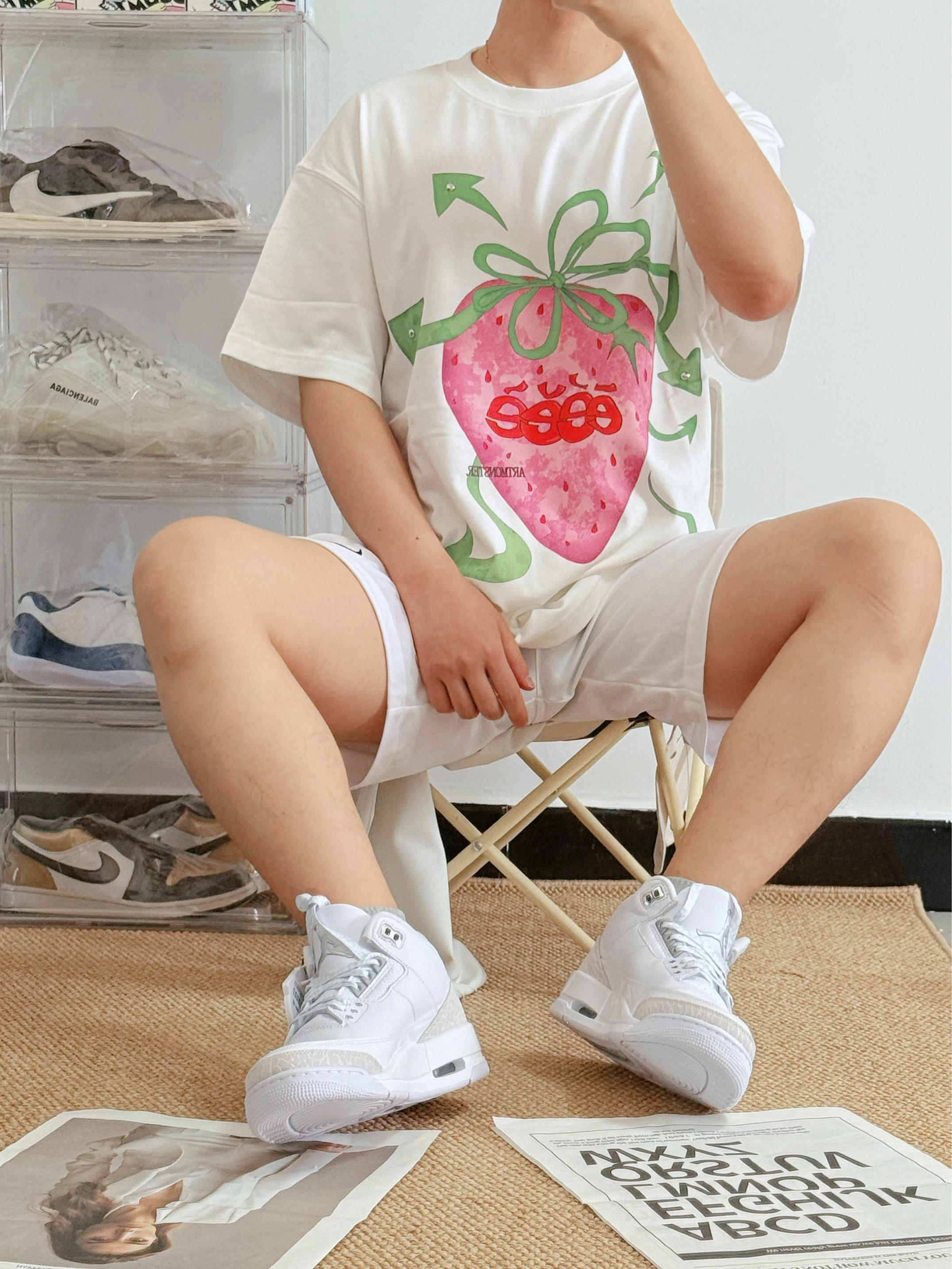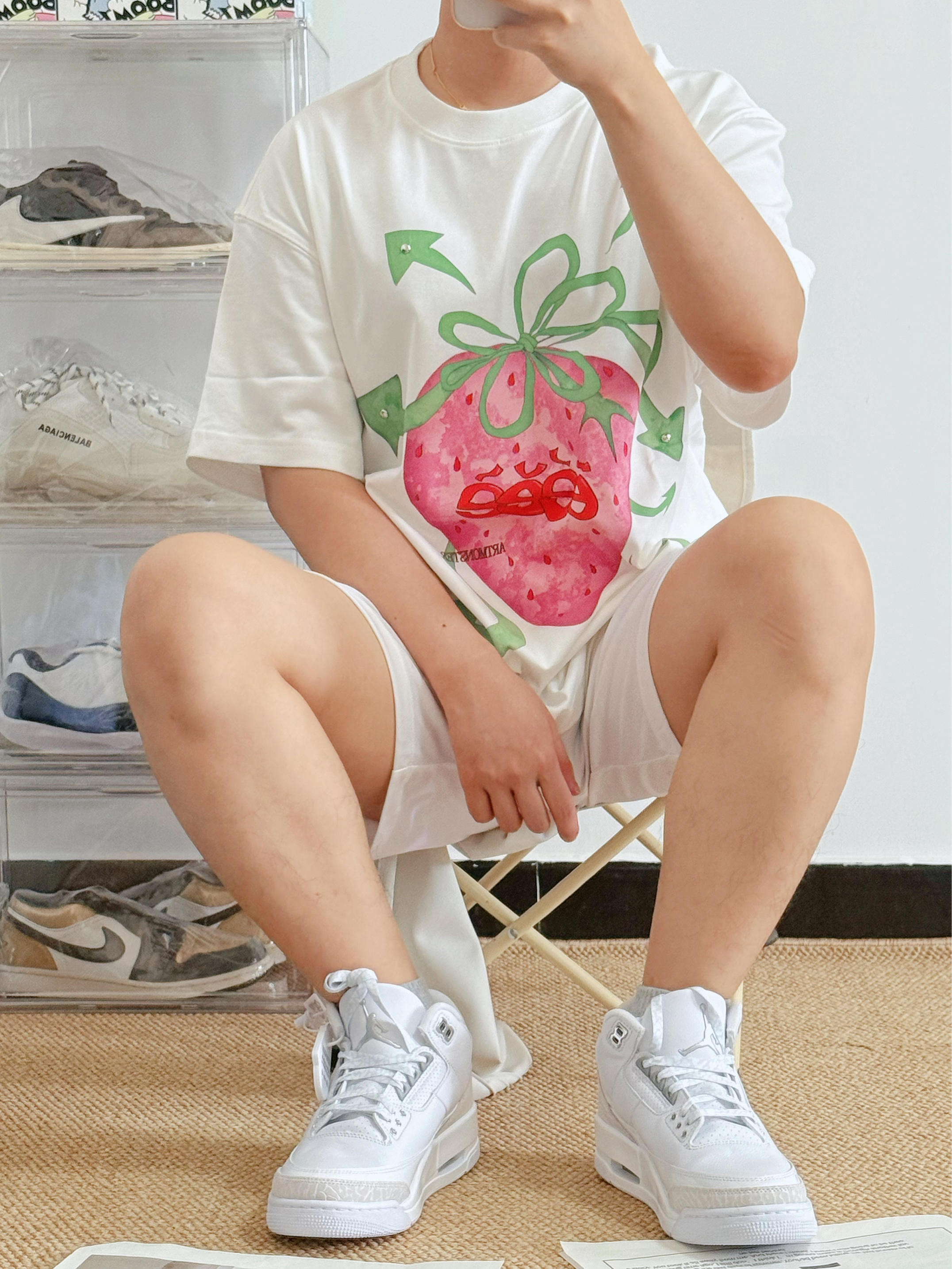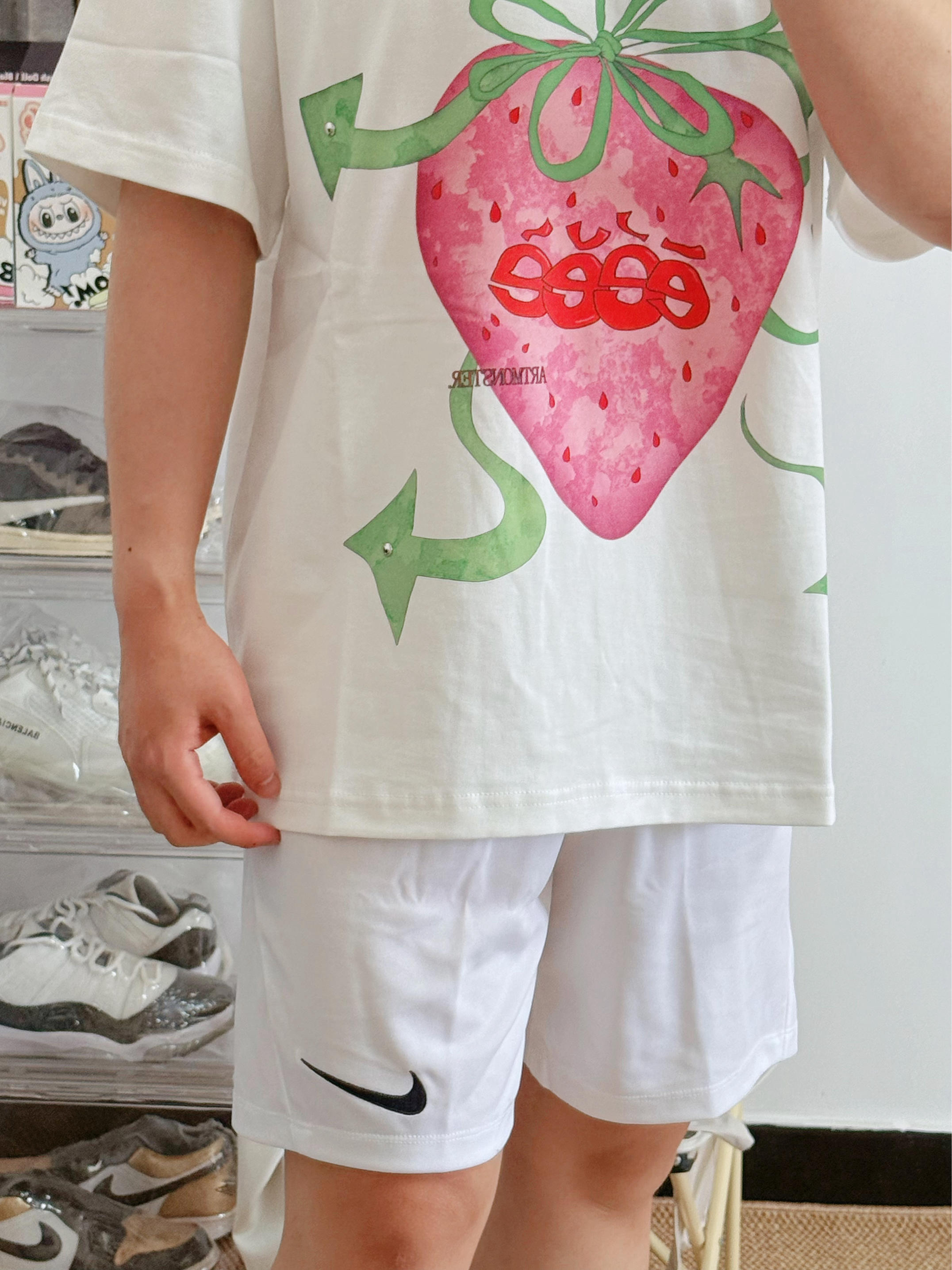 🌈 终于让我找到了这个小短袖嘞 好看好看 ˗ˋˏᰔᩚˎˊ˗ 🧥:eeeeArtmonster 🩳:Nike Drifit速干短裤 👟:AJ3 Pure Money 整体的细节还是蛮好的 正面草莓🍓的图案 红色➕绿色 色彩搭配很喜欢 克数还是蛮重的 洗过了 还没有图案脱落以及面料缩水的现象 材质比较亲肤 😁