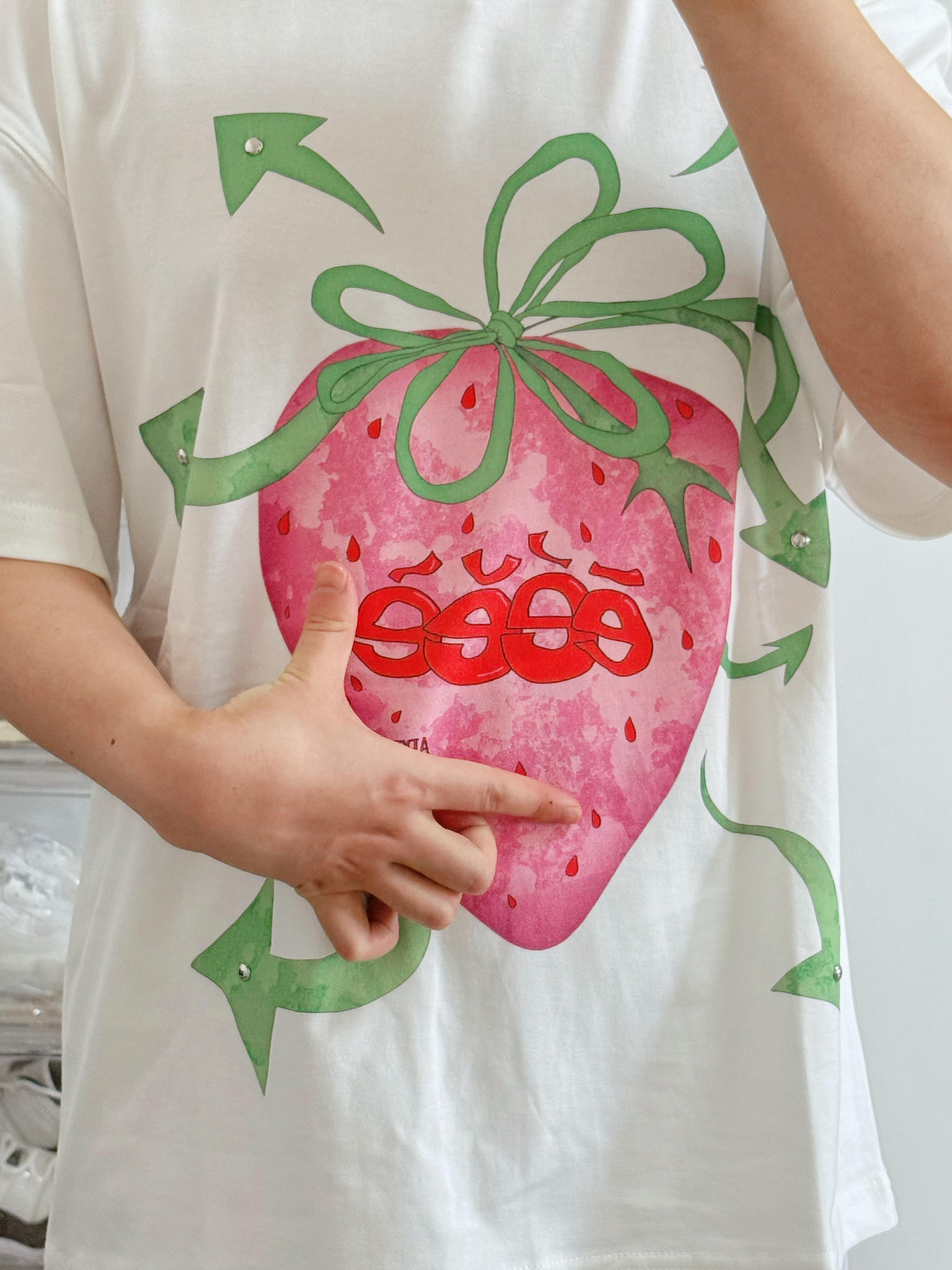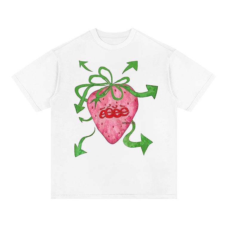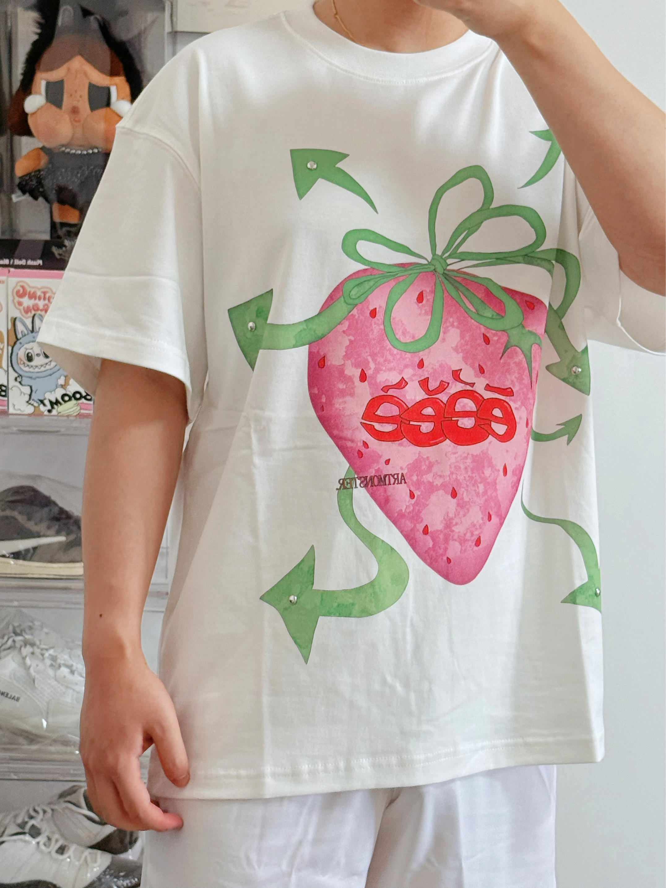 🌈 终于让我找到了这个小短袖嘞 好看好看 ˗ˋˏᰔᩚˎˊ˗ 🧥:eeeeArtmonster 🩳:Nike Drifit速干短裤 👟:AJ3 Pure Money 整体的细节还是蛮好的 正面草莓🍓的图案 红色➕绿色 色彩搭配很喜欢 克数还是蛮重的 洗过了 还没有图案脱落以及面料缩水的现象 材质比较亲肤 😁