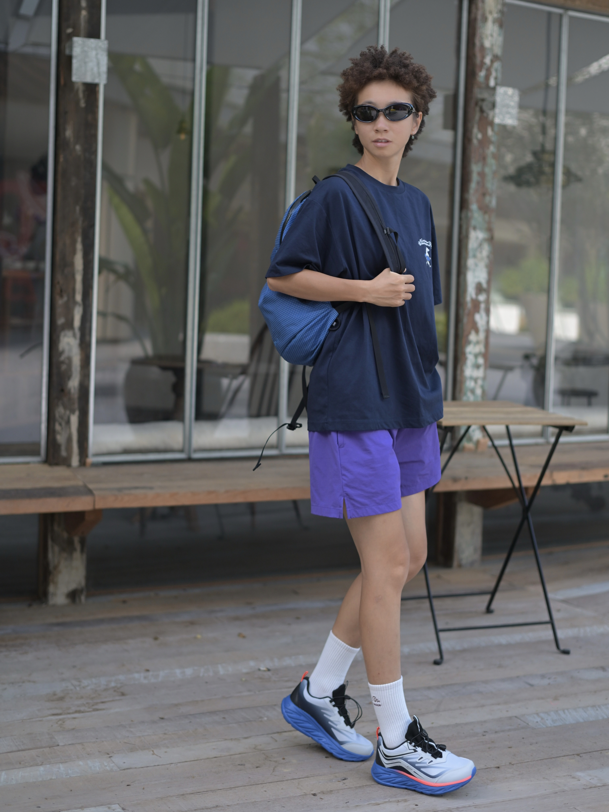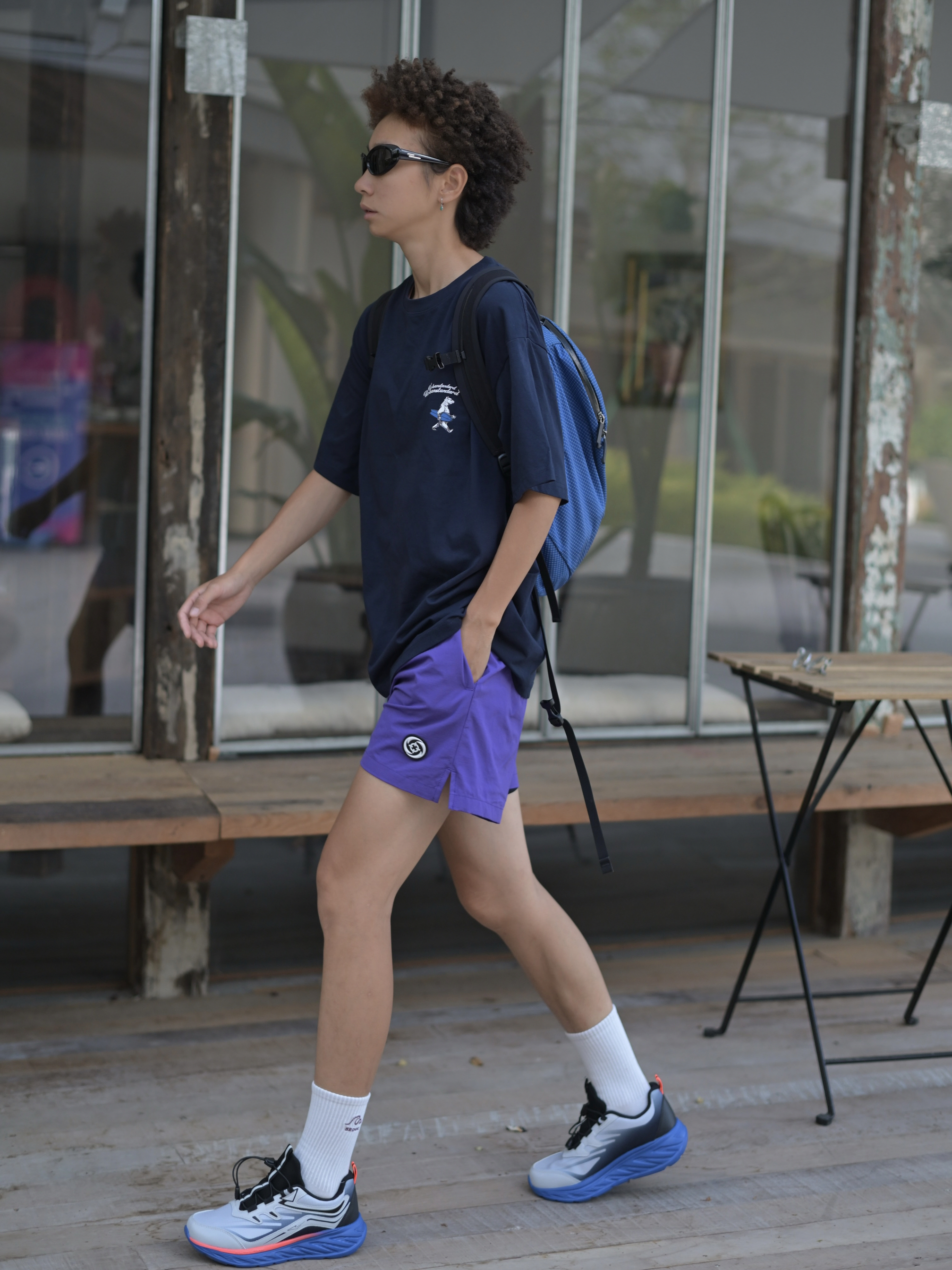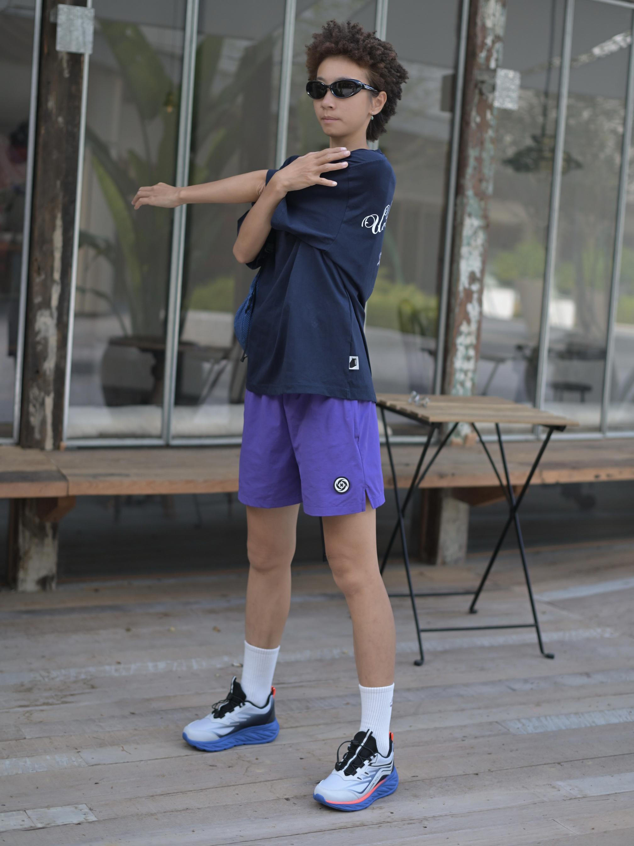 嘿,这是哇圆哇圆哒的穿搭频道🔥 168CM|55KG 👔:M 👖:m 👟:39码 今日份运动风穿搭来咯 上身蓝色系短袖 氛围感拉满 下半身搭配紫色哒短裤 穿上俺的运动鞋 Gogogo出发咯~