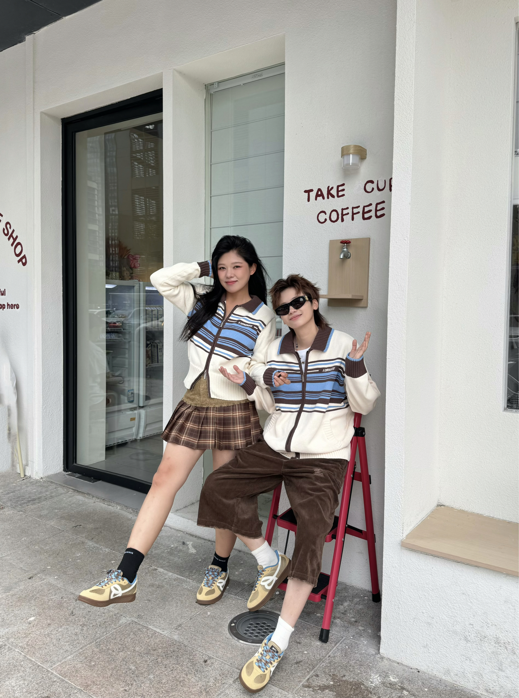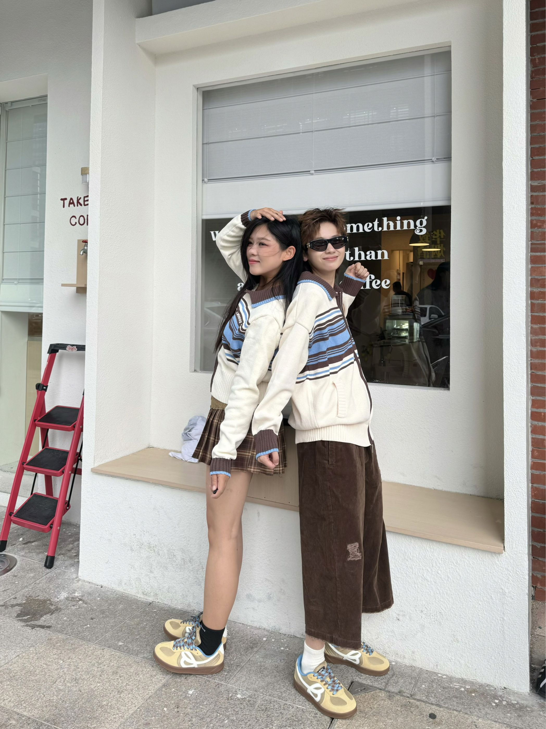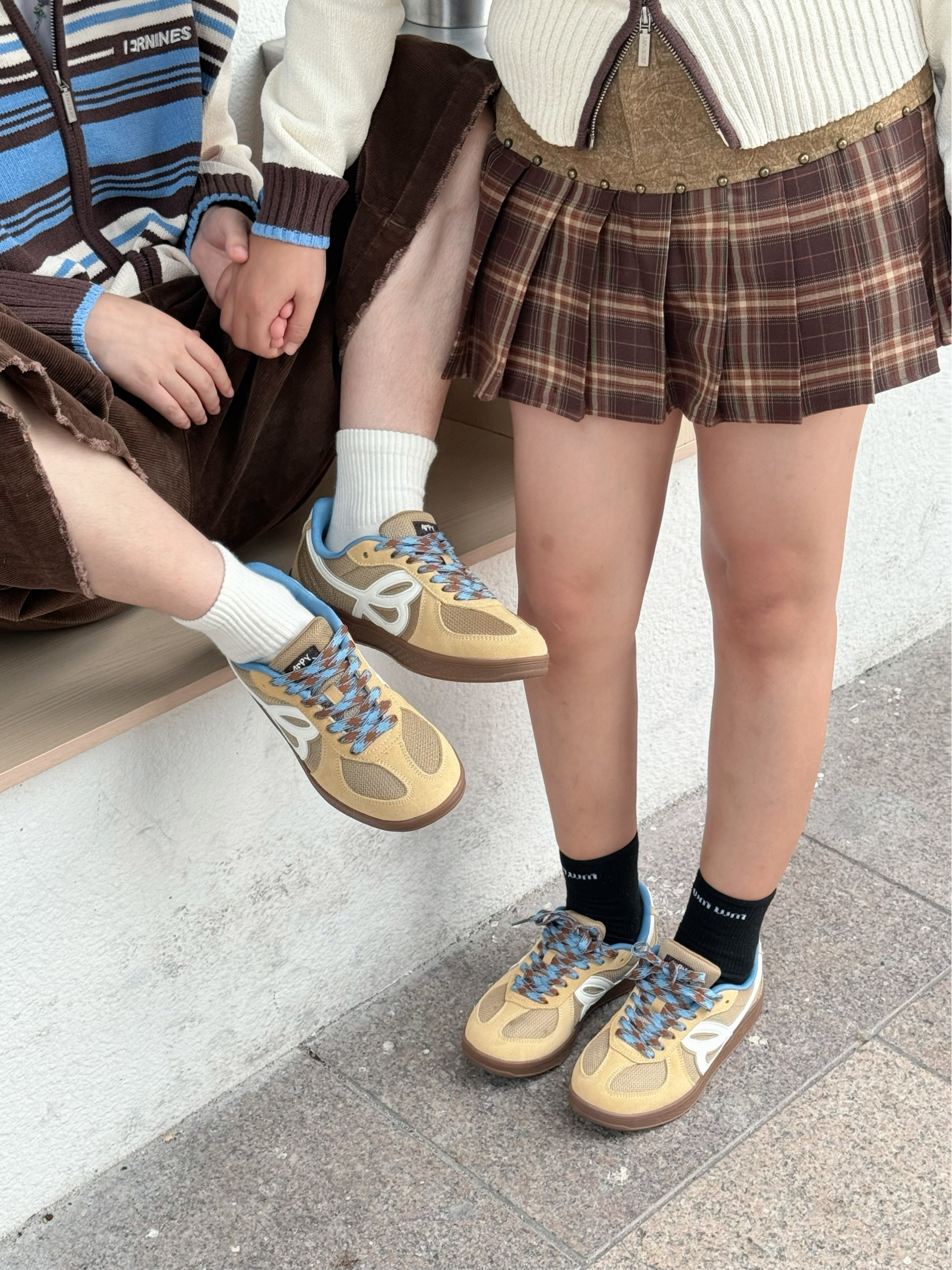 在美拉德的基础上加入点蓝黄的暖色调 就变成了琥珀流光风穿搭 今天来就浅浅搭配一套 上衣都选了同款的毛衣开衫 暖白色加上咖色和蓝色的条纹元素 清爽又百搭 搭配咖色元素下装和同款的德训鞋 蓝色鞋带和浅棕色搭配 上脚很有秋日氛围感 脚感又软又弹