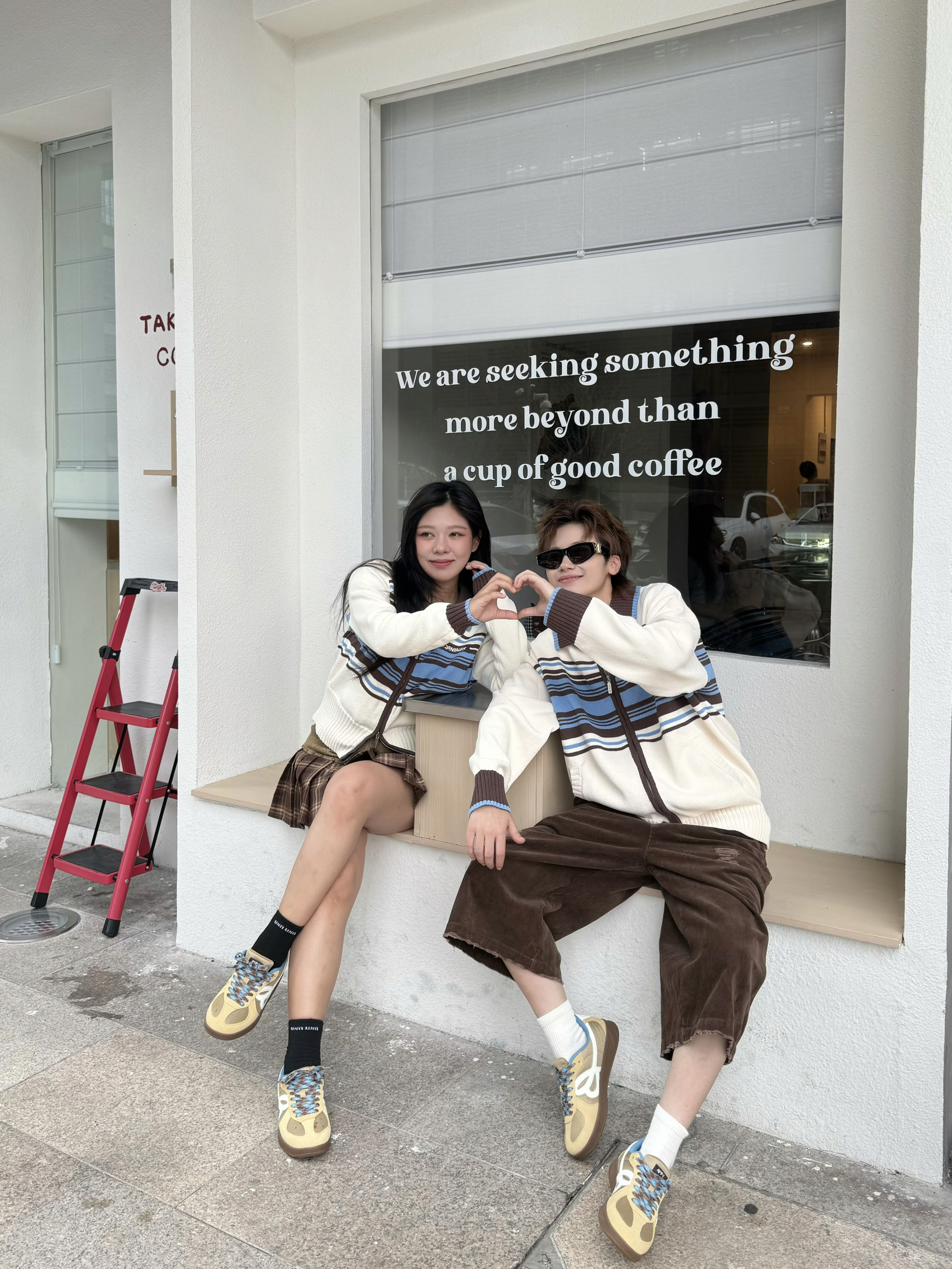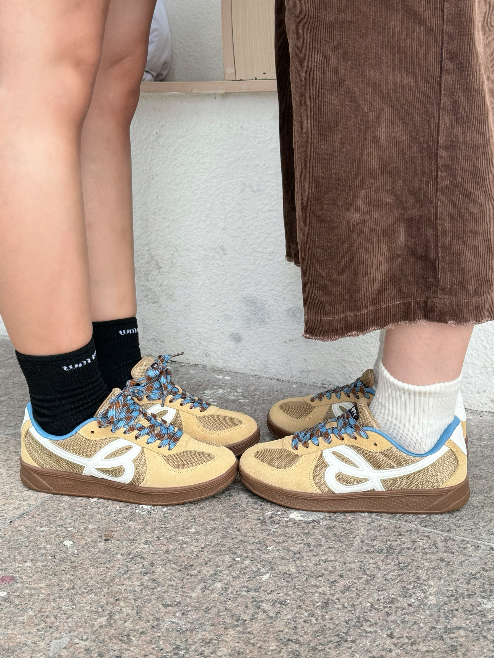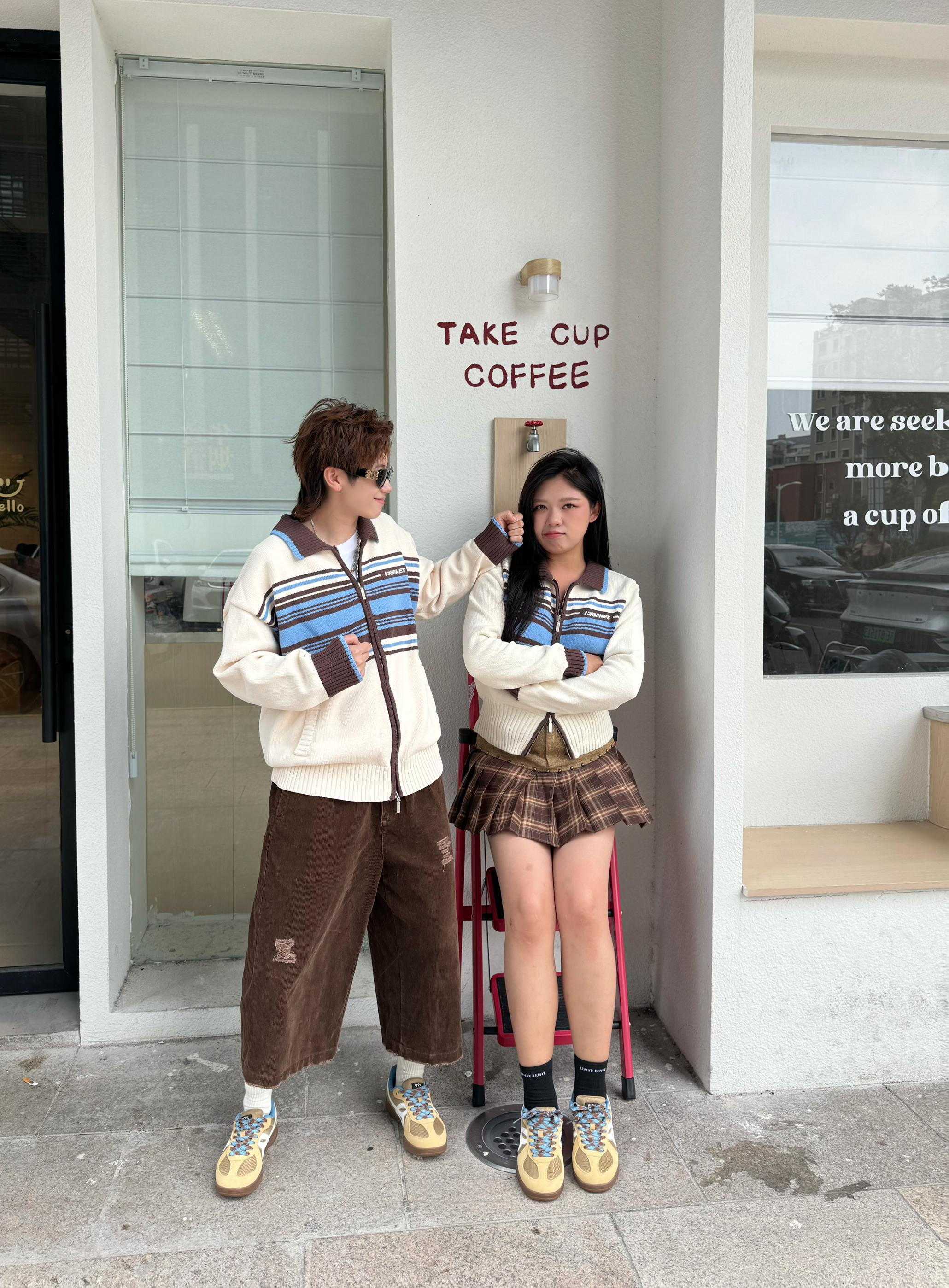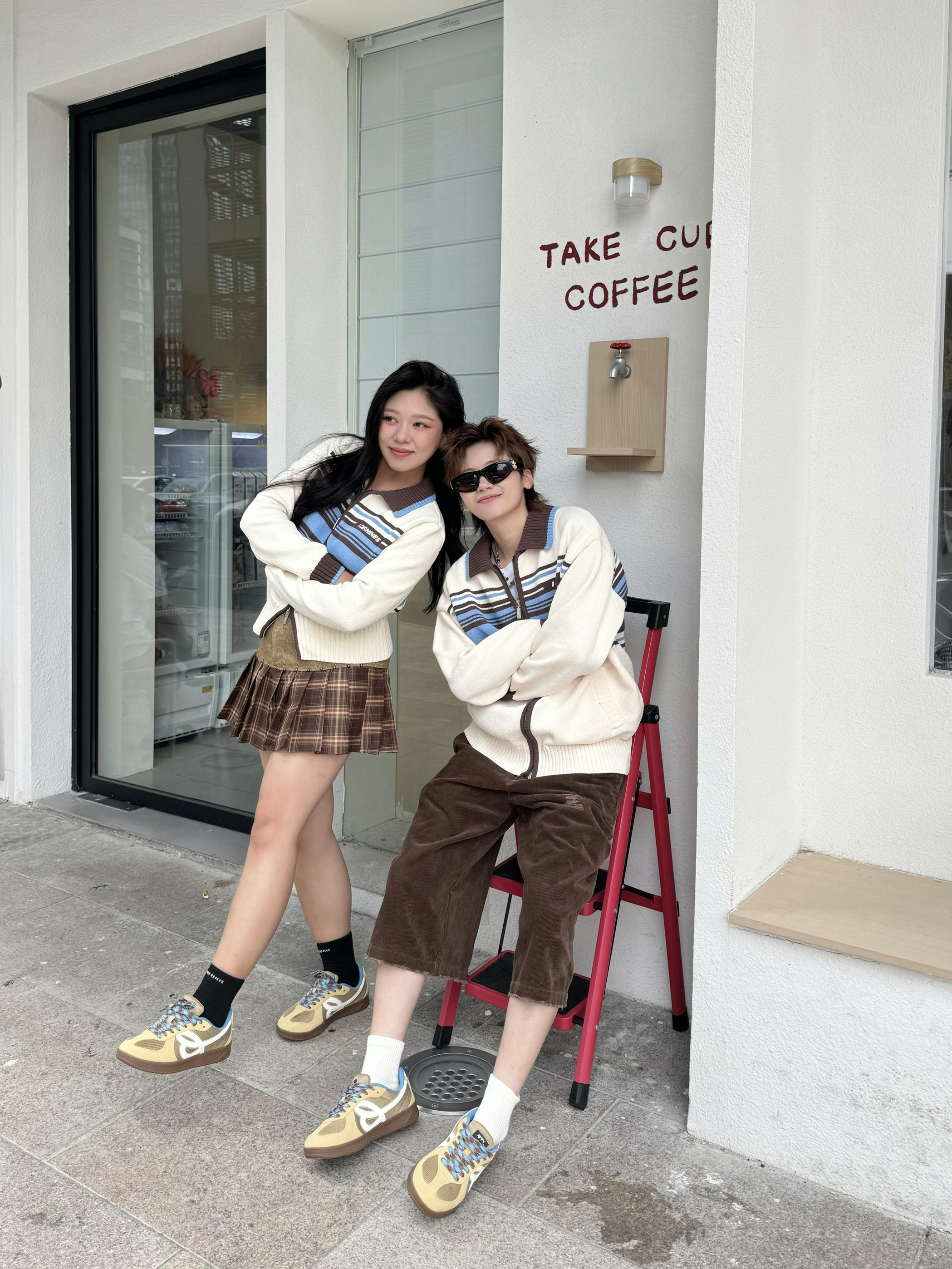 在美拉德的基础上加入点蓝黄的暖色调 就变成了琥珀流光风穿搭 今天来就浅浅搭配一套 上衣都选了同款的毛衣开衫 暖白色加上咖色和蓝色的条纹元素 清爽又百搭 搭配咖色元素下装和同款的德训鞋 蓝色鞋带和浅棕色搭配 上脚很有秋日氛围感 脚感又软又弹