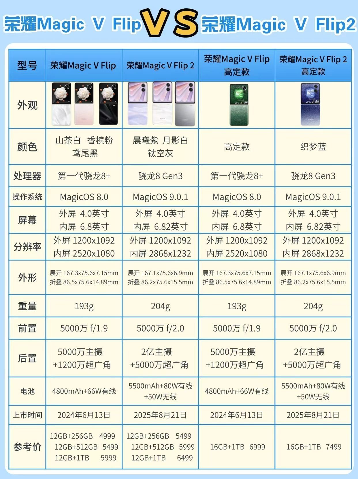 荣耀Magic V Flip VS Magic V Flip2 一篇看懂到底差在哪! 👀 还在纠结要不要加钱冲新款?直接把参数、体验、价格一次说清楚! —— 01 一句话总结 —— Magic V Flip:轻薄+性价比,预算党冲! Magic V Flip2:性能影像续航全拉满,一步到位的“小折叠机皇”。 —— 02 参数速览 —— (左旧右新) 📱外观&手感 193 g / 14.9 mm →...