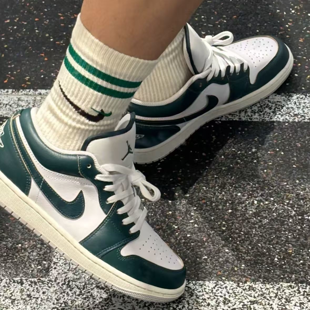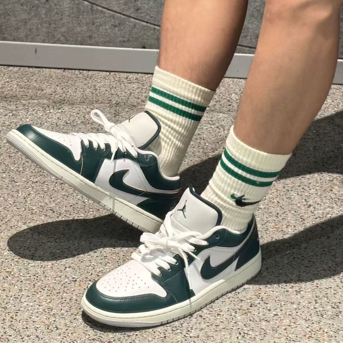 在千篇一律的小白鞋里,这双AJ1 Low墨绿色直接杀出重围!复古暗调的绿不挑肤色,上脚自带“生人勿近”的酷感,又藏着恰到好处的精致感。 颜值党必看亮点 - 配色一绝:不是亮眼的荧光绿,是深到发暗的墨绿,像把森林的静谧穿在脚上,灯光下会泛出细腻的光泽,低调却超有辨识度。 - 经典永不过时:AJ1 Low的低帮鞋型利落显腿长,鞋头的圆润线条不挑脚型,鞋舌的飞人标和侧面的Swoosh低调呼应,细...
