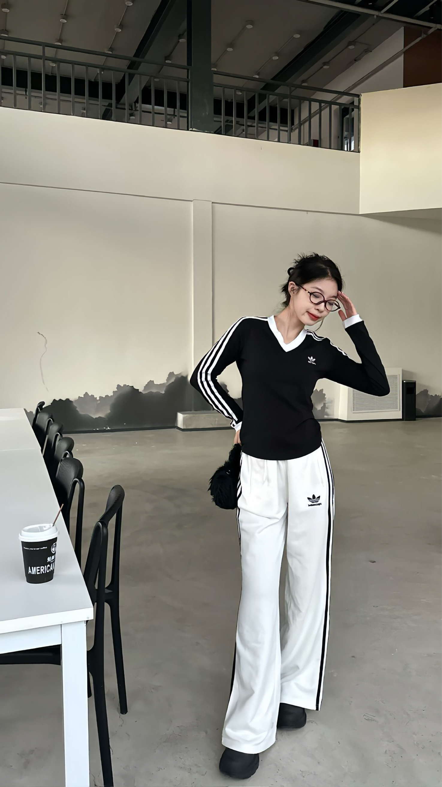 谁懂啊!三叶草这套穿搭鲨疯了💥 经典黑白配,永远不出错的松弛感公式 短款V领上衣 + 阔腿裤,拉比例一绝,腿长直接两米八 德训鞋和棒球帽一搭,美式复古拿捏🏈 日常出街、运动健身都能穿,懒人福音! 被问爆的三叶草穿搭,照搬就赢麻~
