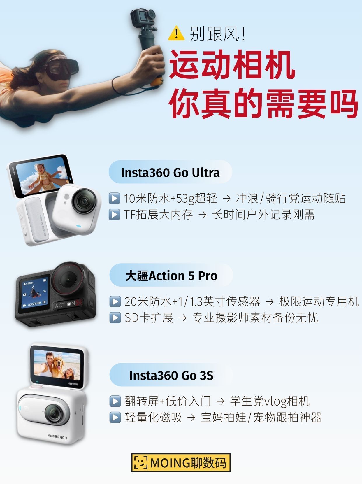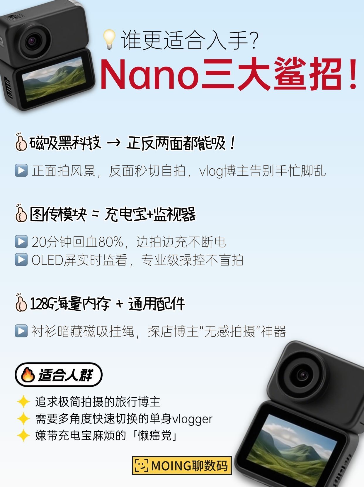 ✨ 一句话总结 : 1️⃣ 要磁吸自由 → 选Nano 2️⃣ 要极限防水 → 冲Action 5 Pro 3️⃣ 要性价比 → Go 3S真香 4️⃣ 要极致轻便 → Go Ultra无感 🔍 参数党速看 大疆Nano (9.10发布): 🧲 正反磁吸黑科技!自拍他拍秒切换 ⚡️ 20分钟快充80% → 图传模块还能当充电宝 🎮 OLED屏精准操控 → 告别盲拍焦虑 🎯 真实需求对号入座...