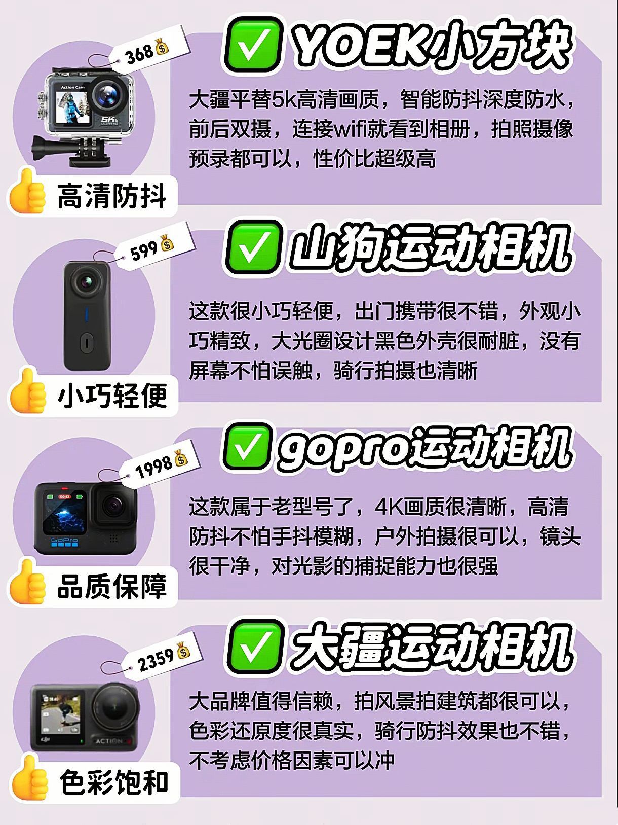 最近被骑行和户外拍摄种草了运动相机 挖到几款性价比很顶的机子✨ YOEK小方块真的惊喜!三百多块直接拿下5K高清+防抖 水下拍摄和预录功能都很稳 WiFi传图超方便 画质不输大疆平替👌 山狗这款超轻巧 塞口袋无压力 无屏防误触 骑行记录神器 预算有限的闭眼冲! GoPro和大疆依旧能打 老款GoPro性价比很高 大疆色彩还原度yyds(就是预算得加码) 谁懂啊 用合适的设备记...