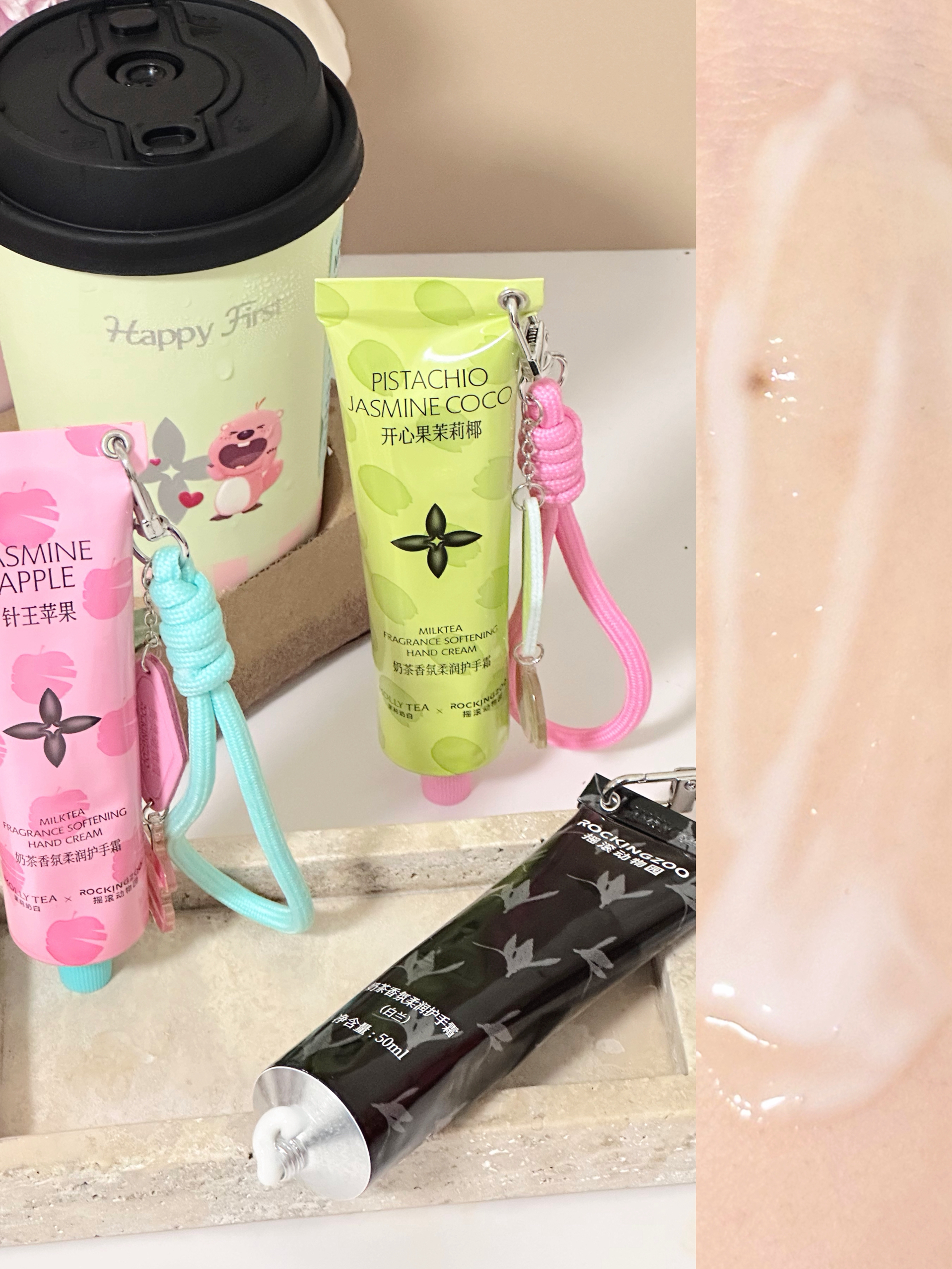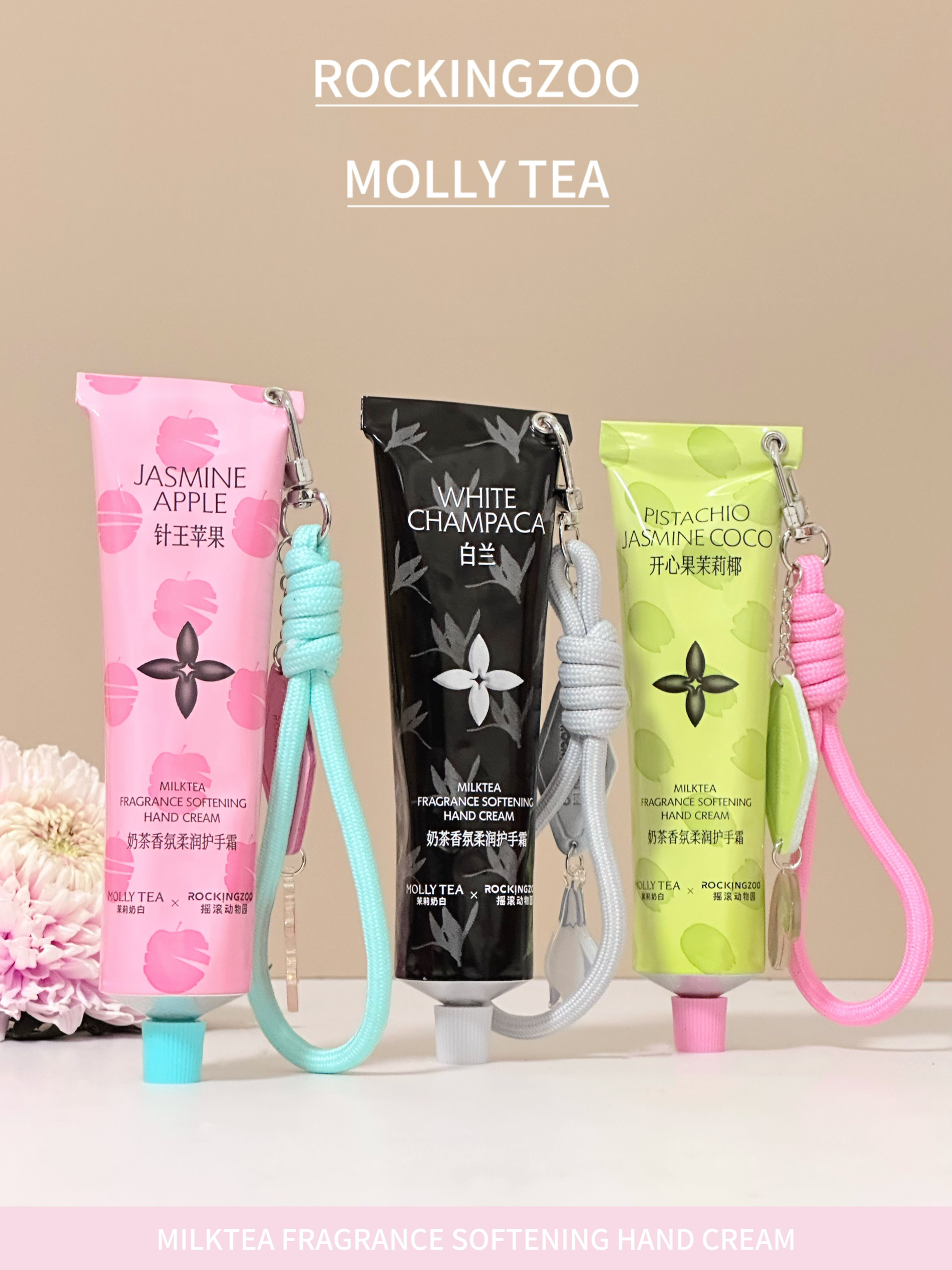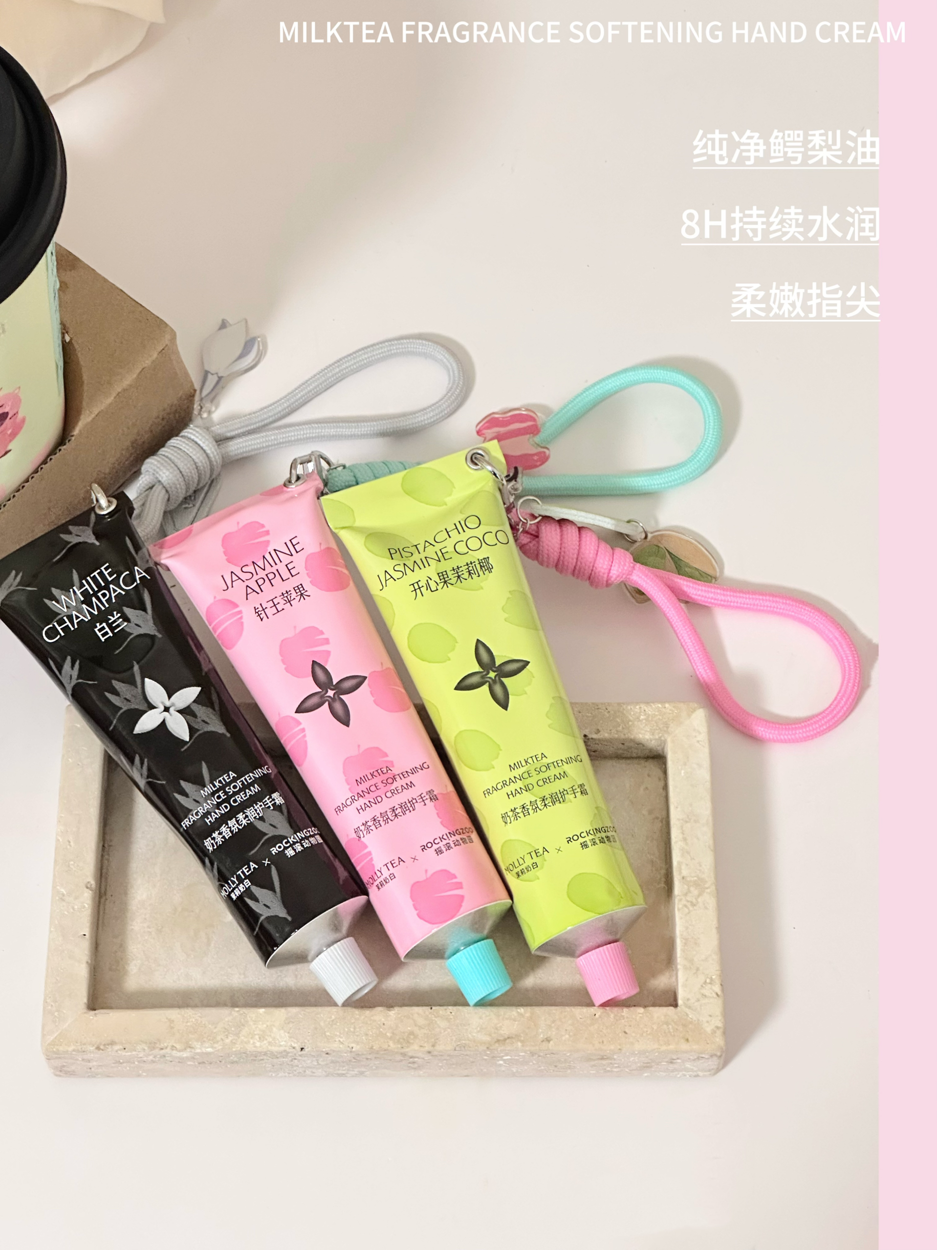 摇滚动物园这次真的疯了! 和茉莉奶白偷偷把店里最抢手的三款奶茶香味直接灌进了护手霜里,我当场被香到失语! - 🍏 针王苹果 冰镇青苹果的脆响混着绿茶的清澈,铃兰和香柠檬把夏日月光碾成碎屑,落在手腕 🥥 开心果茉莉椰 开心果奶盖与茉莉先闯进鼻腔,椰奶的暖甜紧随其后,像把午后的沙滩折叠进外套口袋 🍵白兰 白兰+龙井的中式留白,雪松尾调像暮色里最后一页经文,越闻越静的东方侘寂 - 挂链设计可以直接把护手...