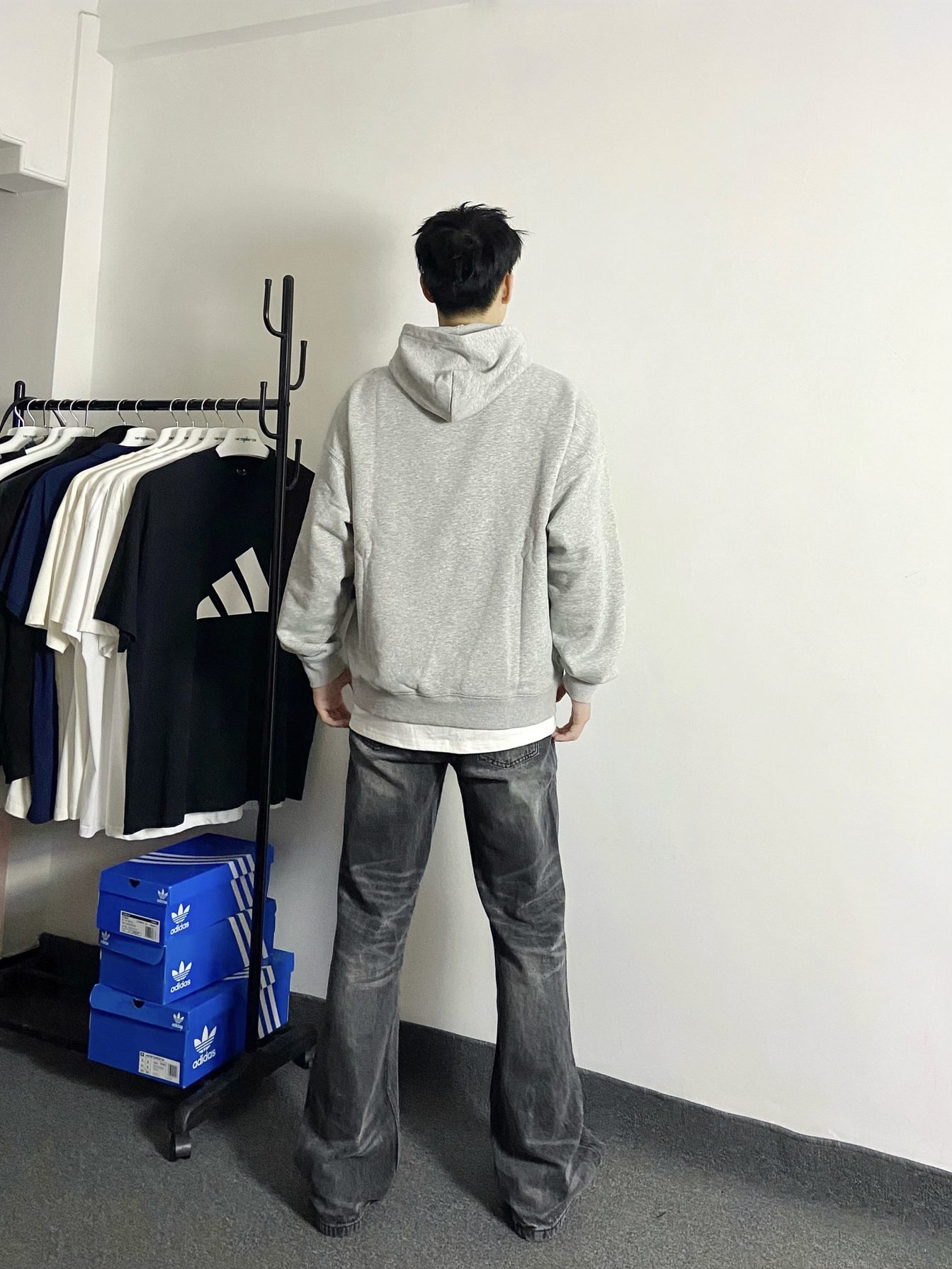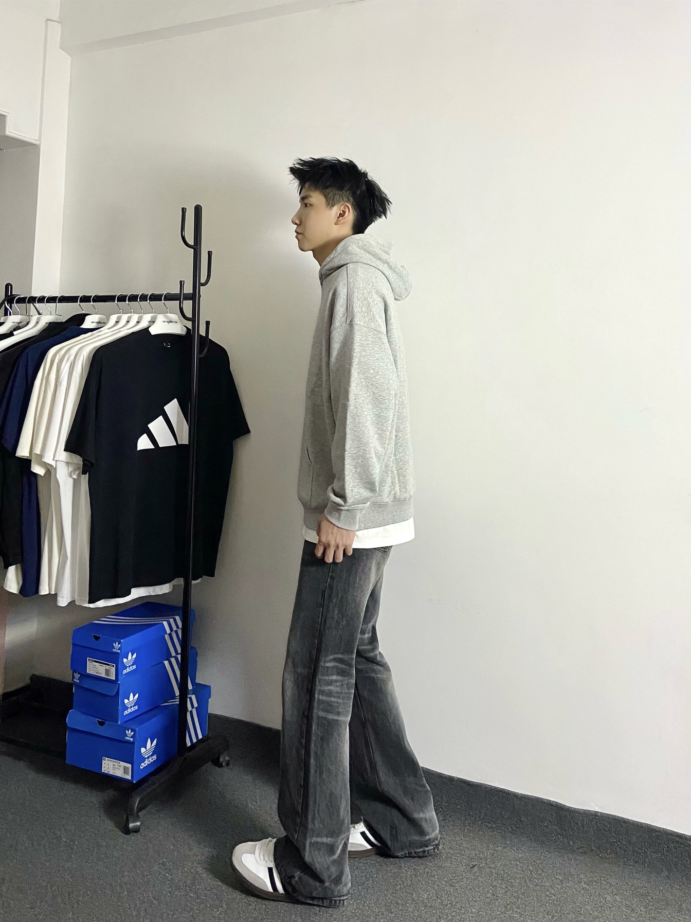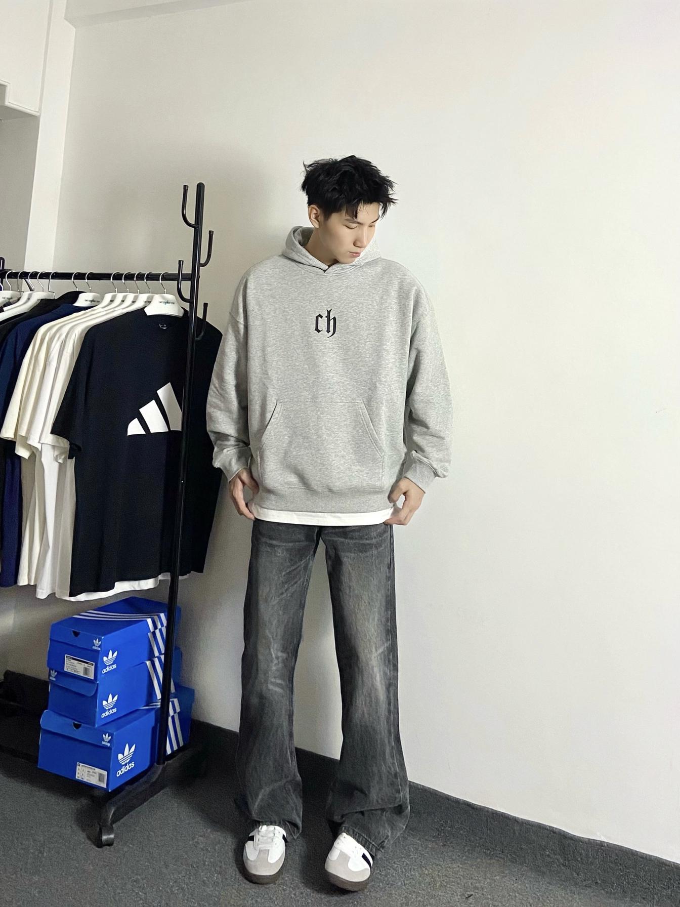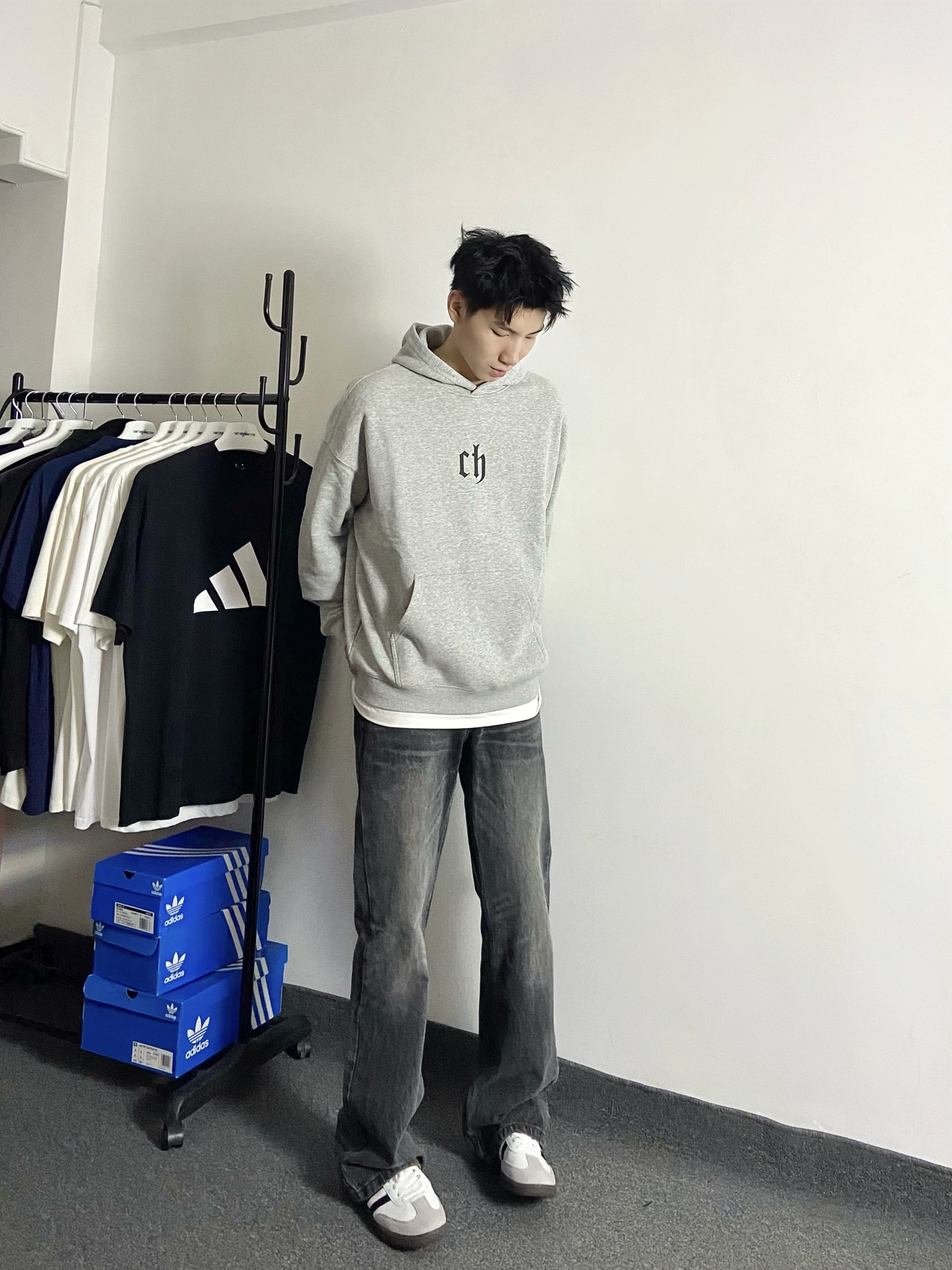 身高|体重:181|130 今日份穿搭: 👕上衣搭配 CHINISM 基础款字母印花灰色连帽卫衣 简约的Logo设计上身高级感满满,内搭白色打底 👖裤子搭配一件水洗灰色牛仔裤,版型修身 👟鞋子来一双Cleanfit首选鞋Samba 一套搭配下来确实很帅,男女均可驾驭!