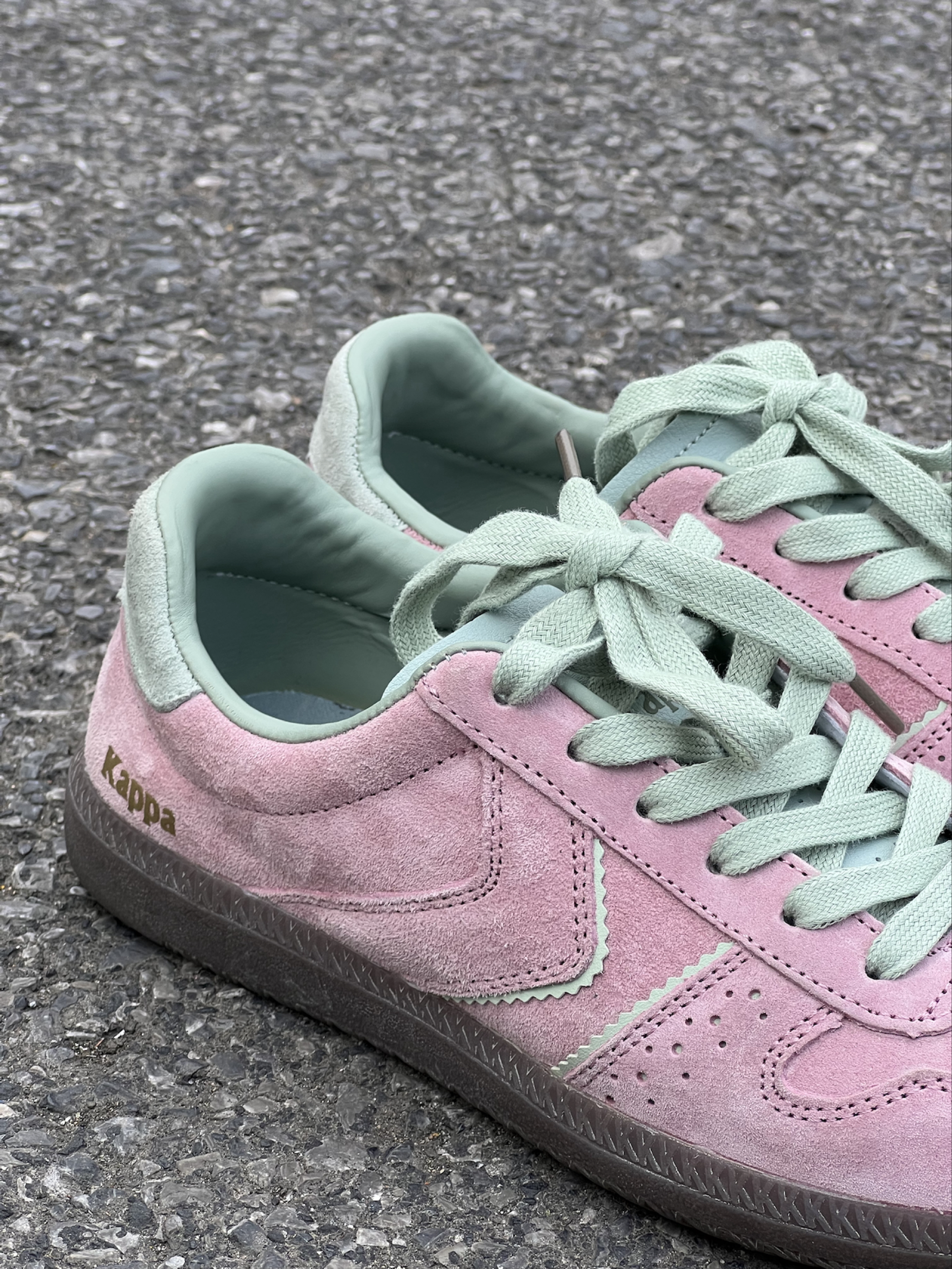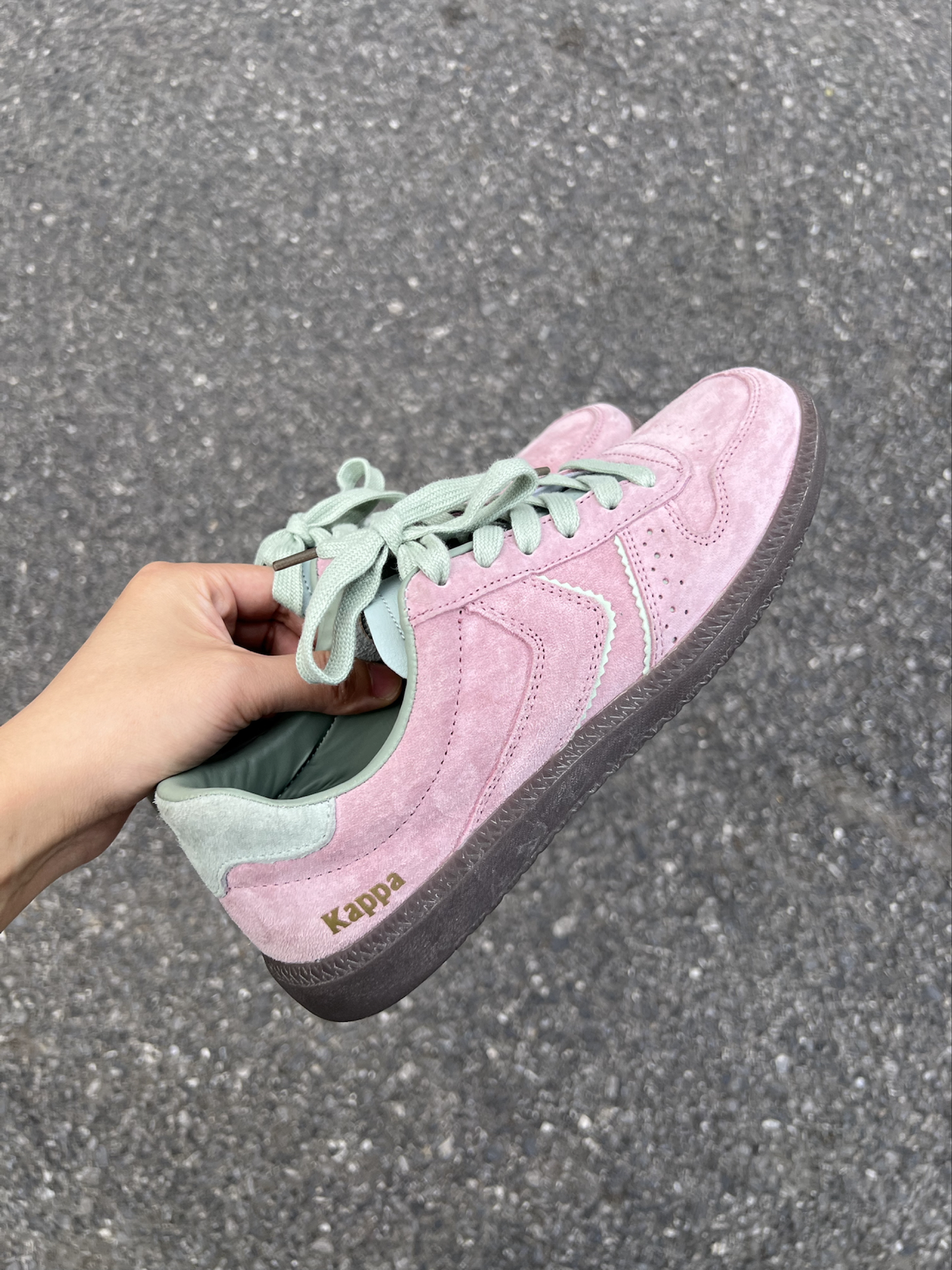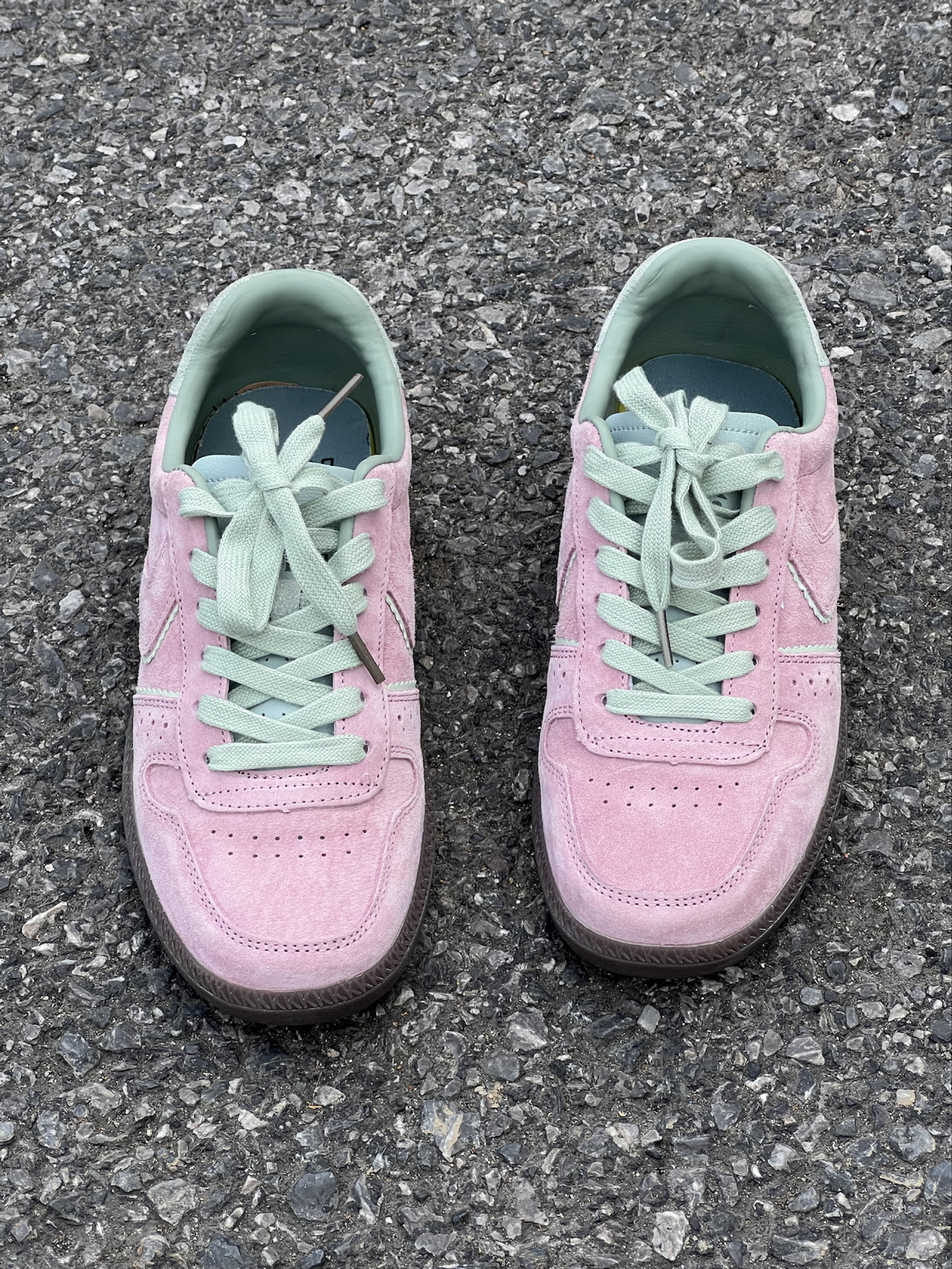 嘿嘿后悔为什么这么晚才发现小粉德训鞋 粉绿💗🟢 果然很搭!是属于春天的鞋子! 首先它超级轻,皮子特别软!质感很好走路很轻便又百搭! 舒服是最重要的!其次这个颜色饱和度不是很高的艳粉,特别好看,麂皮超级有质感,刚开始还担心会不会不耐脏,现在穿了一段时间发现比一般粉色耐脏,脏了有一种灰粉感很高级!粉绿配色真的绝绝子而且不显脚大 缺点是反口里(鞋内的绿色皮质部分)会掉皮… 图4中下面👇的那只鞋带附近的白...