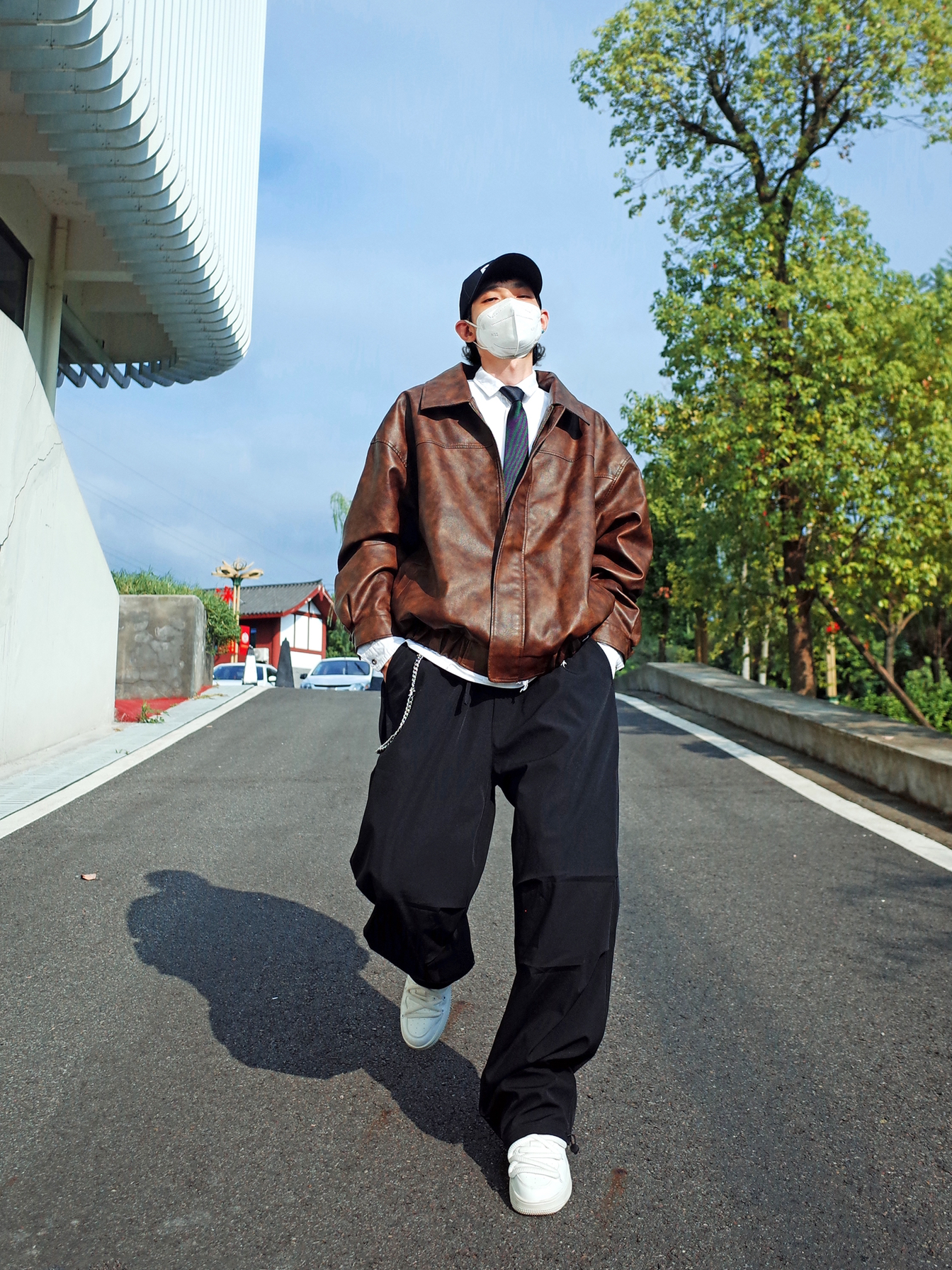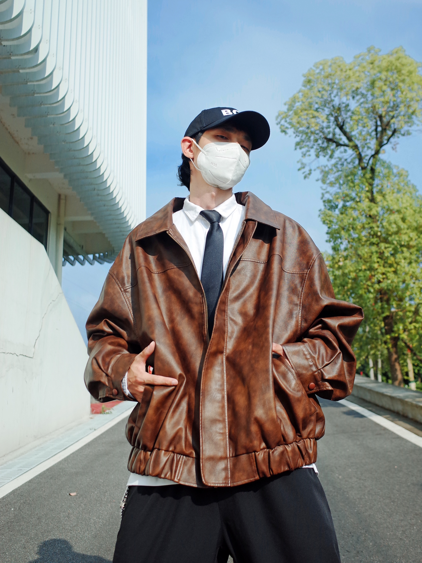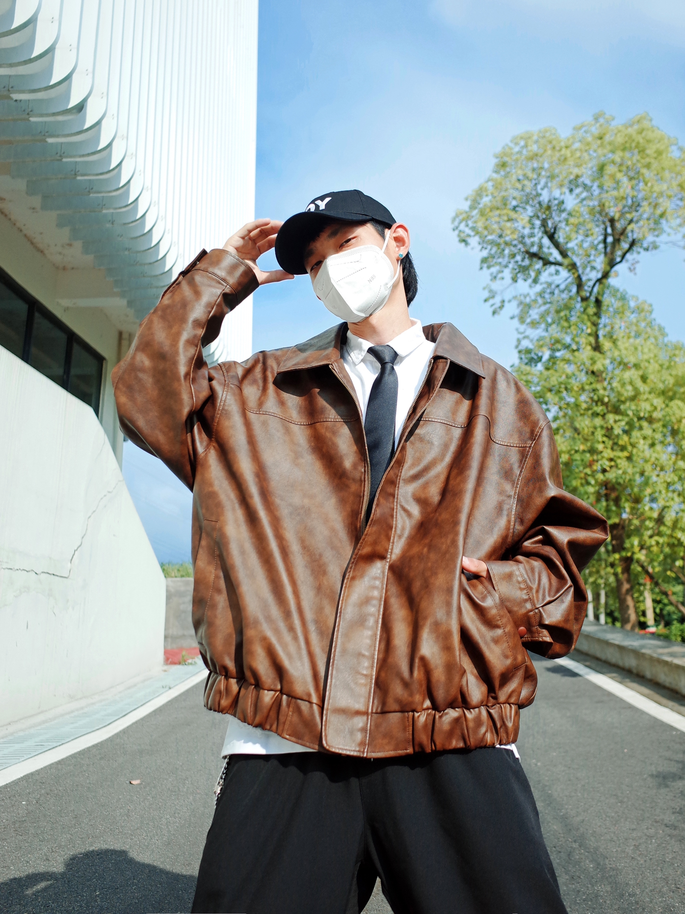 又到了可以穿夹克的季节啦🍂 🟤咖色夹克还是挺复古的~ 搭配一条黑色工装裤, ↕️一身宽松的版型,自带松弛感✨ 内搭白色衬衫和黑领带,叠穿出层次, 压低鸭舌帽,走出叛逆的步伐👀
