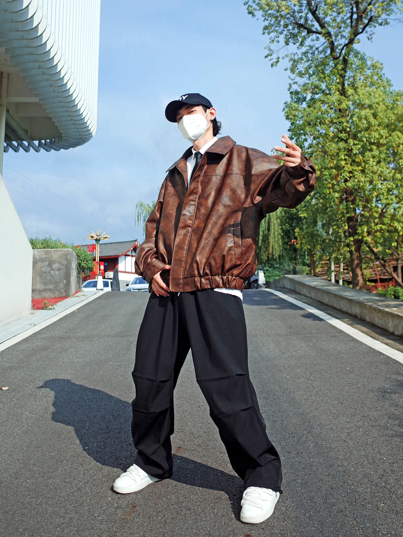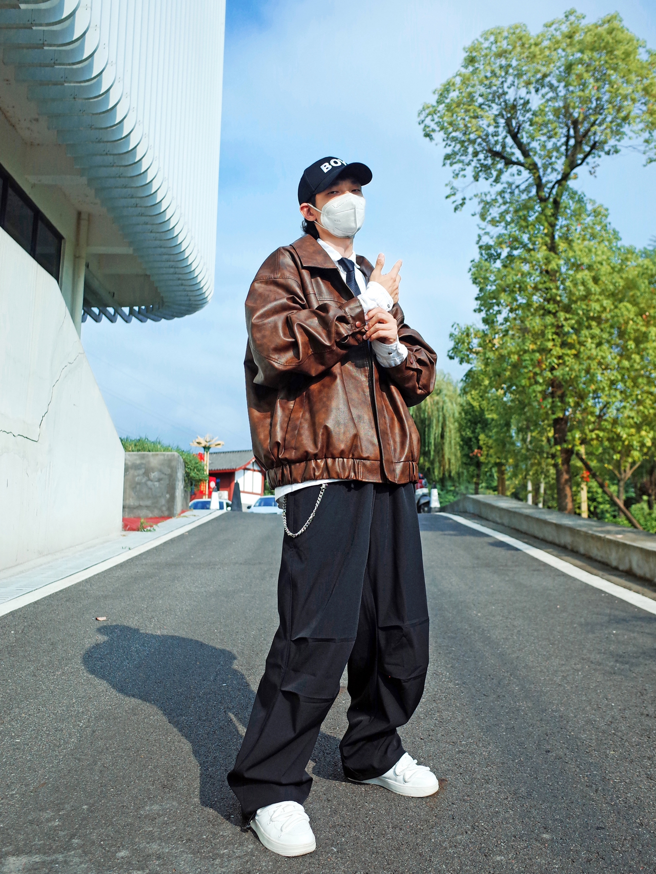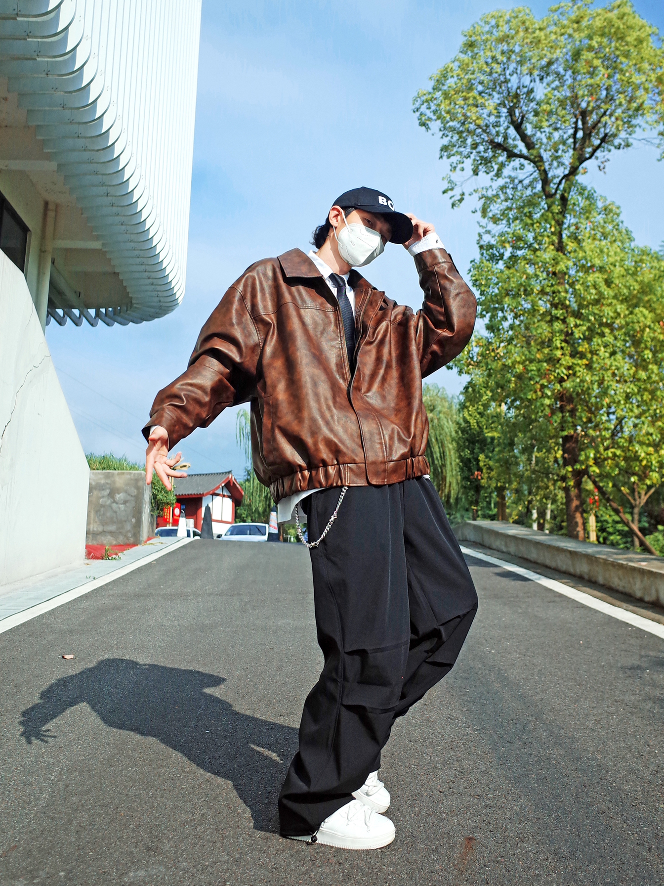 又到了可以穿夹克的季节啦🍂 🟤咖色夹克还是挺复古的~ 搭配一条黑色工装裤, ↕️一身宽松的版型,自带松弛感✨ 内搭白色衬衫和黑领带,叠穿出层次, 压低鸭舌帽,走出叛逆的步伐👀