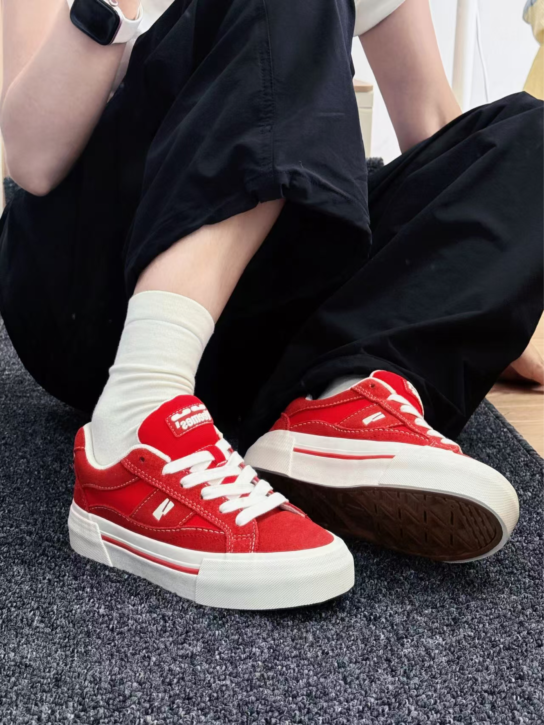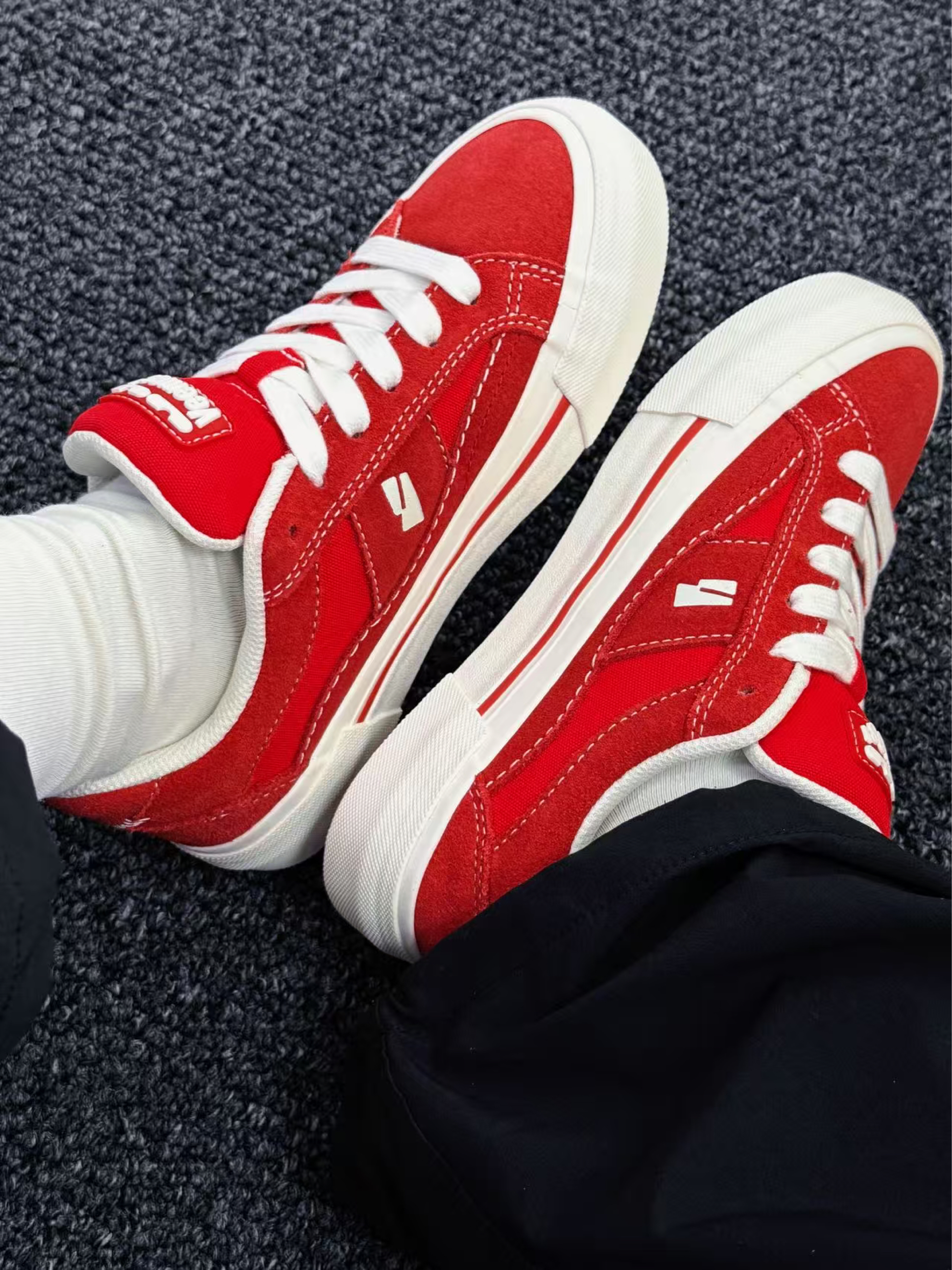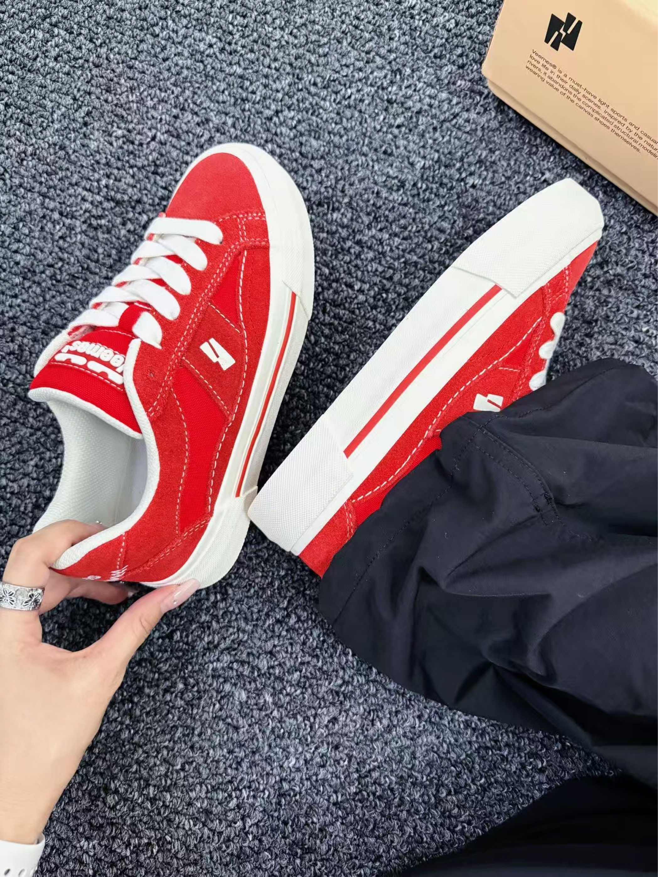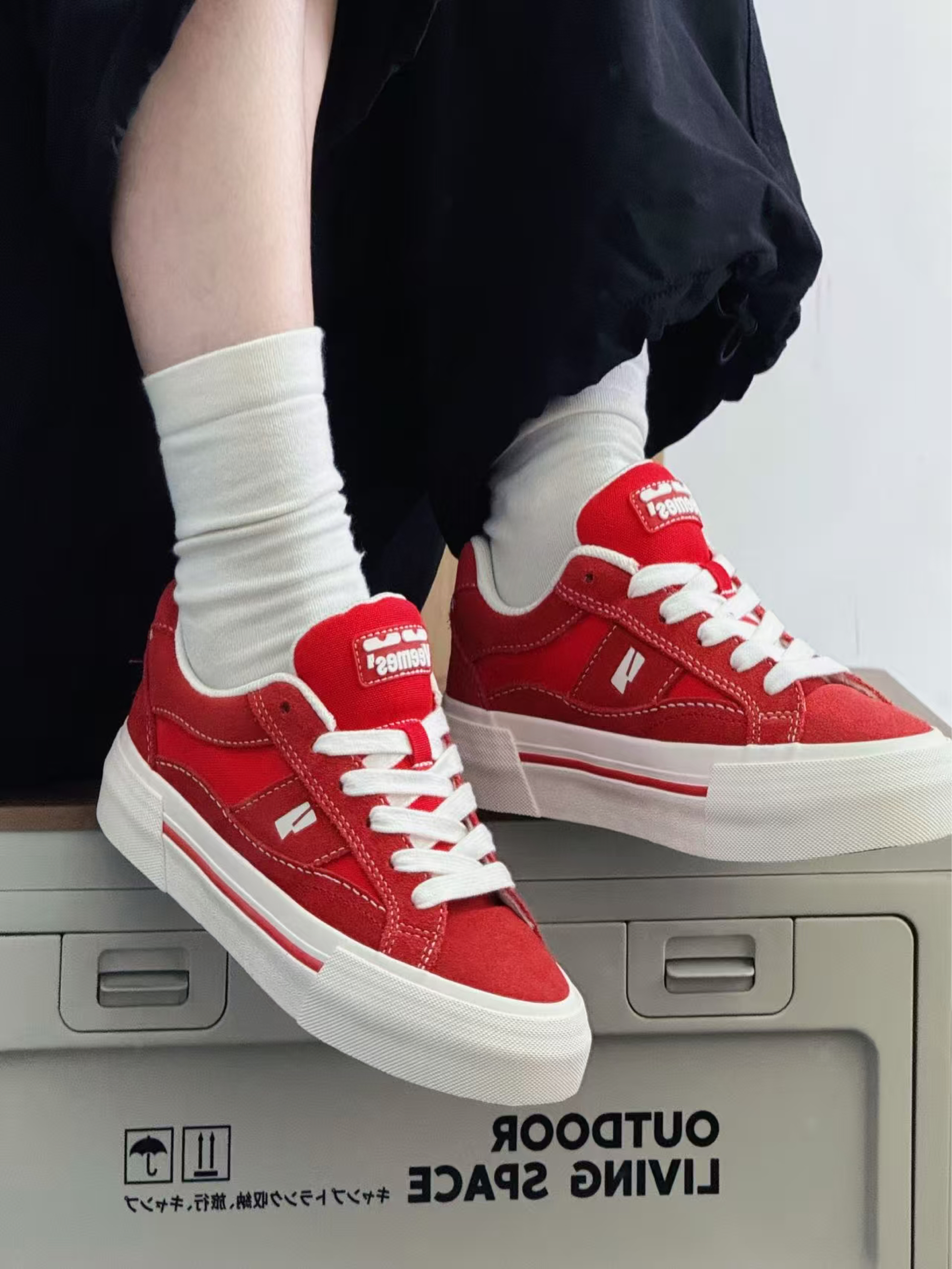 谁说舒适与时髦不能兼得? ✨ 第一眼心动:饱和正红鞋面撞上奶油白鞋底,像把炽烈骄阳揉进云朵里,鞋侧标志性LOGO暗藏小心机,简约不简单,随手搭卫衣/短裙/工装裤都能秒变街头焦点,连背影都写着「不好惹的时髦精」!