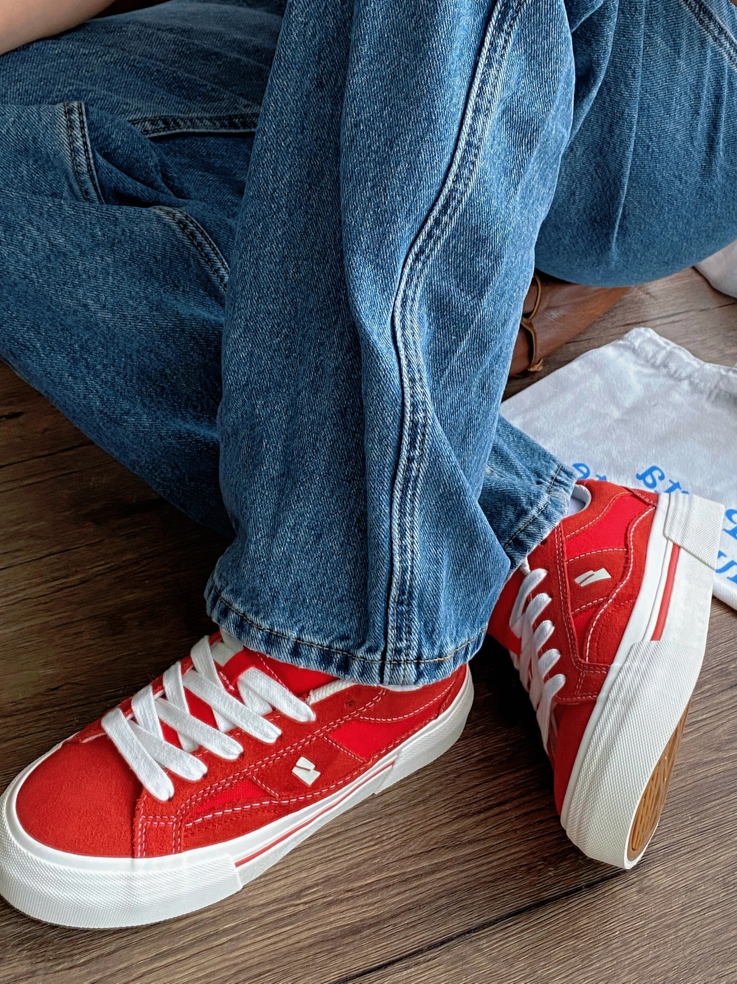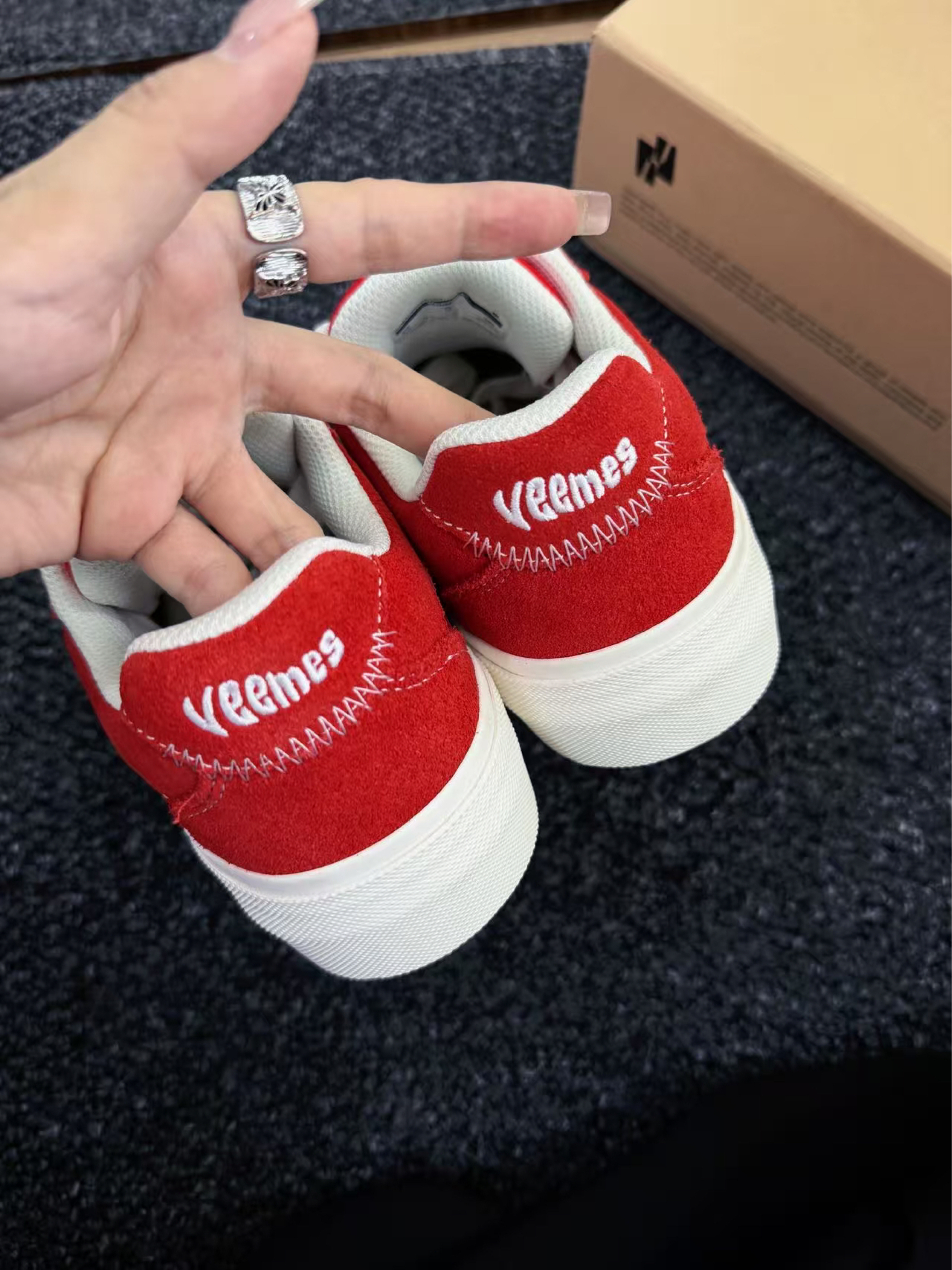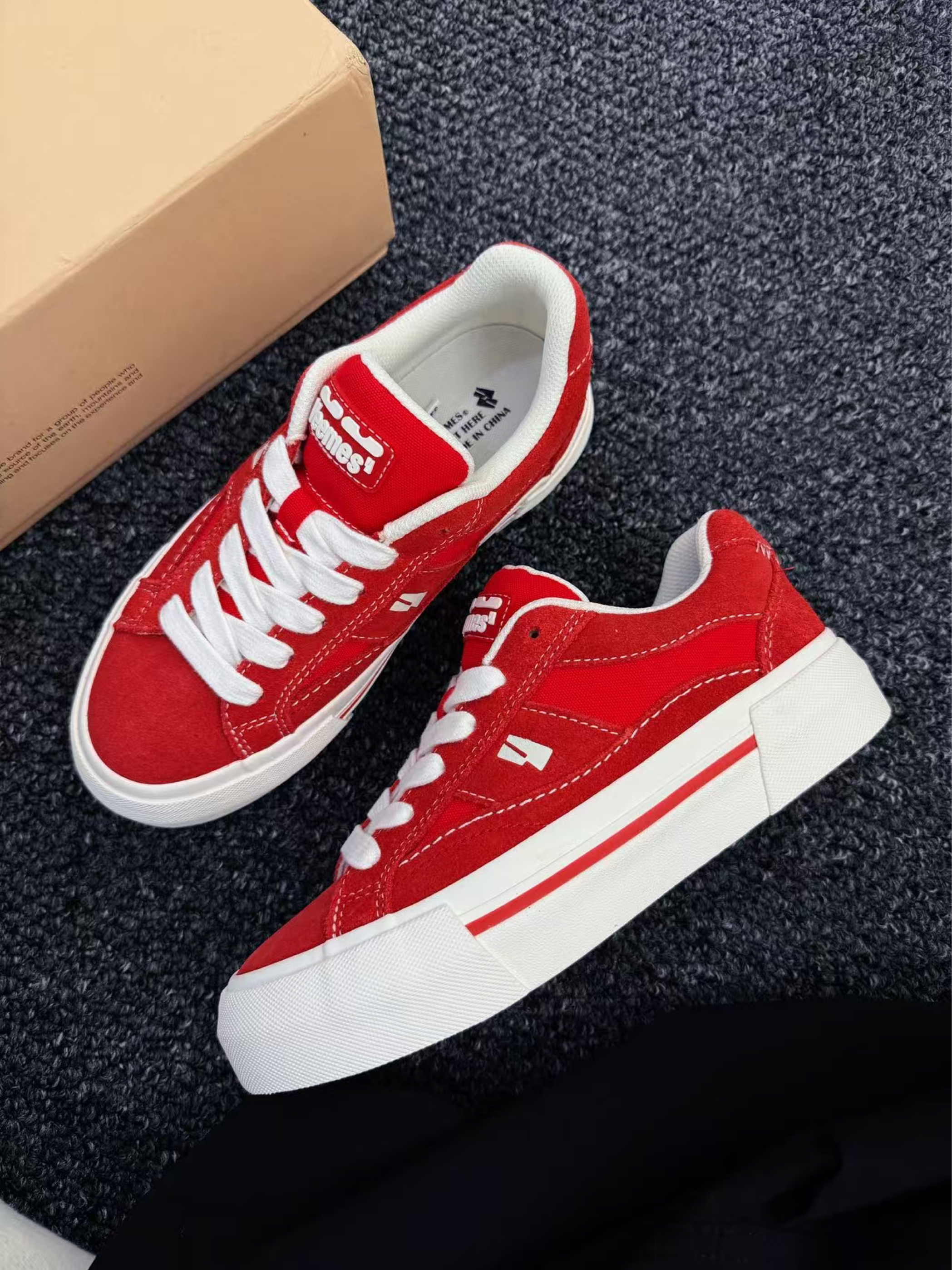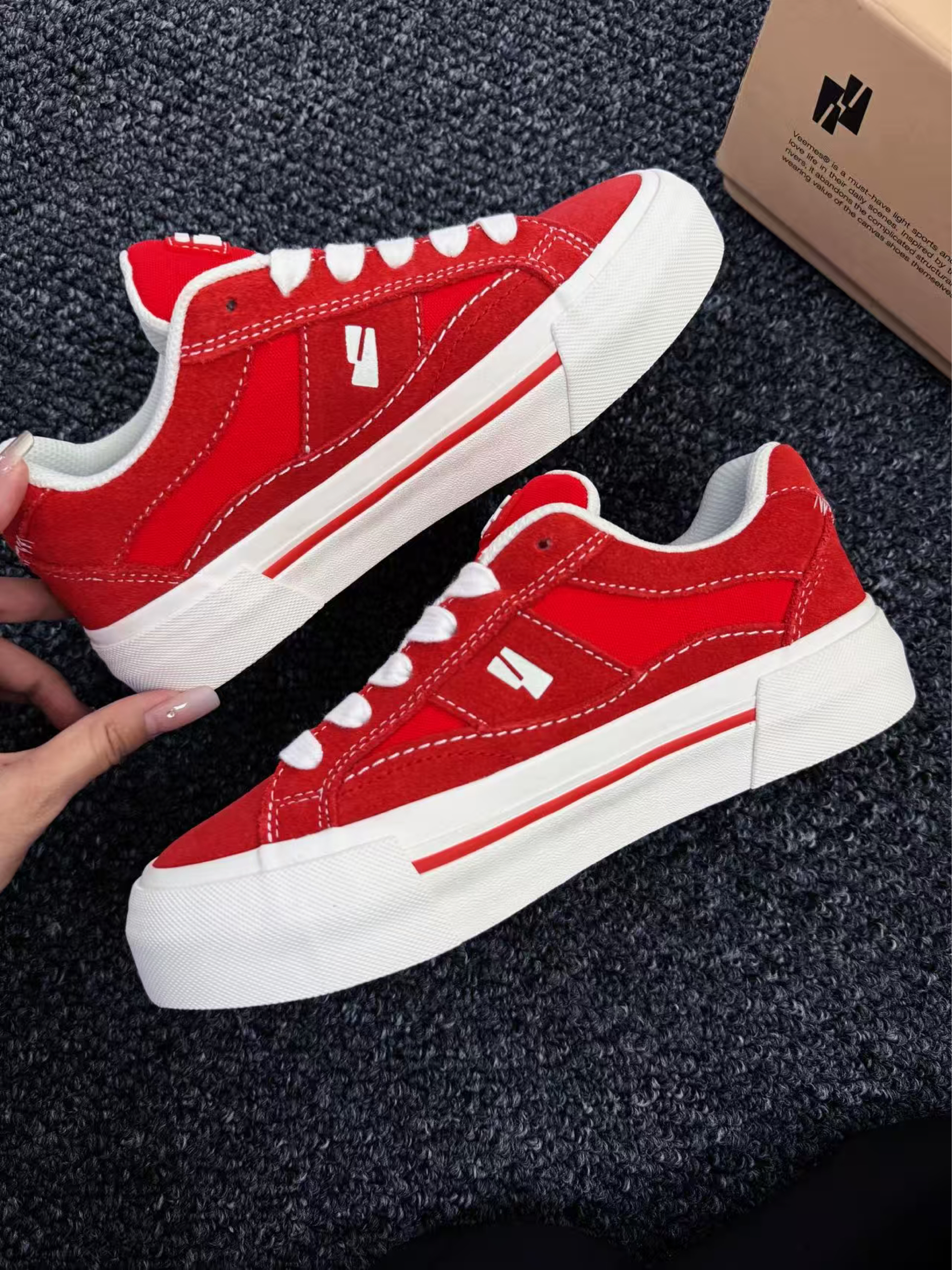 谁说舒适与时髦不能兼得? ✨ 第一眼心动:饱和正红鞋面撞上奶油白鞋底,像把炽烈骄阳揉进云朵里,鞋侧标志性LOGO暗藏小心机,简约不简单,随手搭卫衣/短裙/工装裤都能秒变街头焦点,连背影都写着「不好惹的时髦精」!