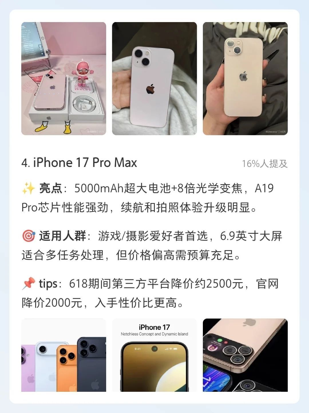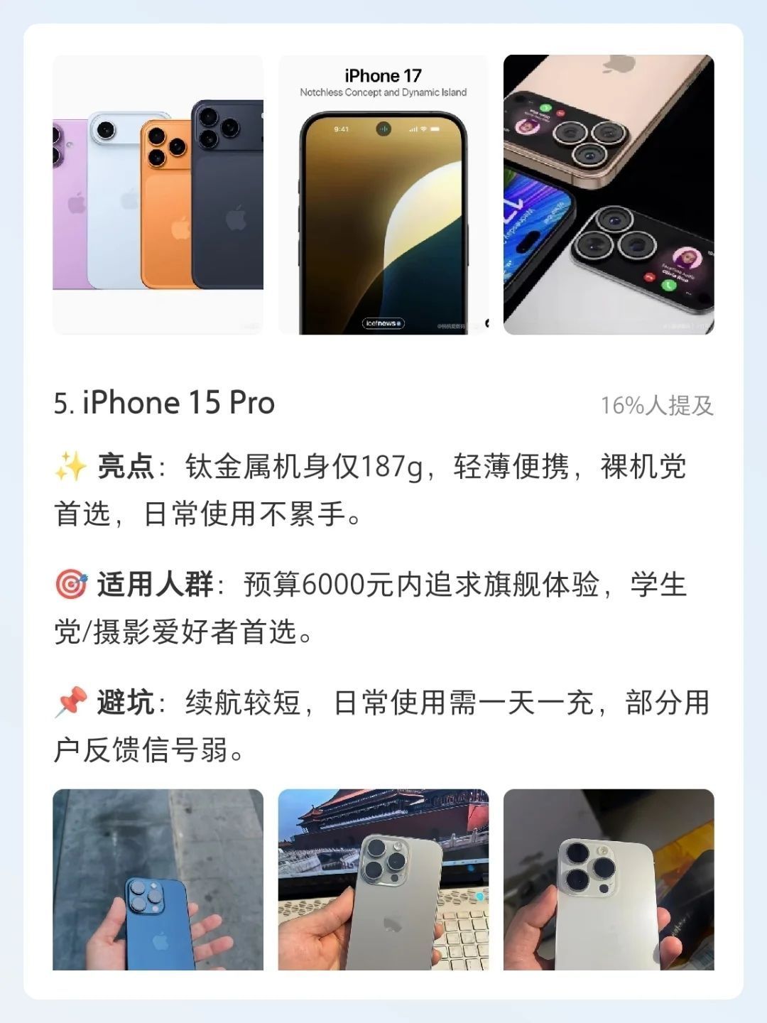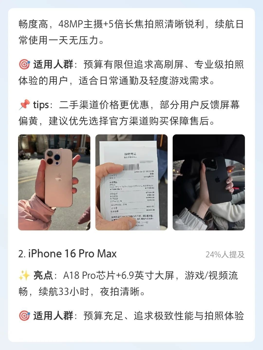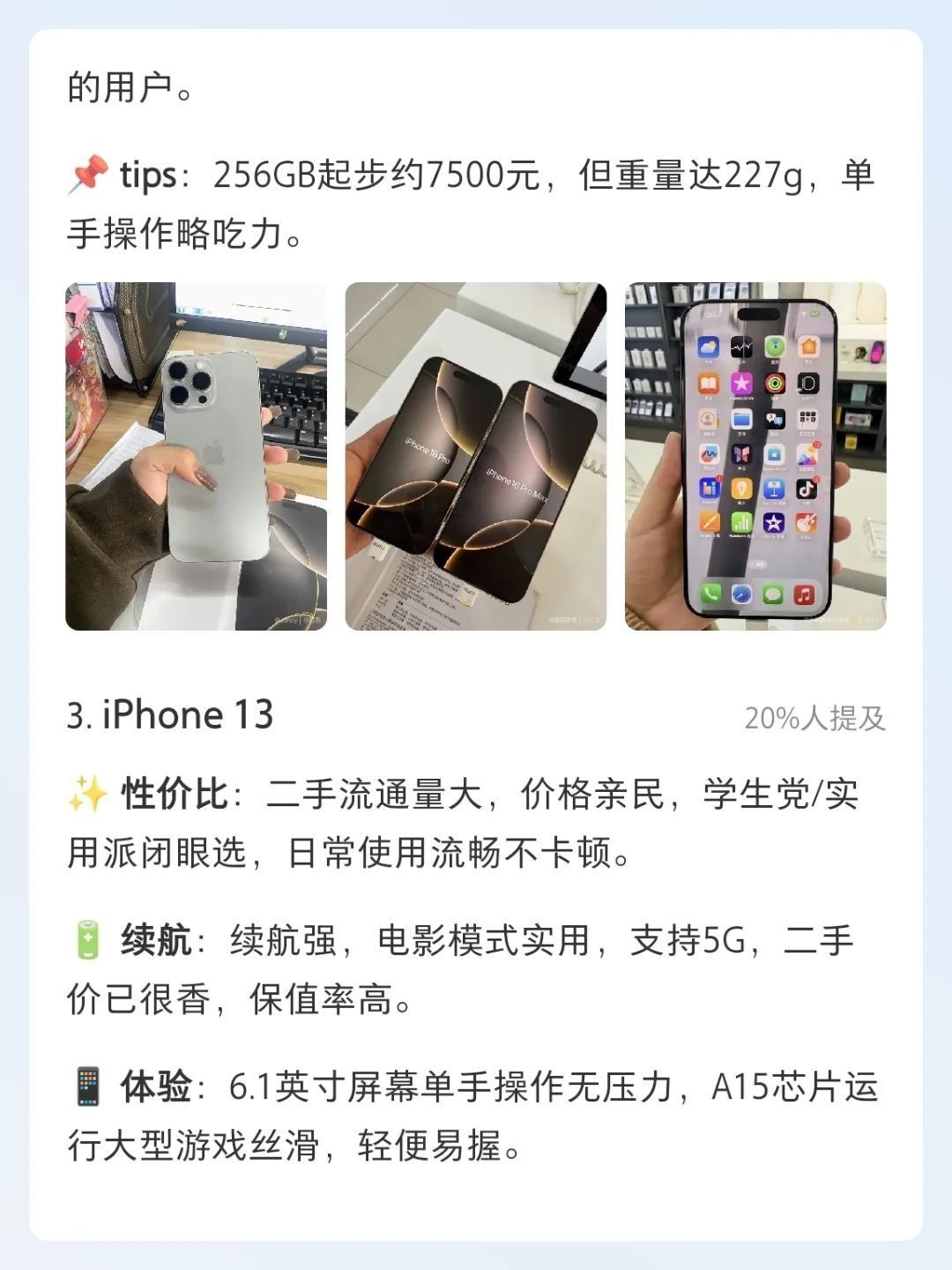 本篇笔记关联了Apple/苹果 iPhone 13 5G 手机 全网通 双卡双待 原装 快充 护眼 拍照 光学防抖 星光色、Apple/苹果 iPhone 15 Pro Max 5G 手机 钛金属 全网通 双卡双待 白色钛金属、Apple/苹果 iPhone 16 Pro Max 5G 手机 A18Pro芯片 相机控制键 微距摄影 双卡双待 钛金属 全网通 黑色钛金属等商品,为用户提供真实的使用体验和购买参考。