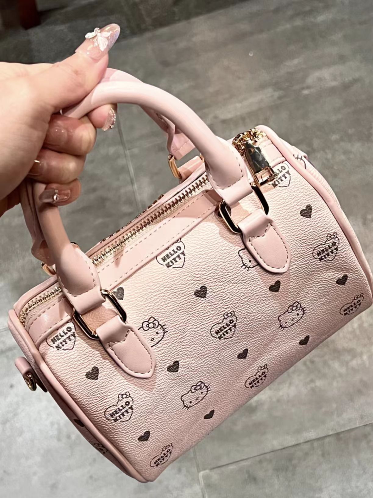 本以为波士顿包只能装可爱,没想到巨能装!手机+粉饼盒+充电宝毫无压力,内里分层还能塞下钥匙、口红,纸巾 防水PU皮被咖啡泼到居然能直接擦掉,软fufu的手感像撸猫爪,单肩背不勒肩膀,周末逛街背一整天也不累 颜色真的很粉嫩,配上HelloKitty的印花,甜度爆表~ 配T恤牛仔裤是甜妹出街,配西装外套居然能混搭出 “甜酷打工人”感?