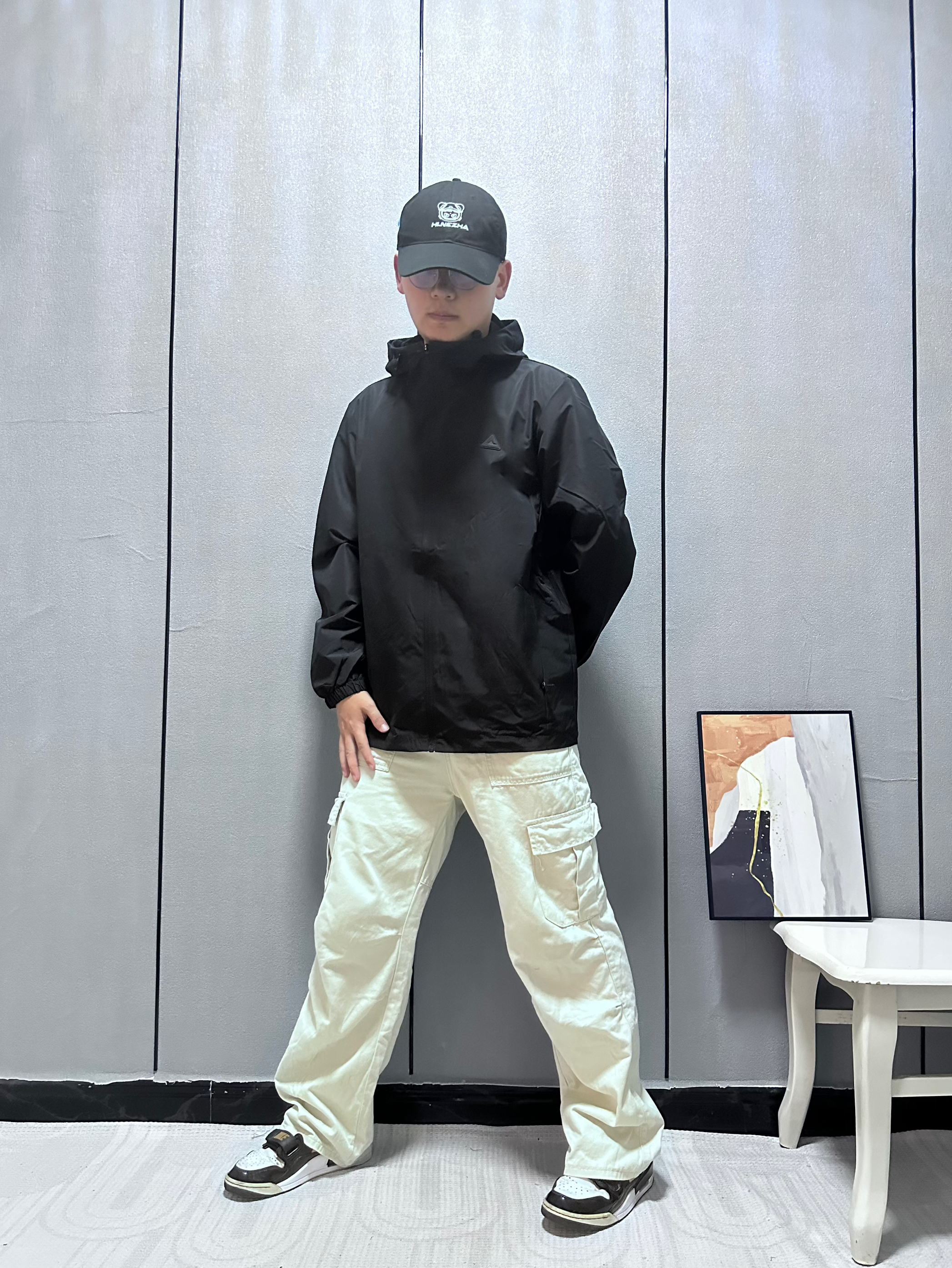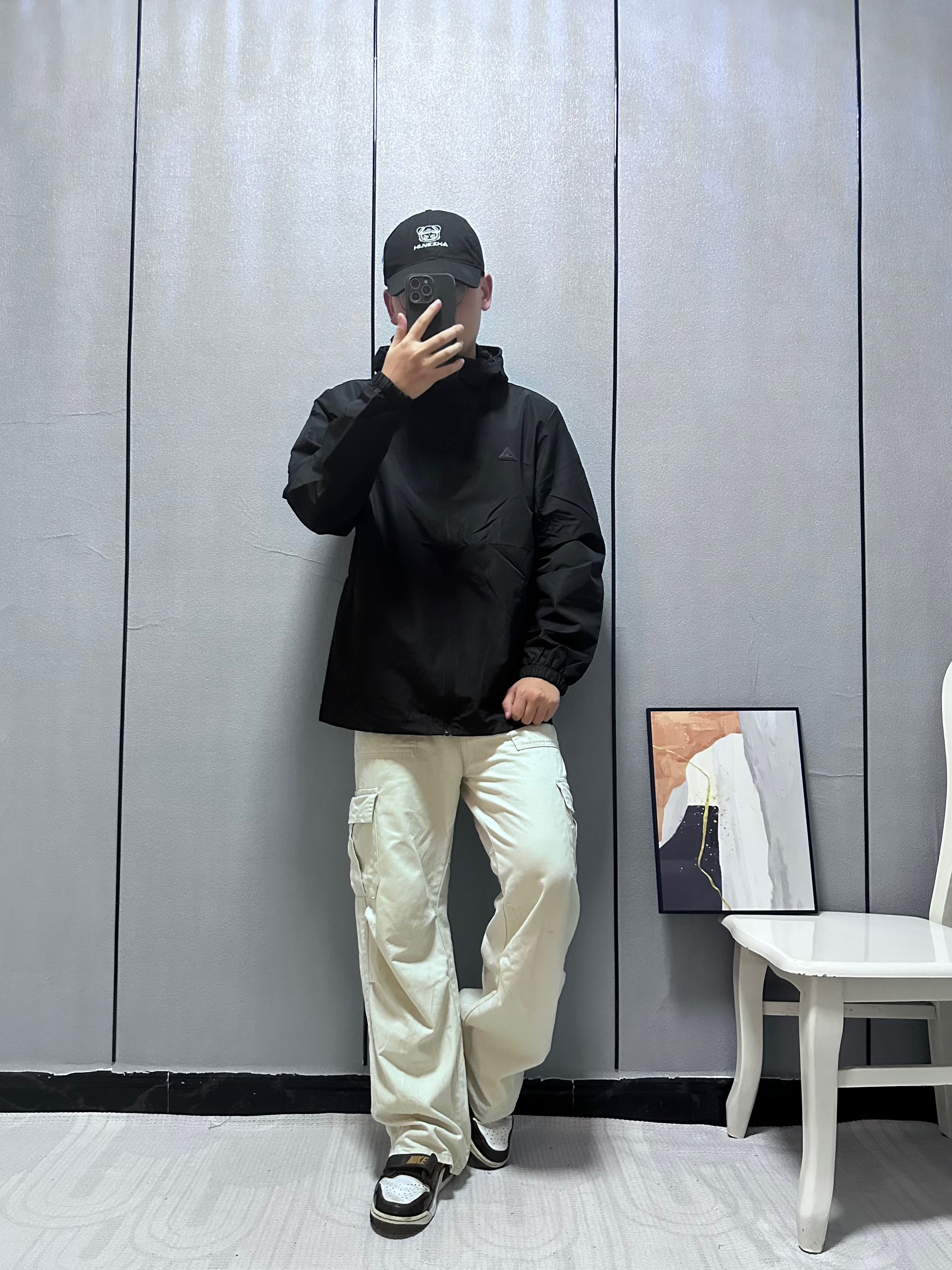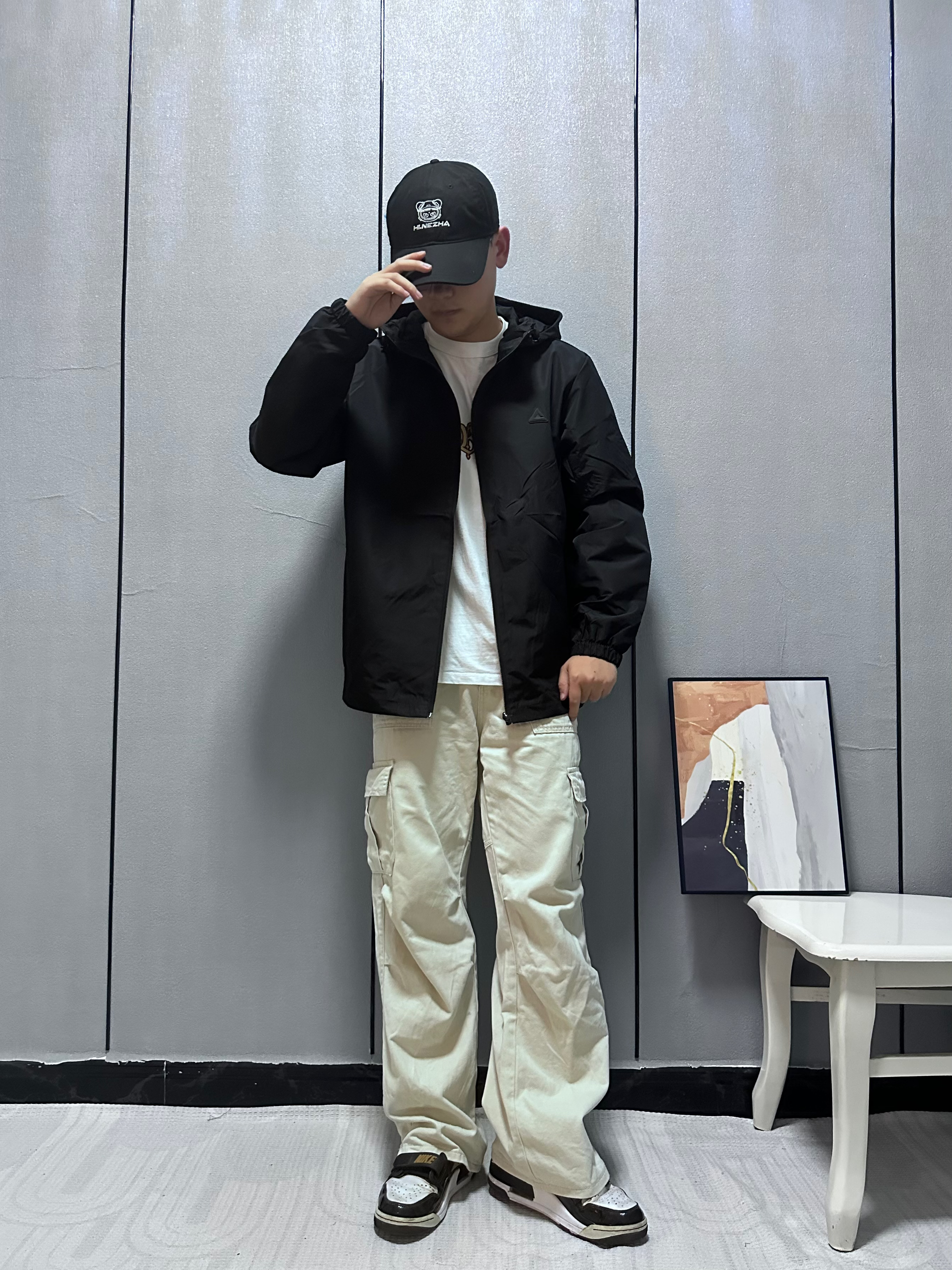 换季天气说变就变 幸好最近准备了这件防风夹克🌫️ 驭科技材质轻薄却扛风防泼水 雨天穿梭校园也无压力 廓形利落,一身黑色搭配卡其工装裤 机能风那味就有了,实用和帅气我都要