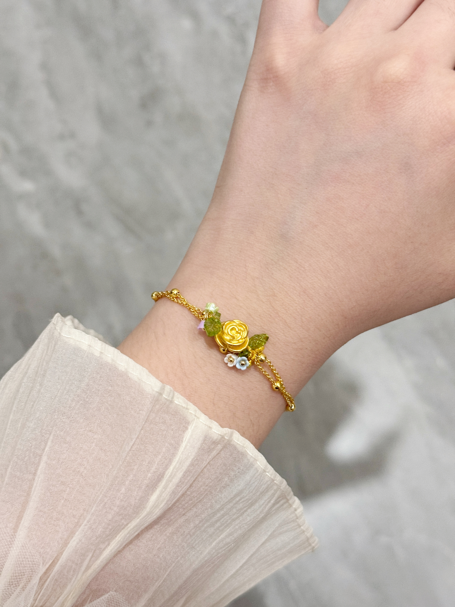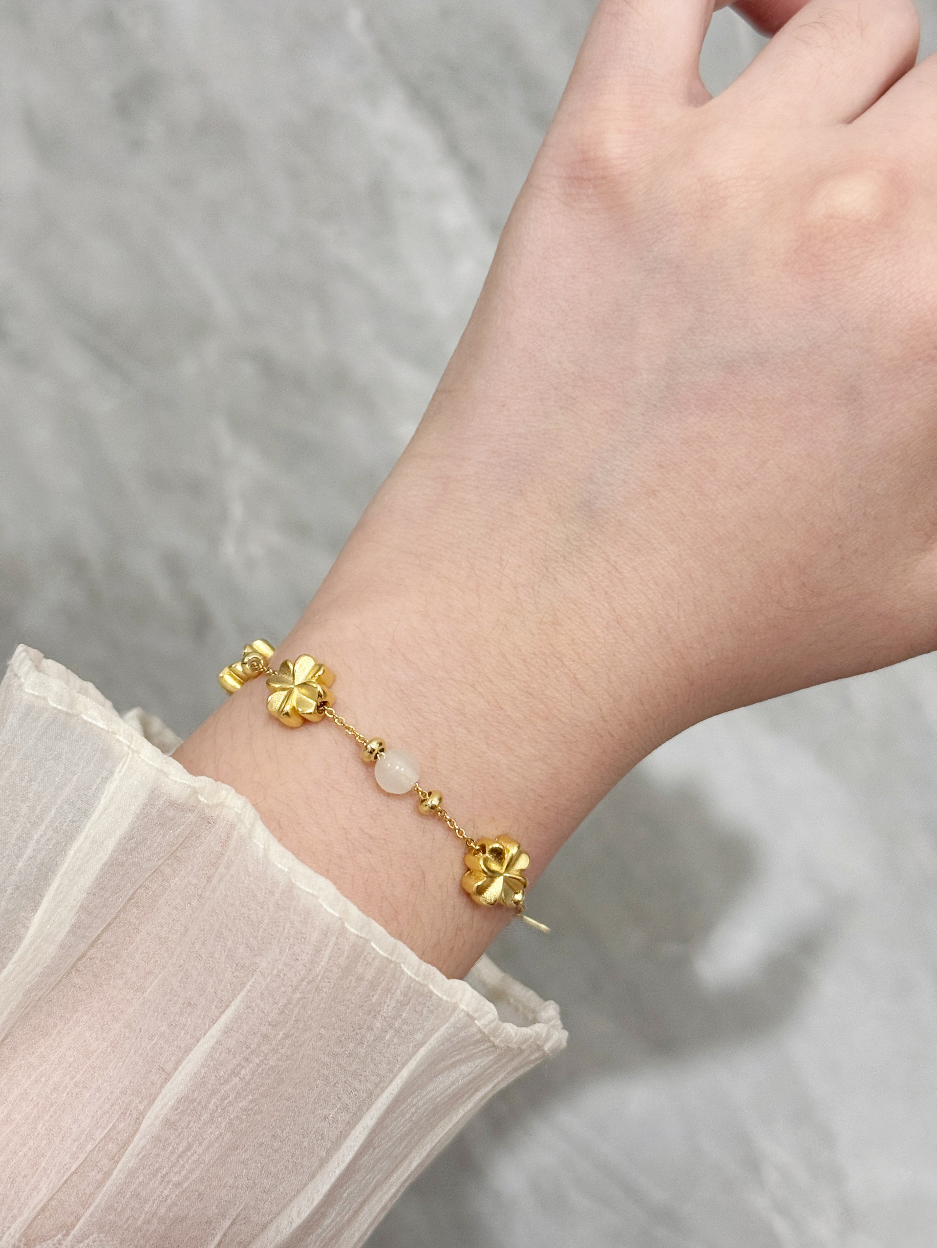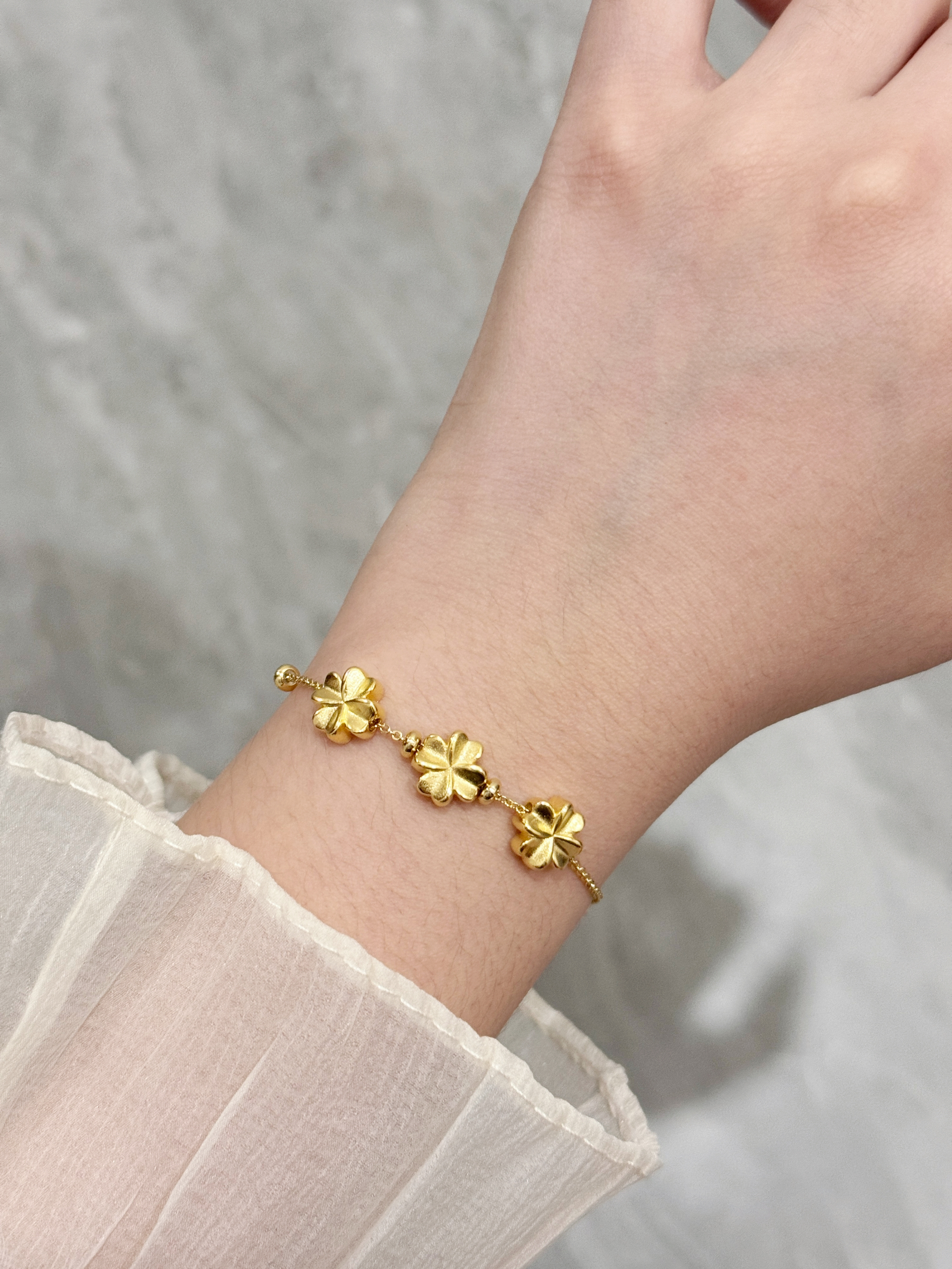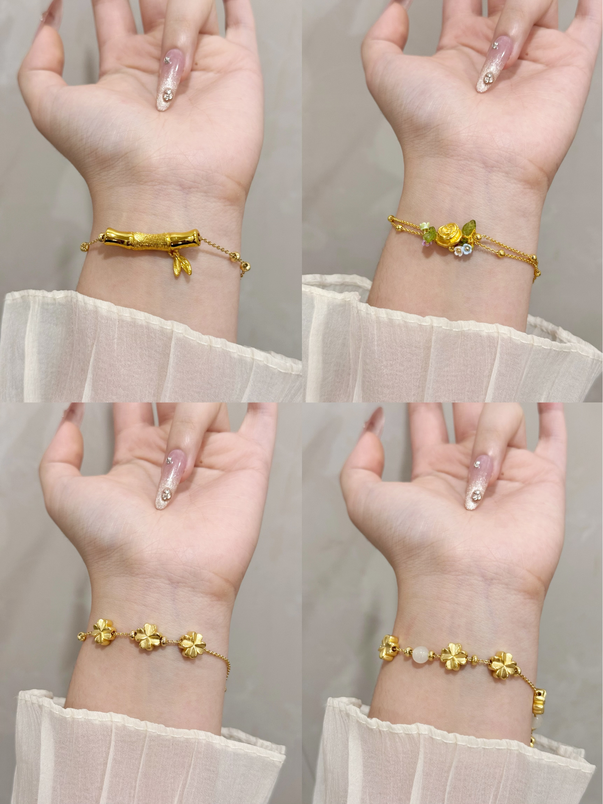 果然首饰的尽头是黄金~真的超显贵气呢! 四叶草手链不愧是经典中的经典!设计简约又很有高级感 四叶草元素又带着满满的幸运气息 真的很爱~ 玫瑰花手链新中式感真的很足!而且加上绿叶的点缀特别清新 而且很显白呢! 竹节手链真的可以搭我的任何衣服 真的很温柔 而且什么场合佩戴都很合适捏! 不管是单戴还是叠戴都能轻松拿捏日常通勤穿搭呢 是长期主义不容错过的手链喔~