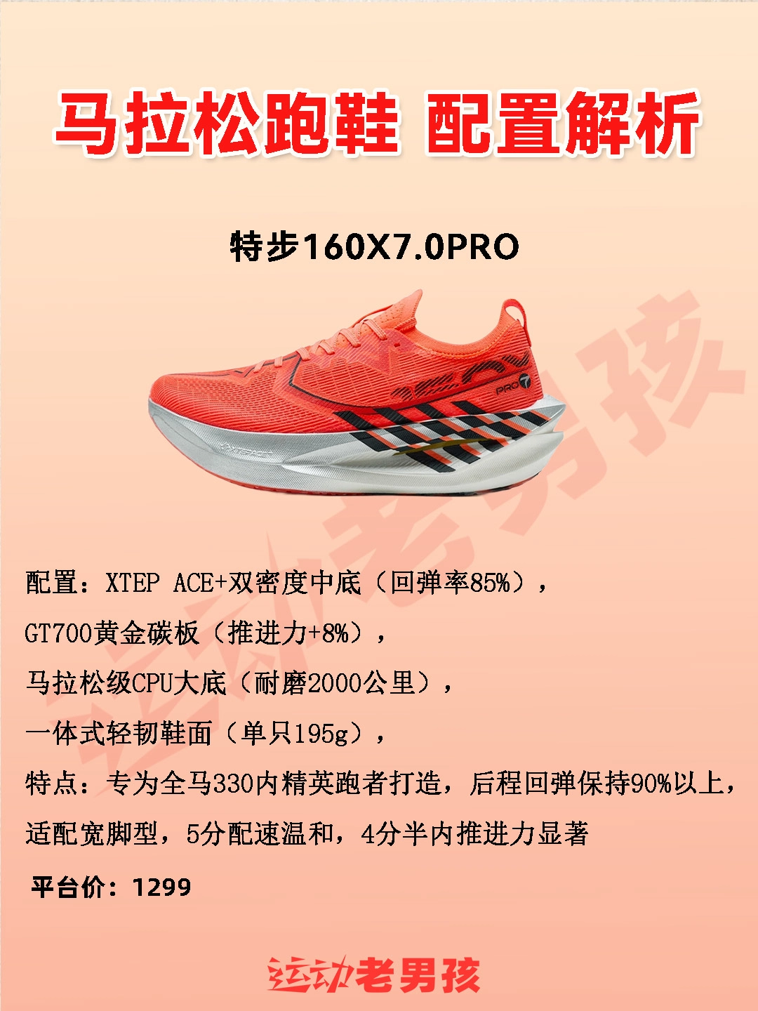 云天收夏色,木叶动秋声。秋天到!跑马季节来。整理了一期马拉松实力跑鞋跑友们装备马拉松比赛战靴的时候可以参考特步160X7.0PRO跑鞋的配置特点:配置:XTEP ACE+双密度中底(回弹率85%)GT700黄金碳板(推进力+8%)马拉松级CPU大底一体式轻韧鞋面特点:专为全马330内精英跑者打造,后程回弹保持90%以上,湿地止滑提升38.5%感谢跑友的喜欢,我是运动老男孩。 #马拉松跑步鞋🌞 #马...