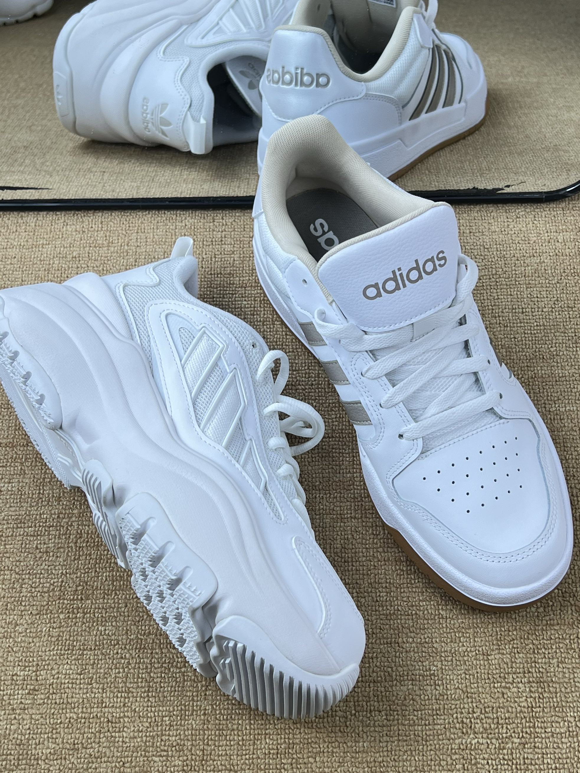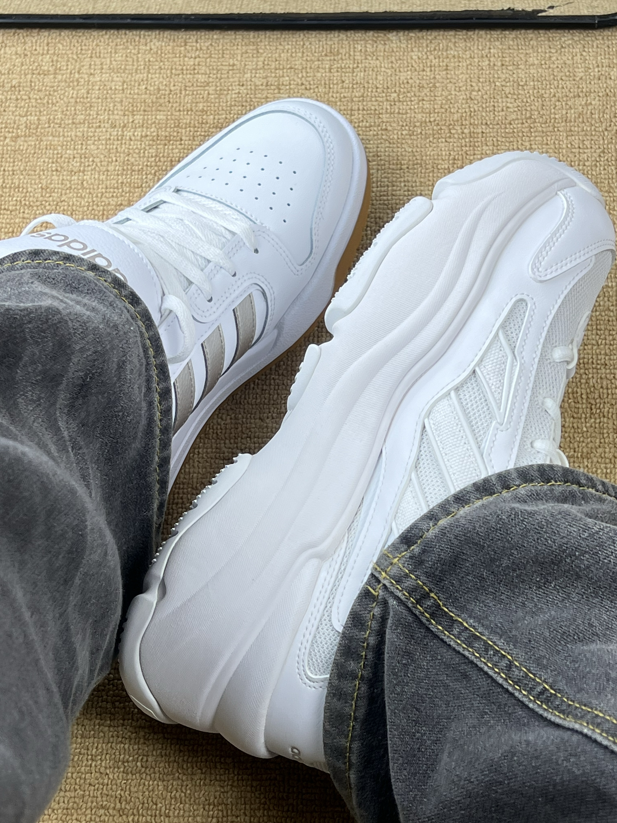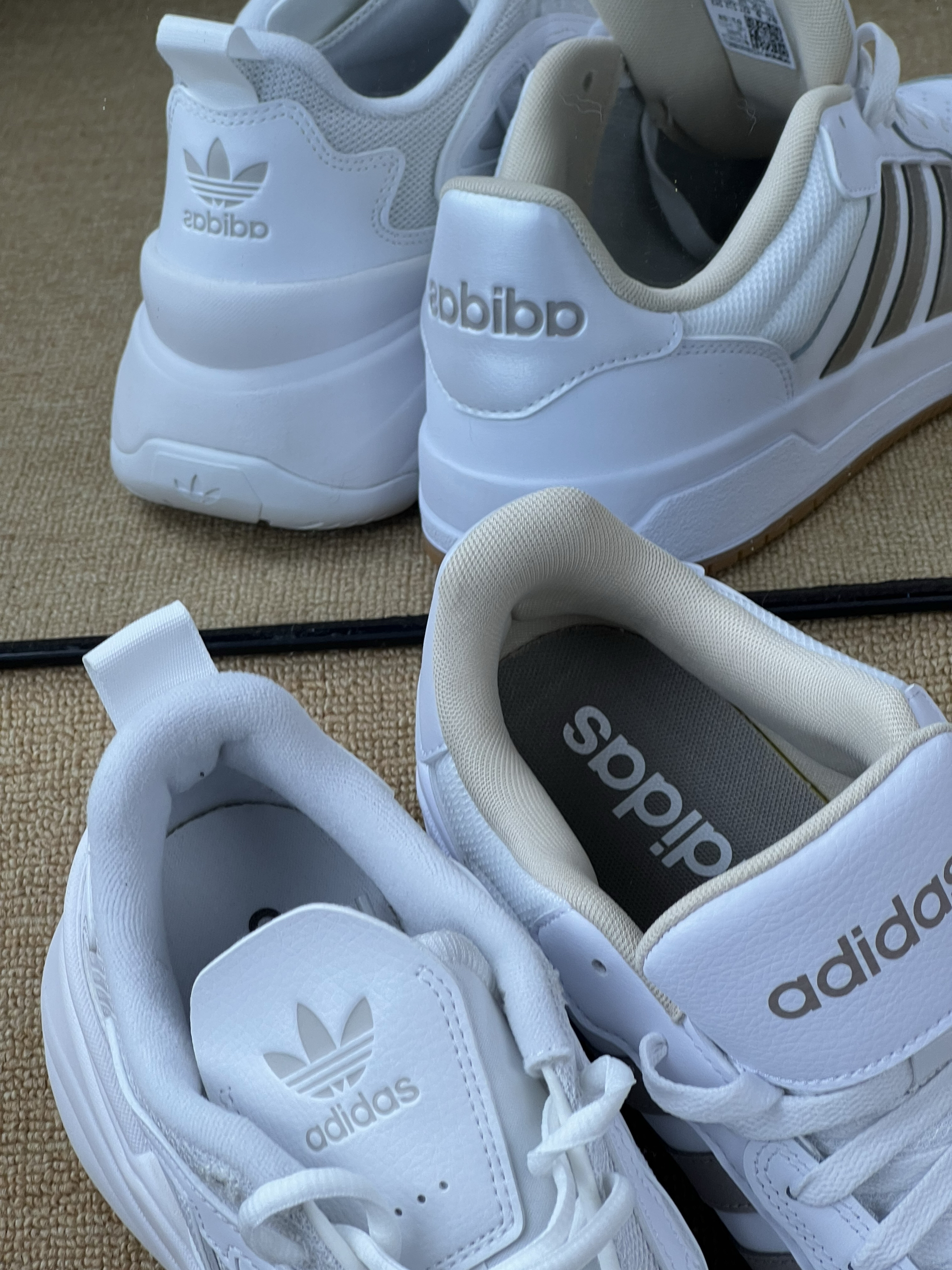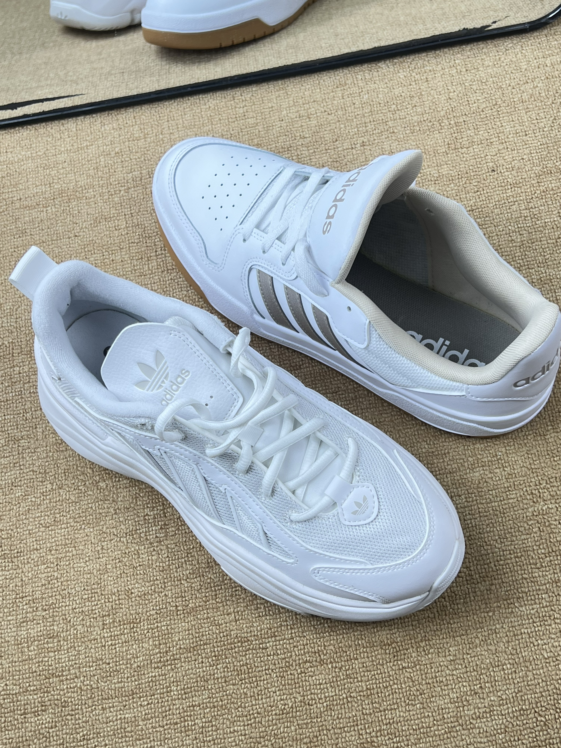 阿迪两双小白鞋实测对比:到底哪双更值得入? 一、颜值对决 • 三叶草款:复古老爹鞋型,鞋身线条圆润饱满,纯白配色+同色系三叶草logo,是那种“奶呼呼”的复古感,很有90年代运动风的韵味,搭配起来自带休闲慵懒感。 • 银标款:偏板鞋的款式,白色鞋身配浅灰条纹,简约中带点精致感,风格更利落,日常通勤或者走简约风路线很搭。 二、材质比拼 • 三叶草款:鞋面是网布+皮革拼接,透气性不错,...