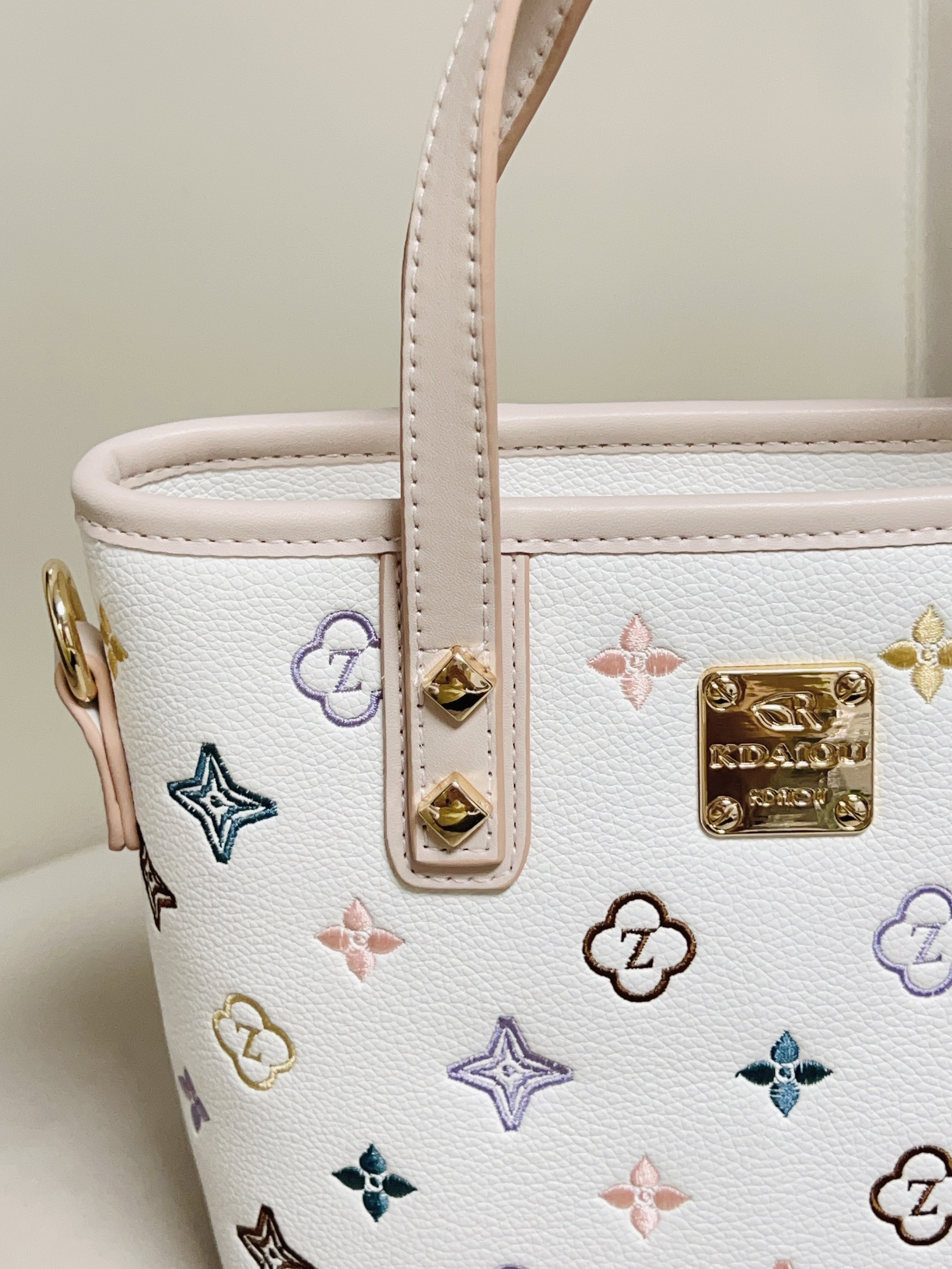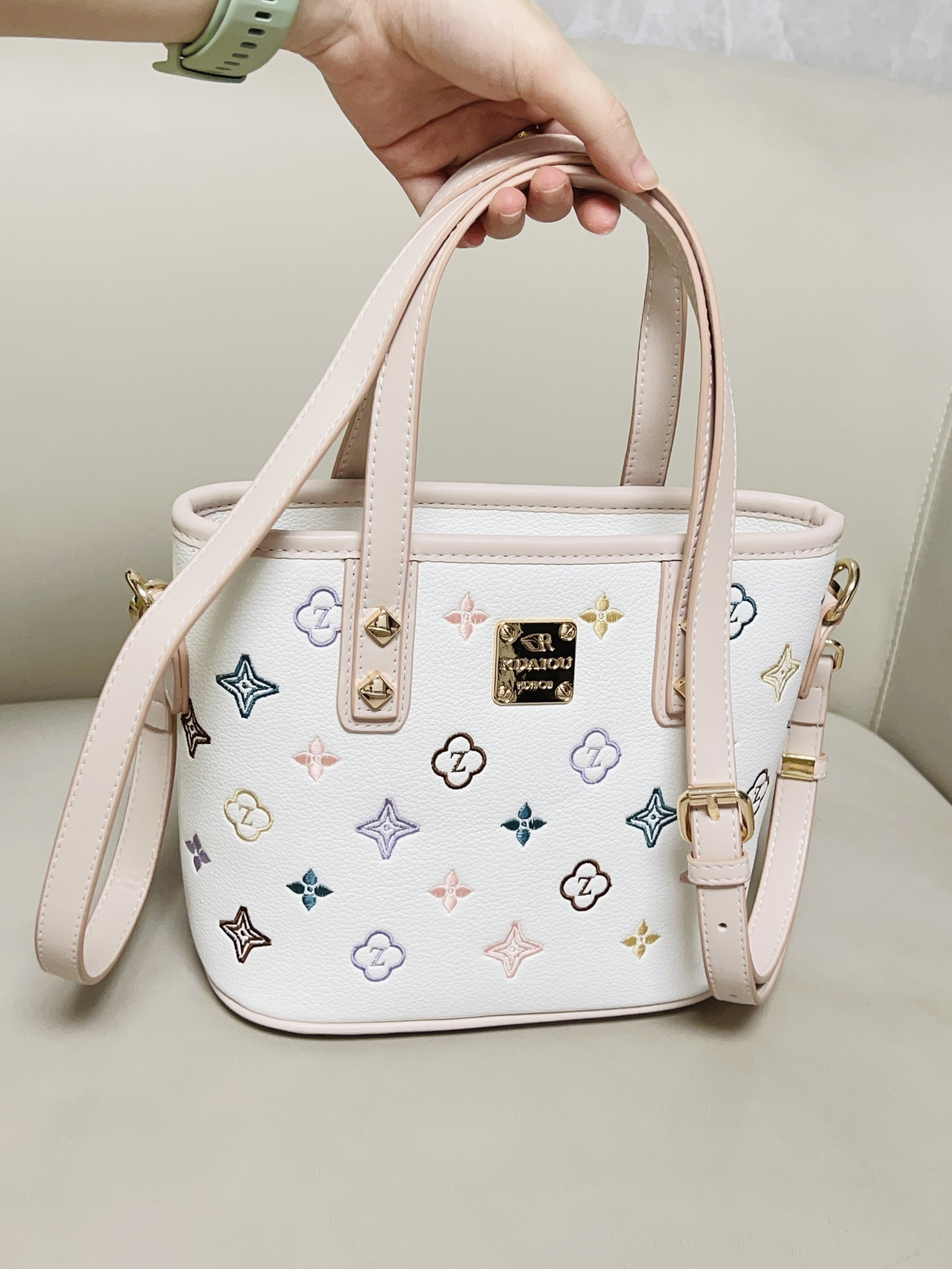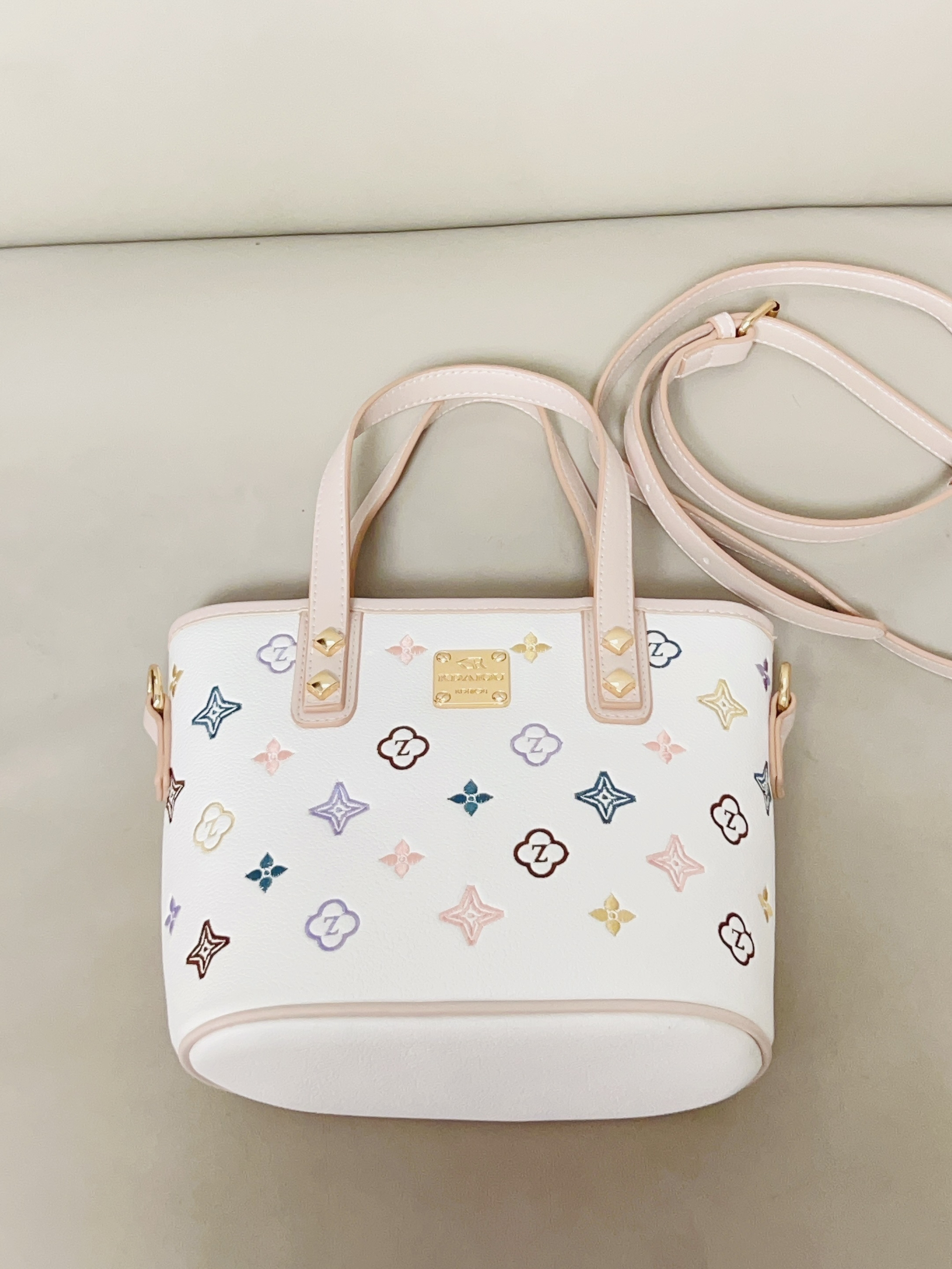 跟大家分享一下我的新包包 彩色的印花➕米白配色好好看 软乎乎的皮质 我觉得质感挺好的 还蛮能装的 日常要用的手机 钱包 充电宝都能放下去 可以手拎着也可以斜挎或单肩背 日常通勤逛街随便搭衣服都可