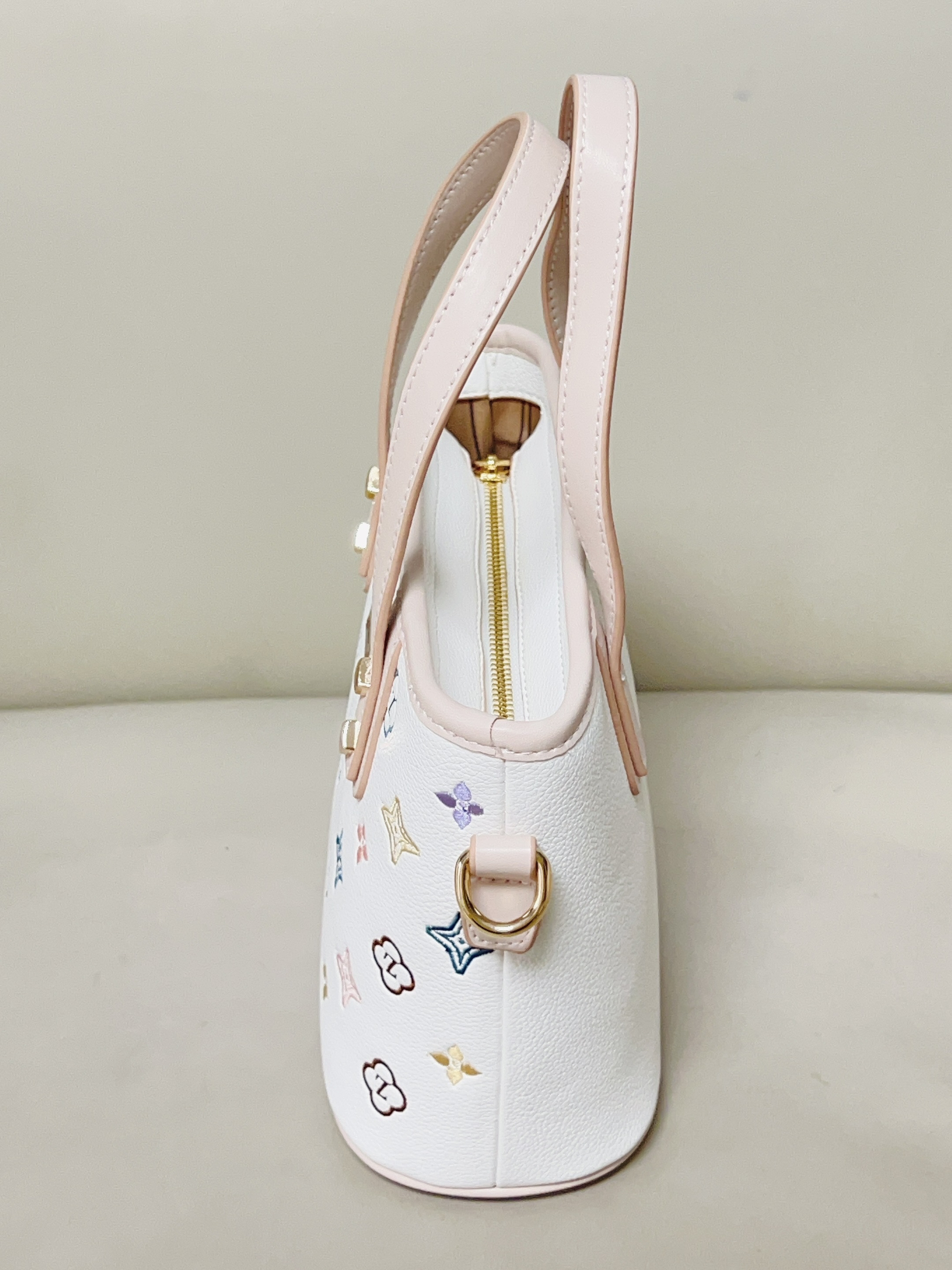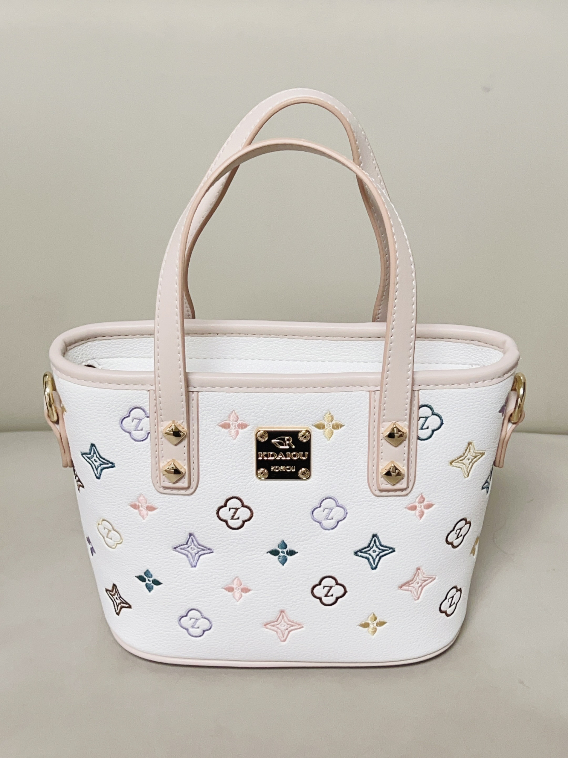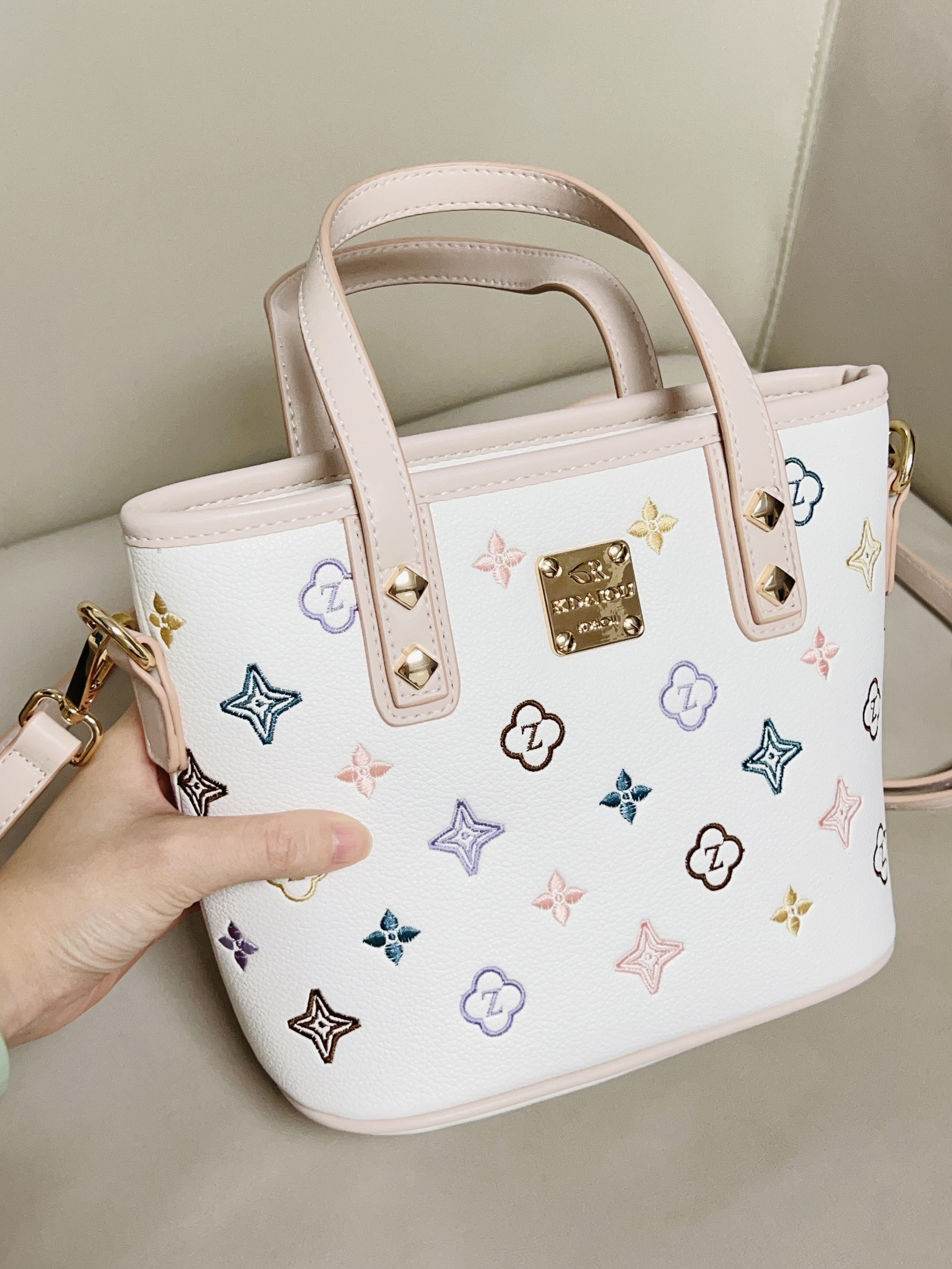 跟大家分享一下我的新包包 彩色的印花➕米白配色好好看 软乎乎的皮质 我觉得质感挺好的 还蛮能装的 日常要用的手机 钱包 充电宝都能放下去 可以手拎着也可以斜挎或单肩背 日常通勤逛街随便搭衣服都可
