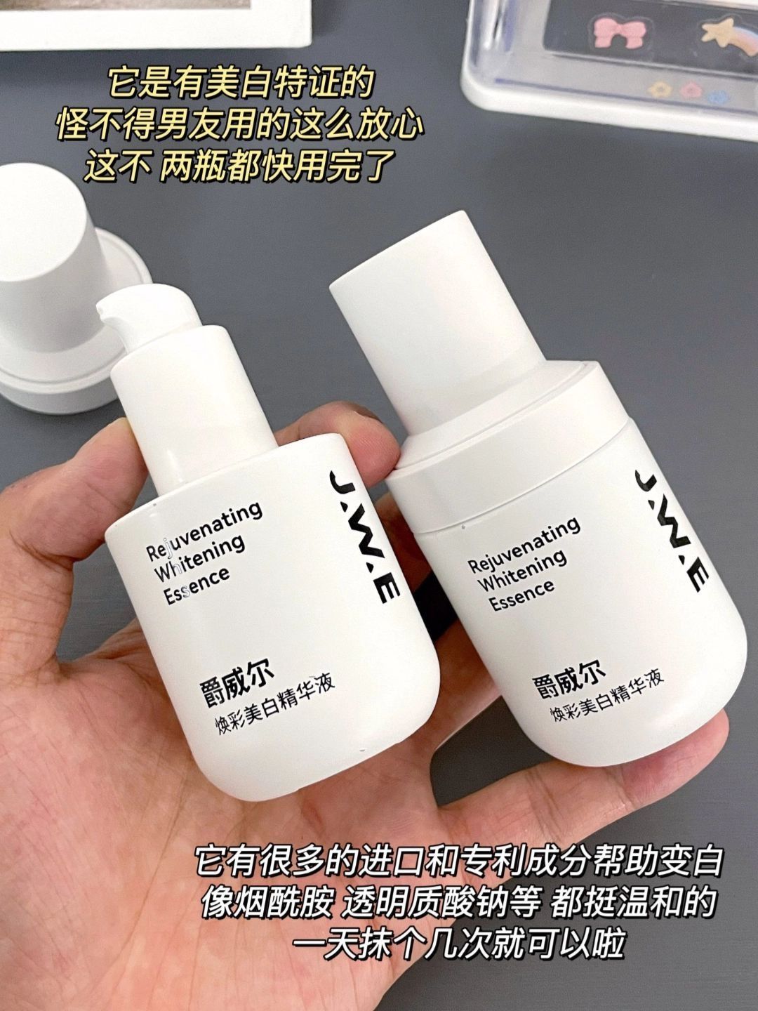 男友之前是挺黑的 我就老嘲笑他 还给他起外号 结果他就生气了 说无论如何也要比我白 我想着就开个玩笑 结果他真的变白好多啊 现在都比我白太多了 我看了都羡慕的程度 他这么白的原因是一直用的爵威尔美白精华 这个精华看着小小一瓶 没想到这么能白 变白效果挺不错的 因为它是有美白特证的 而且还有好多的美白成分 用起来也很放心 他就是每天坚持在用 而且质地也是水润润的 他一个油皮都可以驾驭 而...
