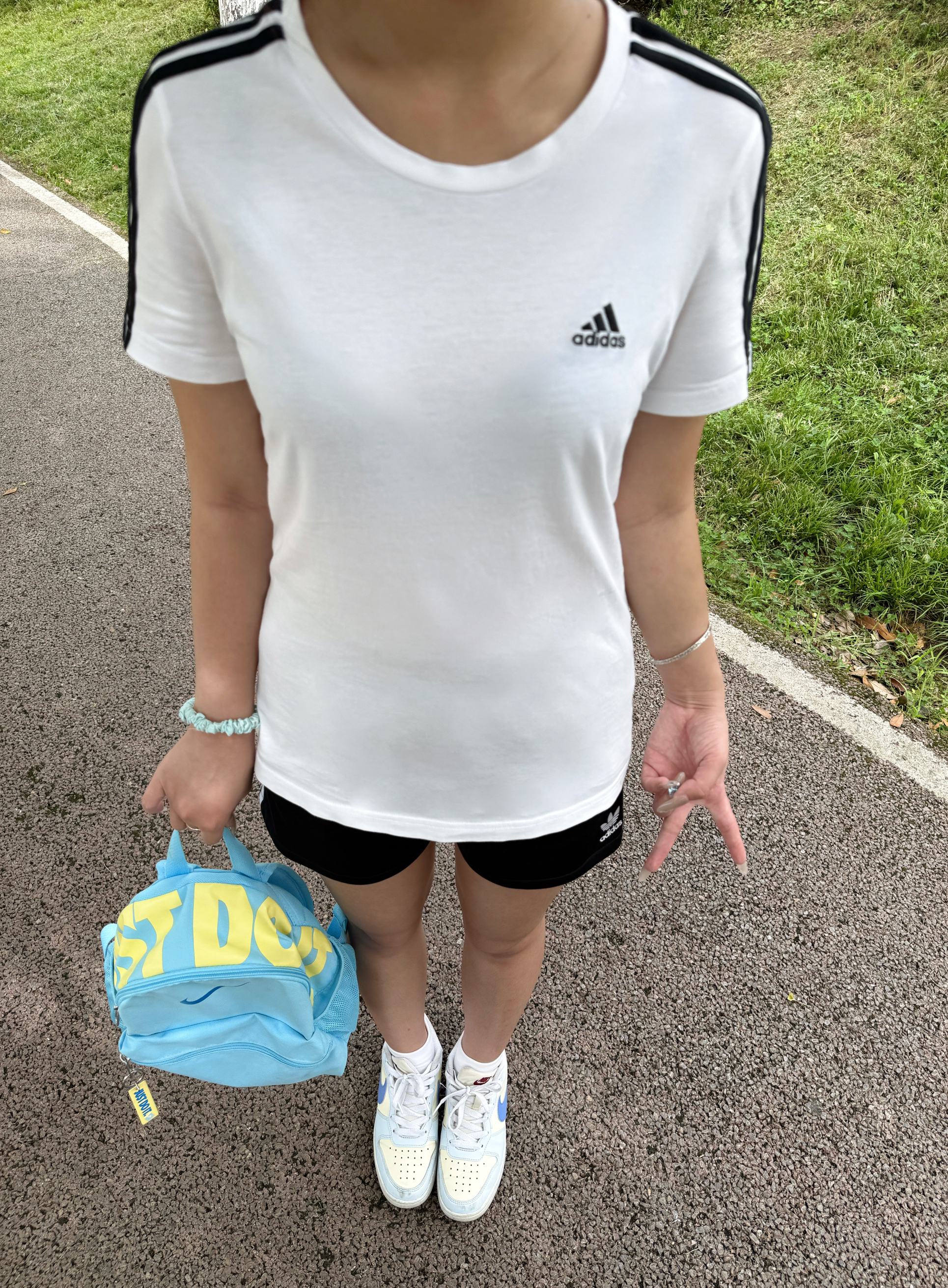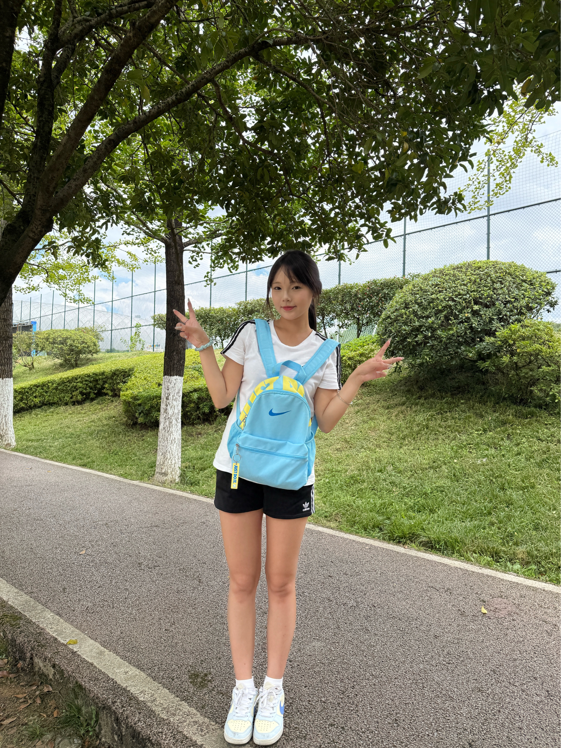 开学季穿搭来啦!一套超青春活力的look~ 上衣选简约的白色短袖,搭配经典的阿迪达斯黑色短裤,简约又有运动感。背上亮眼的耐克蓝黄拼色双肩包,瞬间点亮整体造型,既方便装书本,又很吸睛。 脚下是一双带有清新配色的耐克运动鞋,舒适又和包包呼应,整体搭配休闲又充满朝气,特别适合校园日常,轻松开启活力满满的新学期~