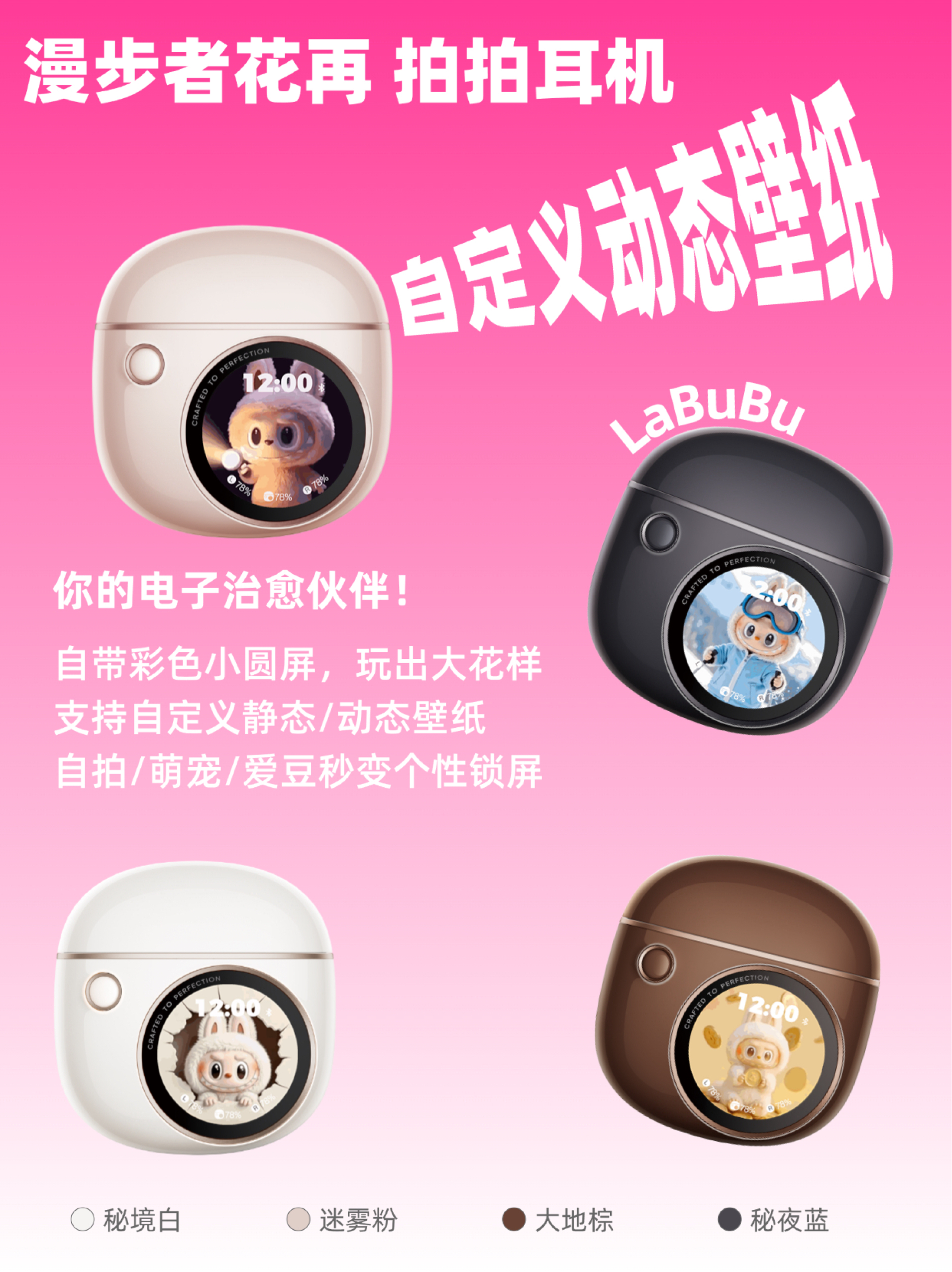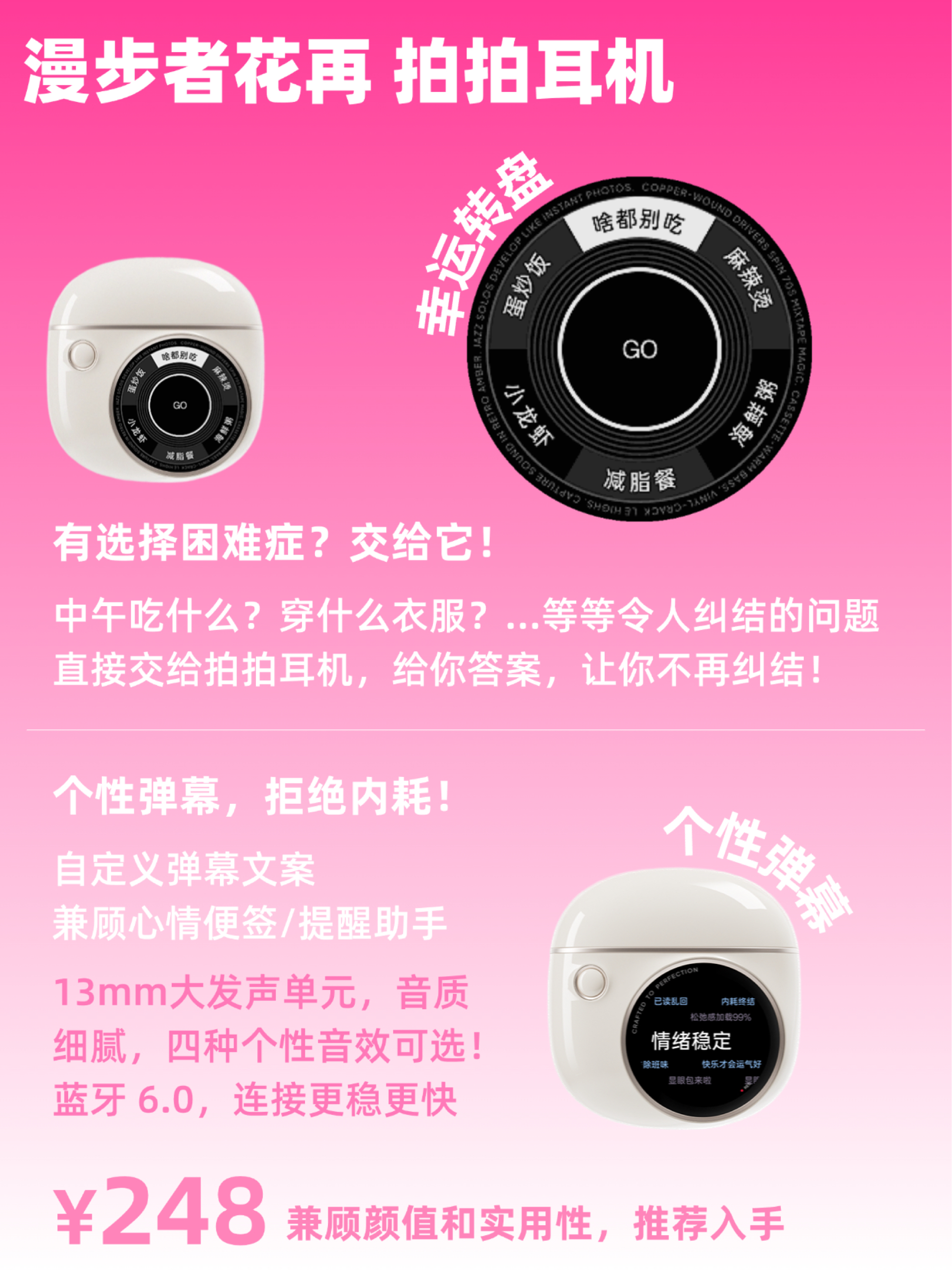 临近开学季,后台很多小伙伴在问漫步者花再耳机怎么选❓ 今天给大家整理了一份漫步者花再百元档耳机合集☺️快来看看有没有你喜欢的呢 - ✅漫步者花再 拍拍耳机 这款颜值和实用性都很高!四种颜色可以选择,外观就像「拍立得」相机📸 自带彩色屏幕👏🏻这块屏幕可以自定义静态/动态壁纸,让你可以把自拍、萌宠、爱豆变成个性锁屏。还有幸运转盘,吃什么、穿什么衣服等等通通交给它,直接告诉你答案,再也不纠结啦!个性弹幕...