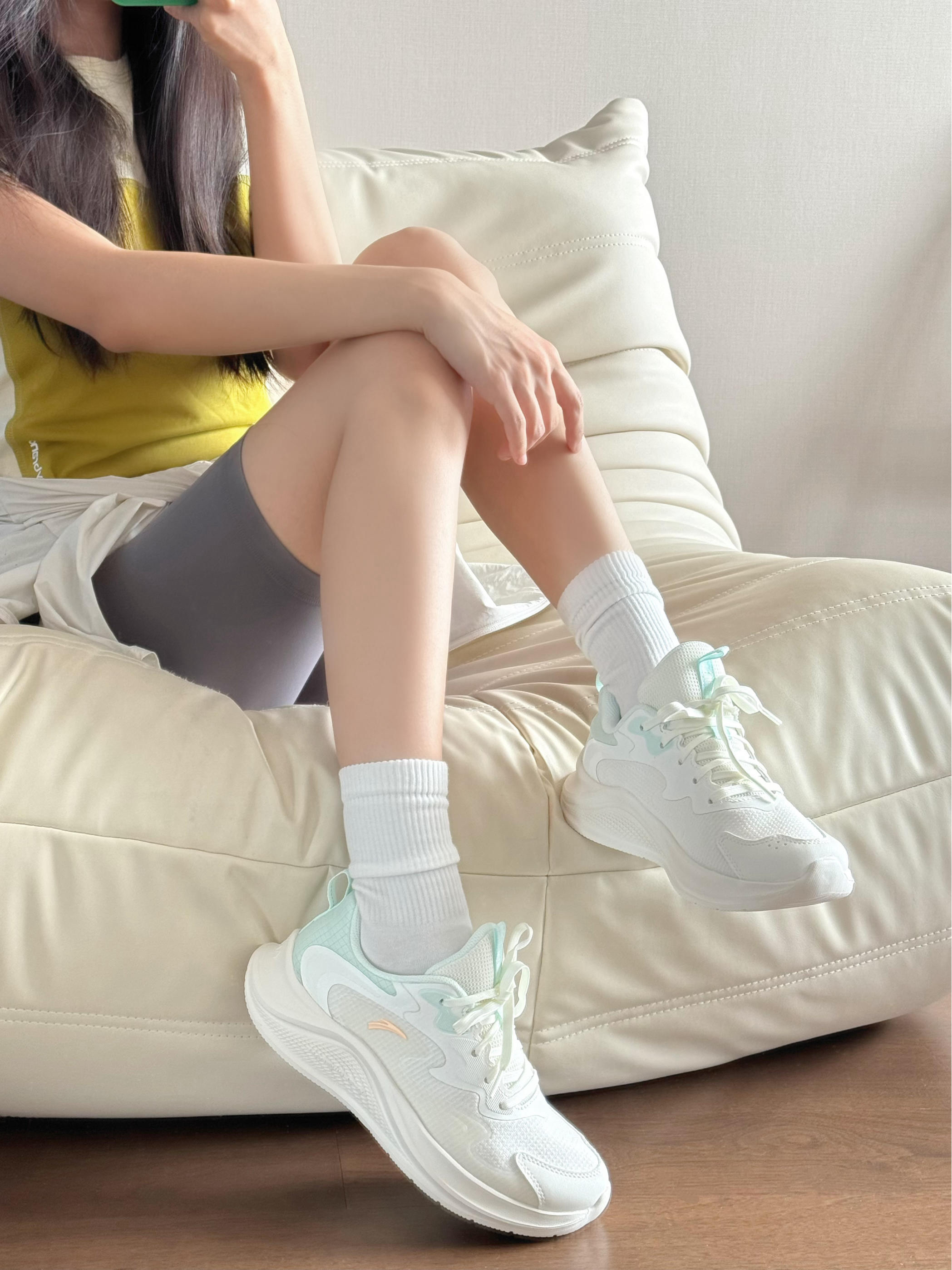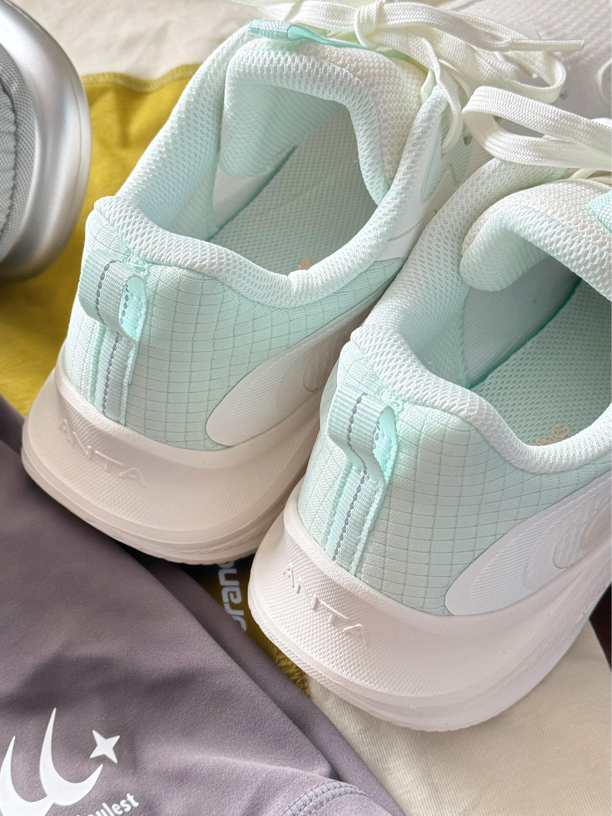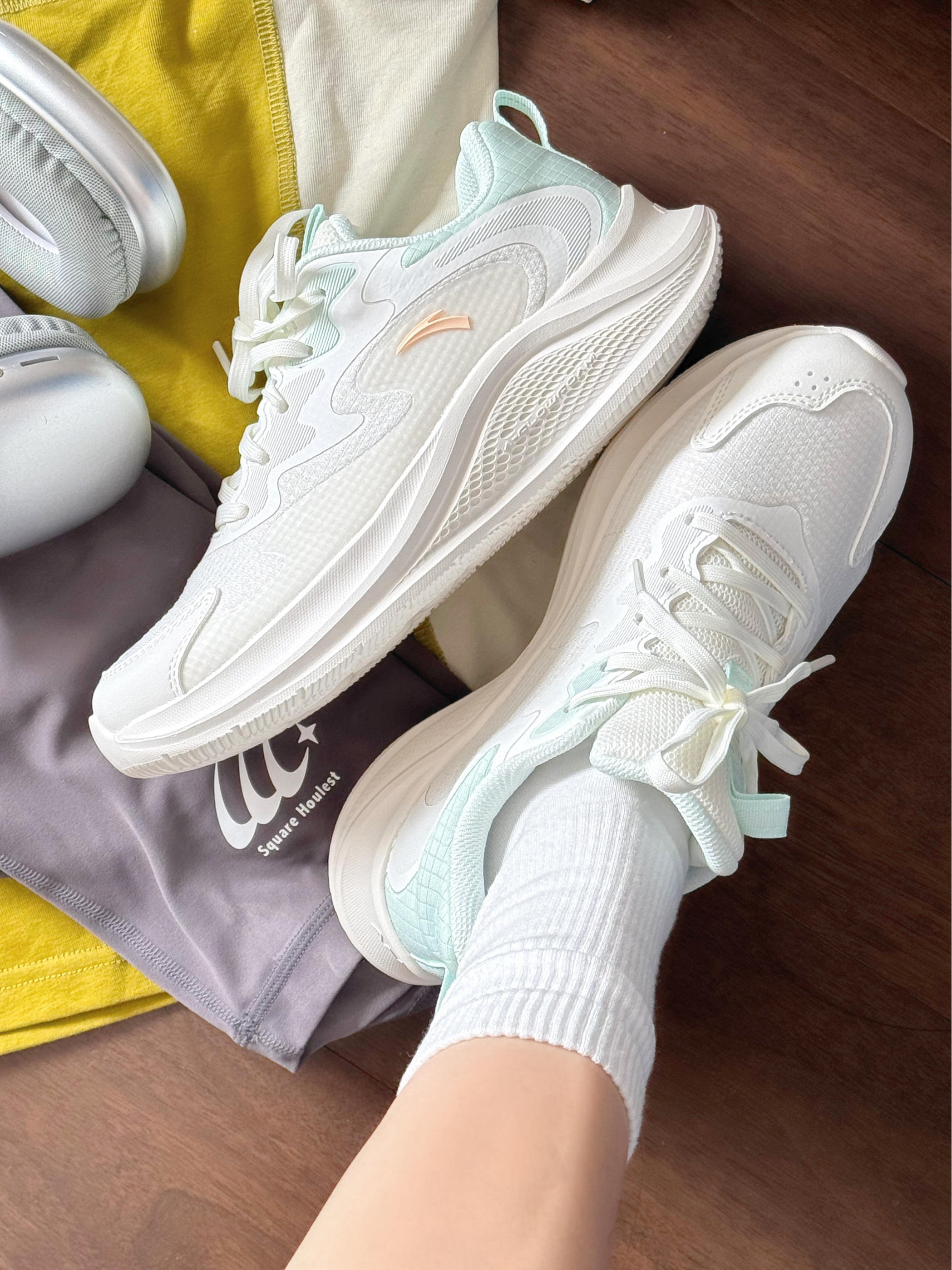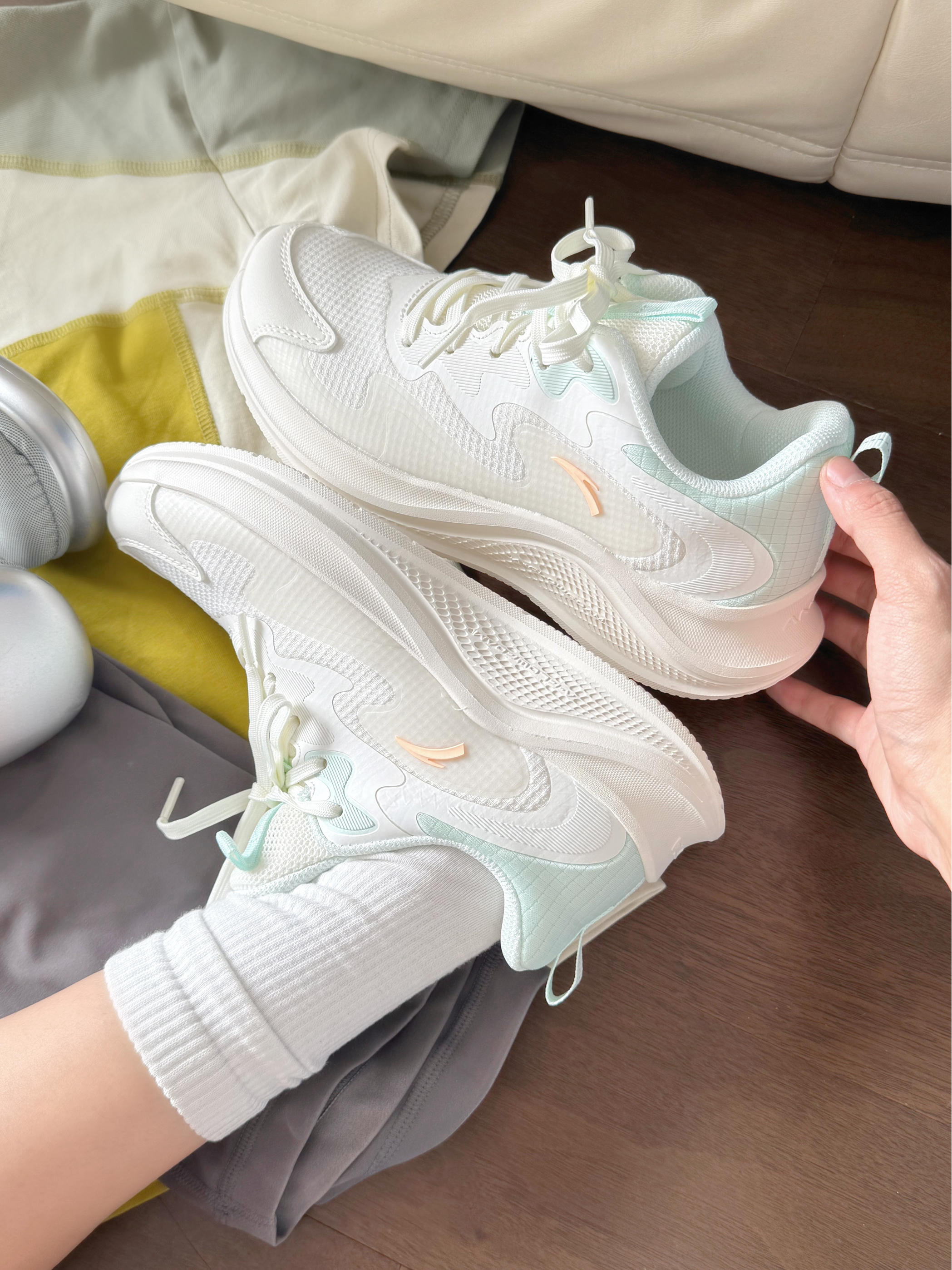 安踏漫步薄荷曼波配色有点泰嫩了吧! 上脚清新又温柔🍃 鞋身轻轻的 穿来运动感觉好轻便呀 这不马上开学啦 备上一双跳绳体测800m穿都是ok滴!