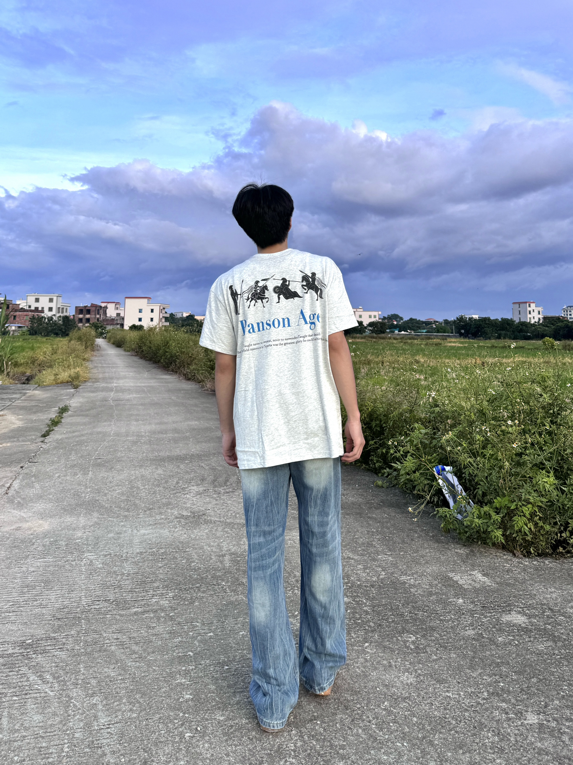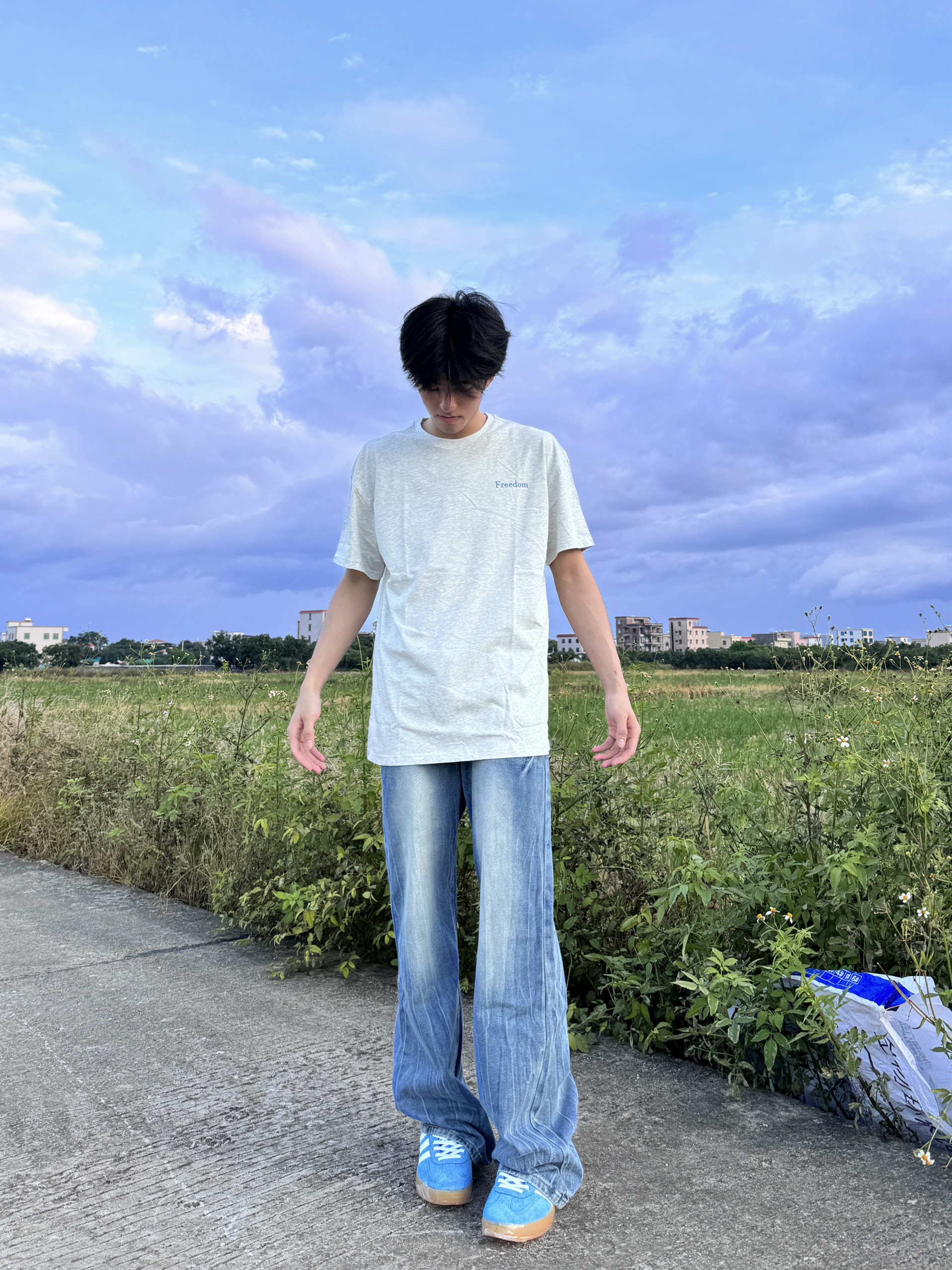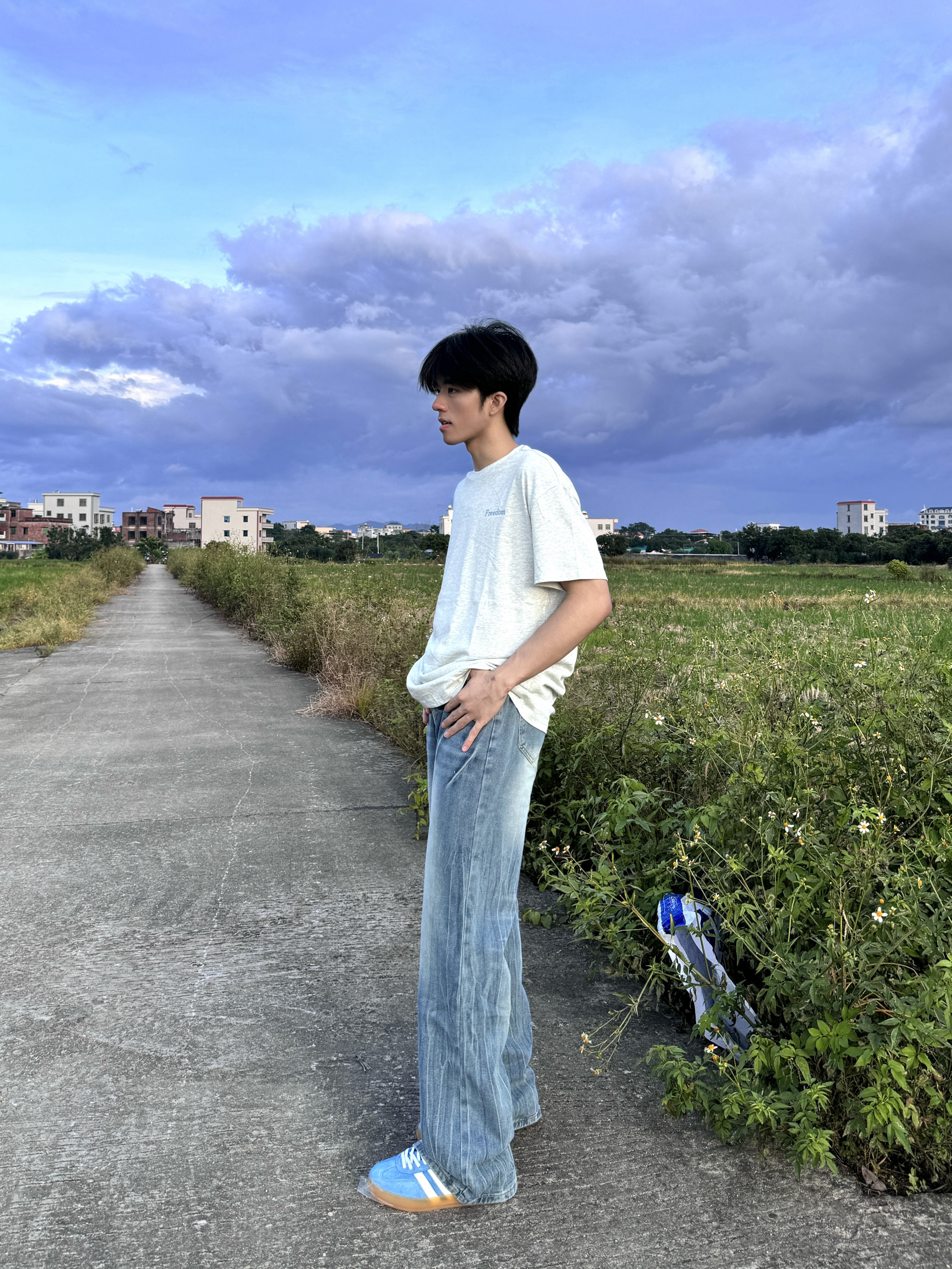 这套穿搭以浅灰色简约短袖搭配浅蓝色阔腿牛仔裤,再配上蓝白拼色休闲鞋,整体风格松弛随性。浅灰短袖简约干净,胸前小字增添细节,宽松版型营造自在氛围;阔腿牛仔裤垂坠感佳,浅蓝色调清新百搭,宽松裤型修饰腿型,行走间尽显洒脱;蓝白鞋子色彩呼应,为整体增添活力,让休闲感更饱满。 从不同角度看,正面展现上衣与裤子的和谐比例,凸显简约大方;侧面呈现阔腿裤的流畅线条,拉长身形;背面T恤的图案为穿搭注入个性,丰富视觉...