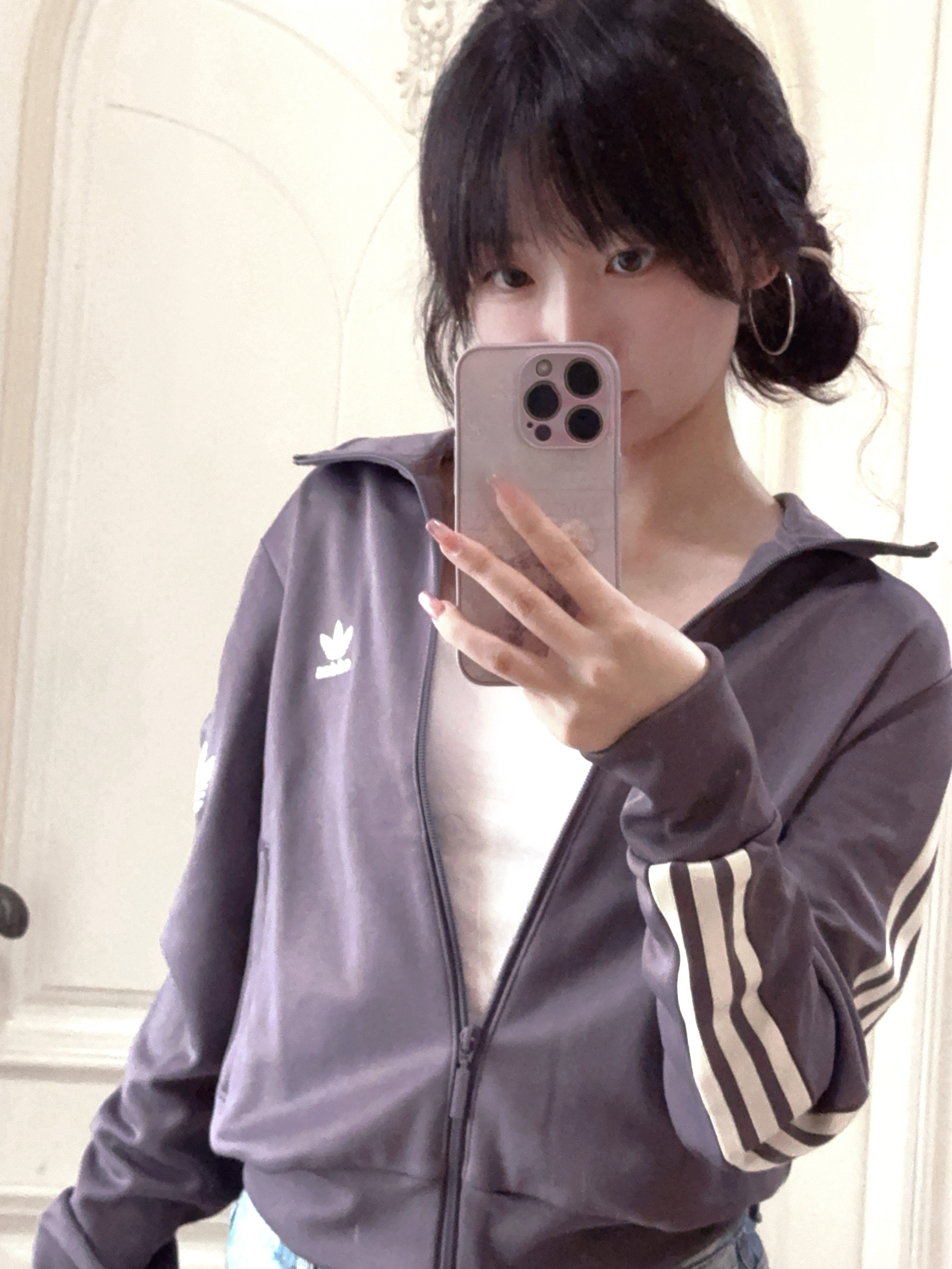 分享一件最近购入的阿迪外套 版型短款收腰 颜色是温柔的香芋紫 面料舒适不厚,适合早秋 轻松搭配就是韩系温柔甜酷风格 早八女大必备