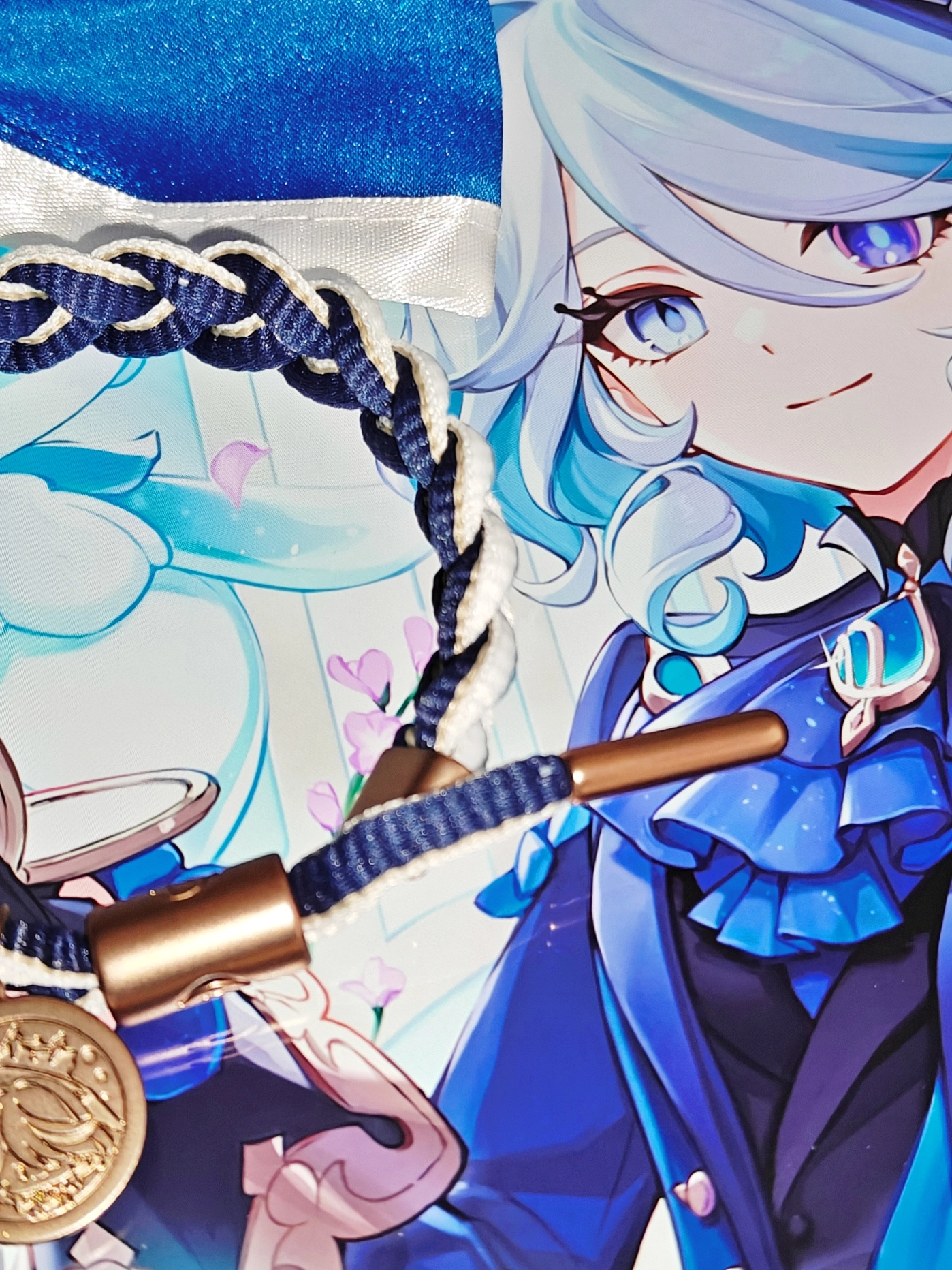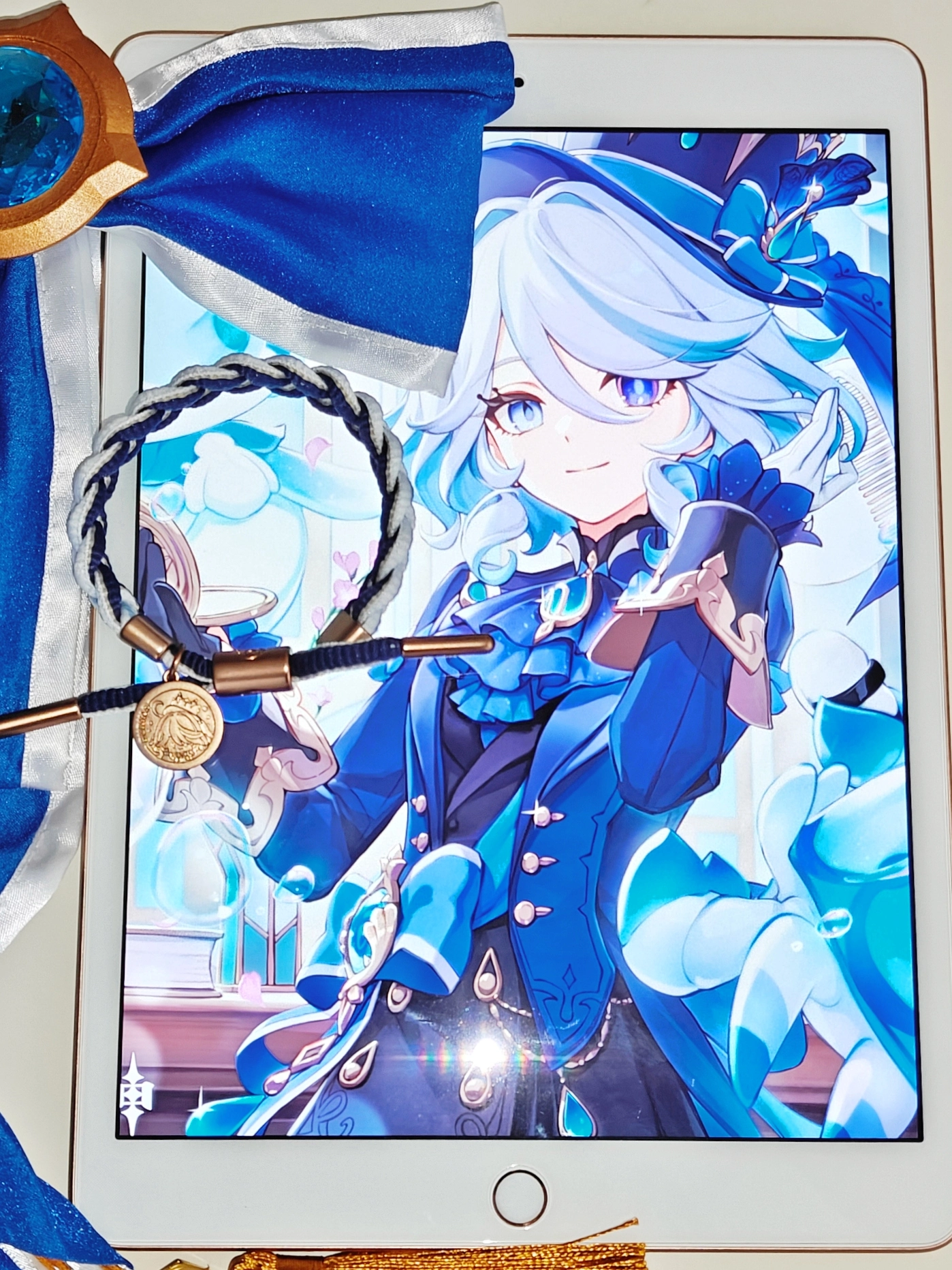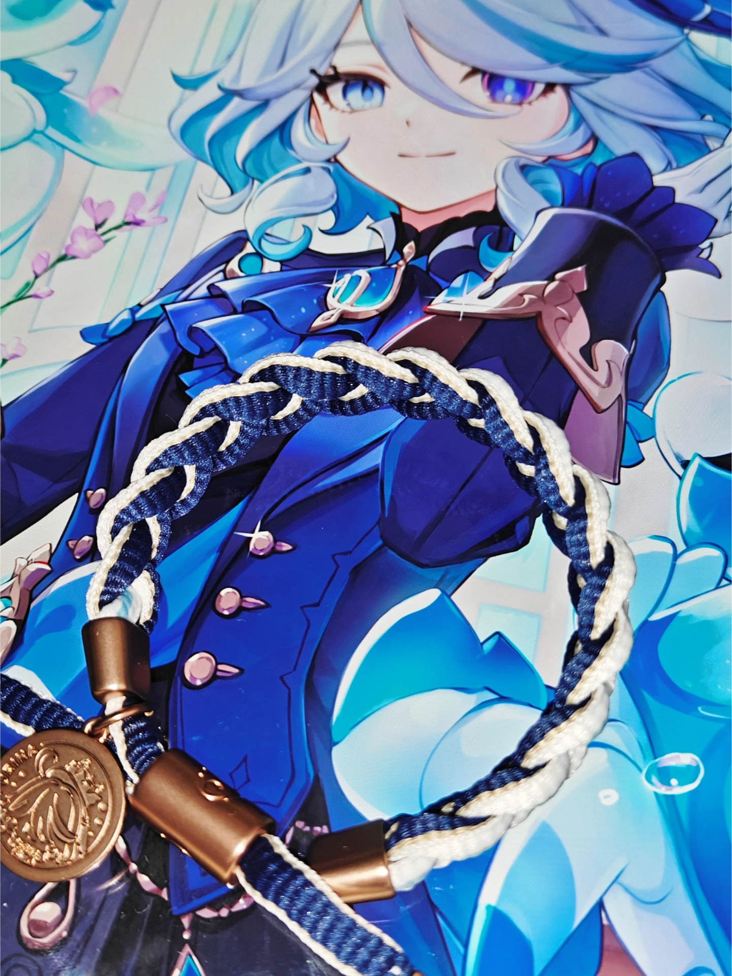我是个原神迷,入了芙宁娜的角色手绳。外圈白内圈深蓝,对应神芙和人芙,含义有意思。 不过手绳材质就是普通混纺。给同是原神粉的朋友当礼物挺合适哒。