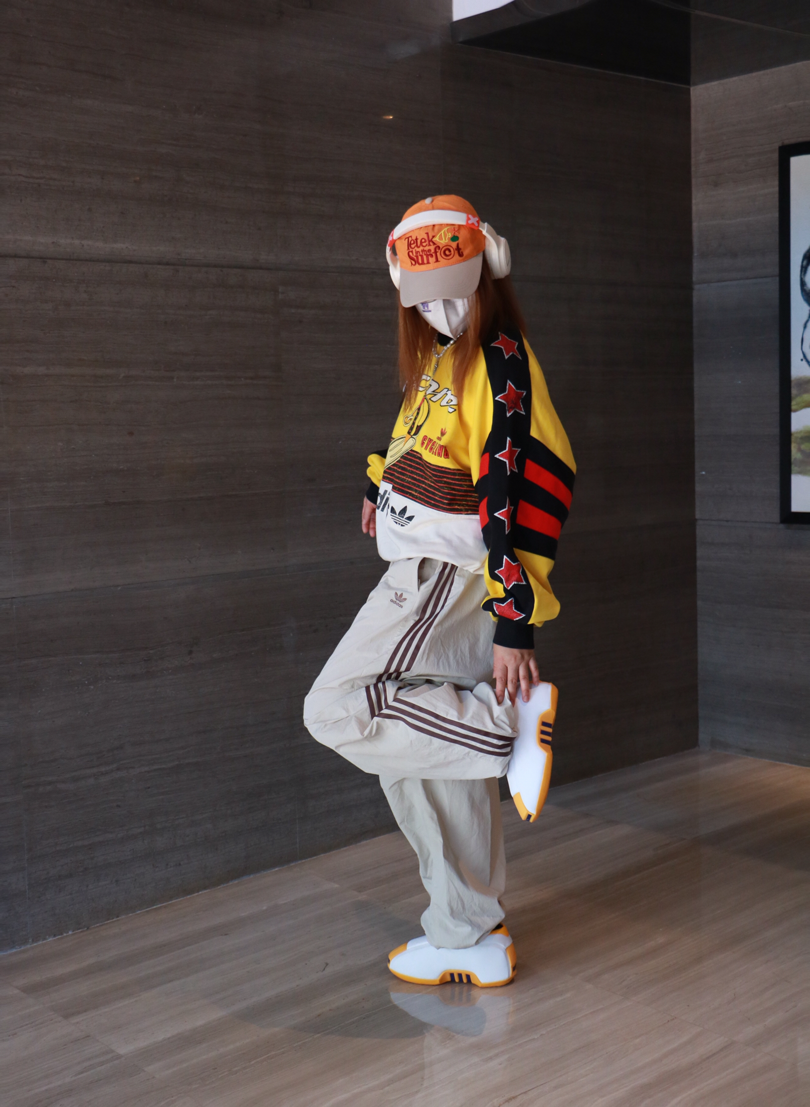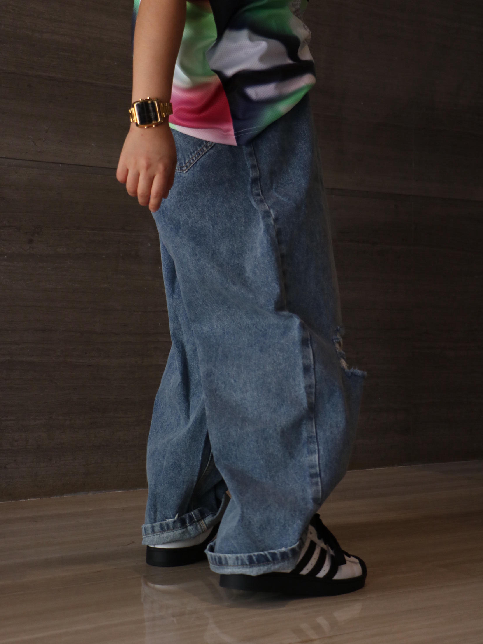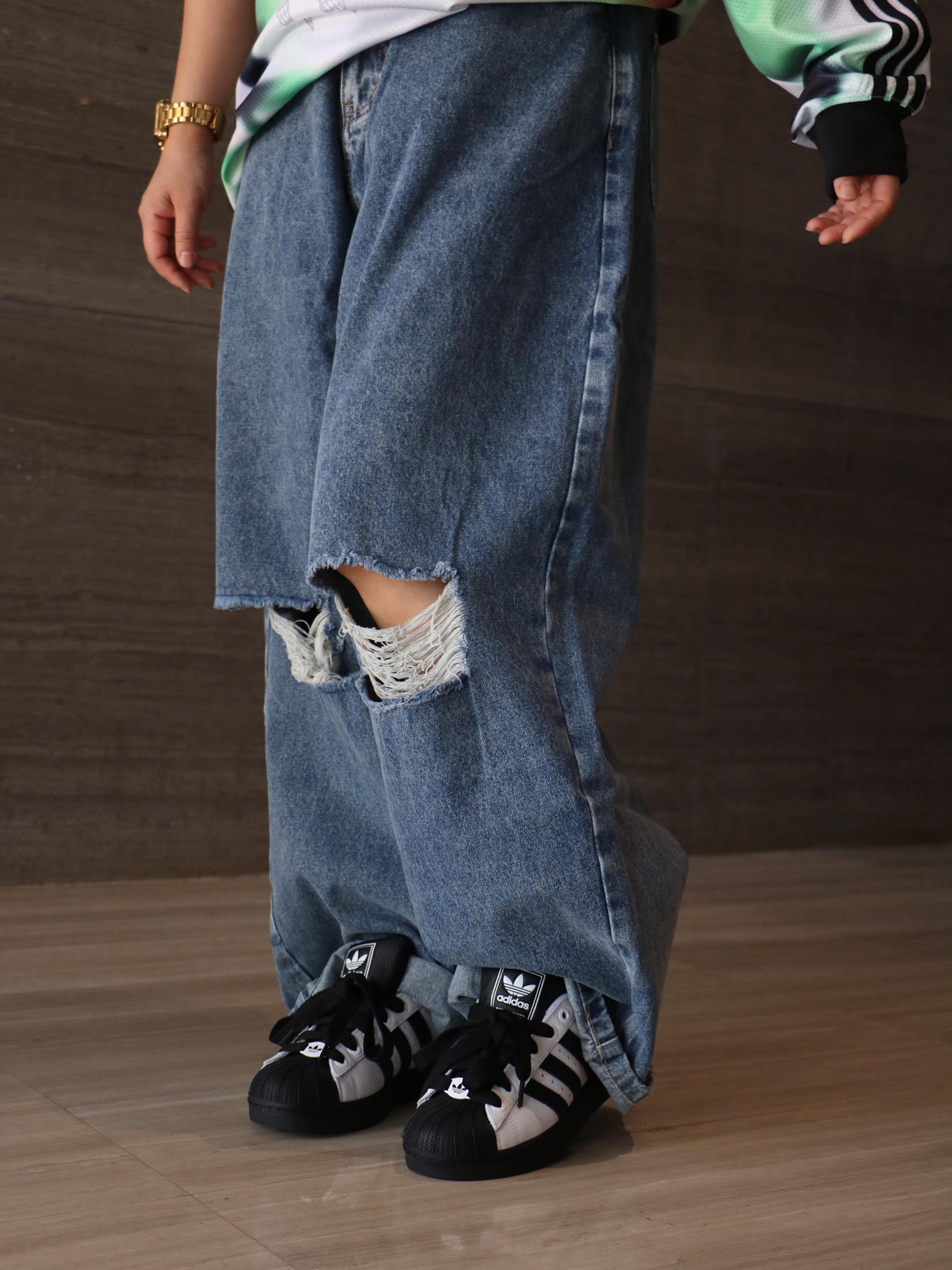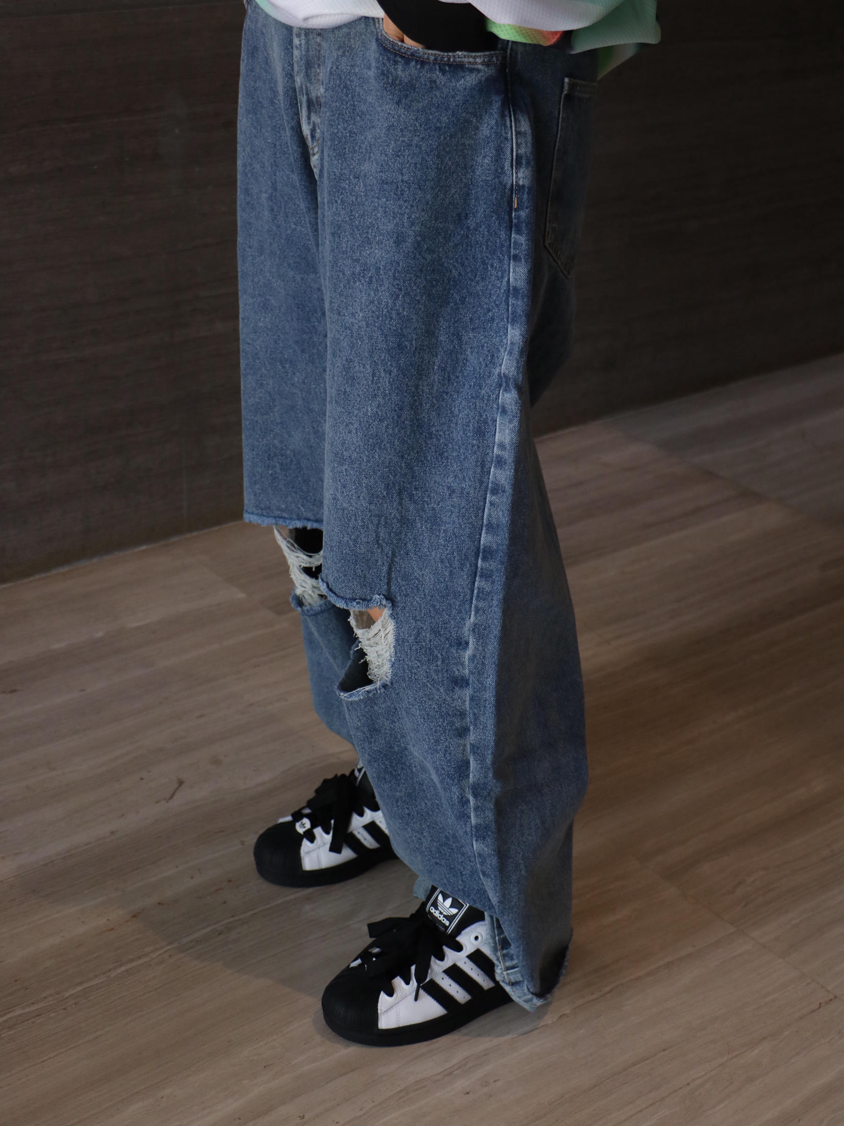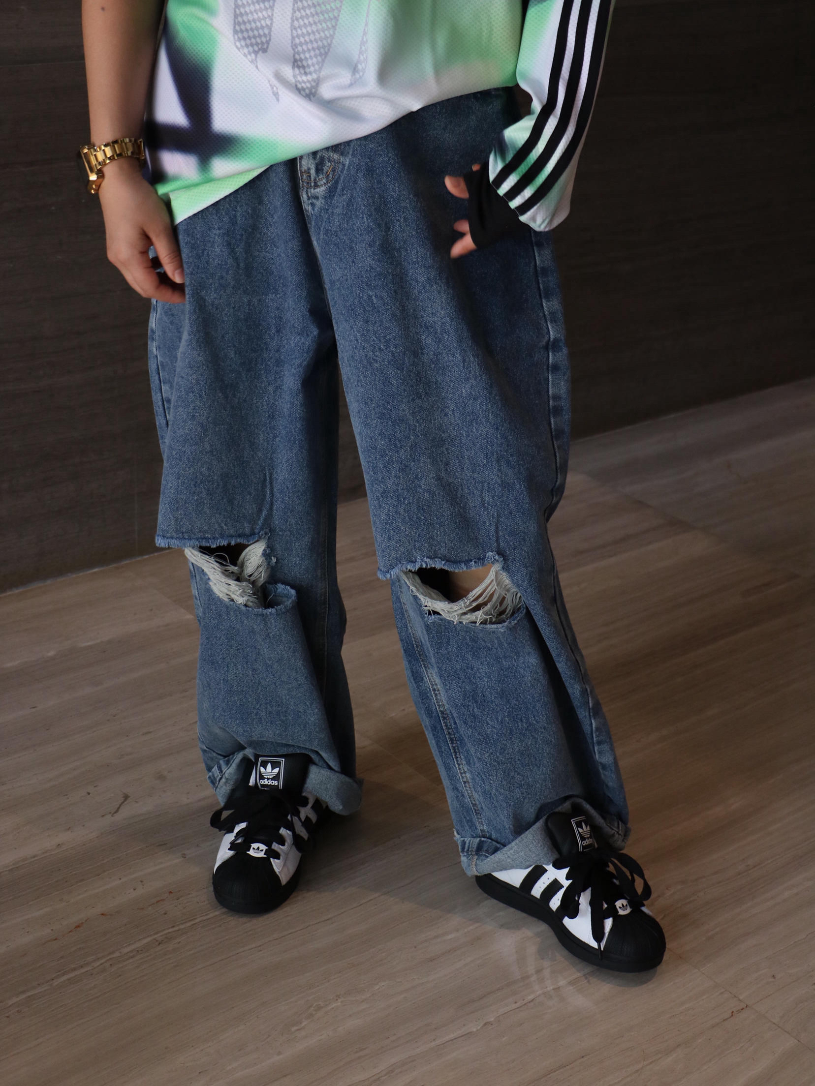 上衣:王安宇同款 拼色印花logo短袖T恤 下装:洗水街头破洞牛仔裤 鞋子:阿迪达斯 贝壳头板鞋