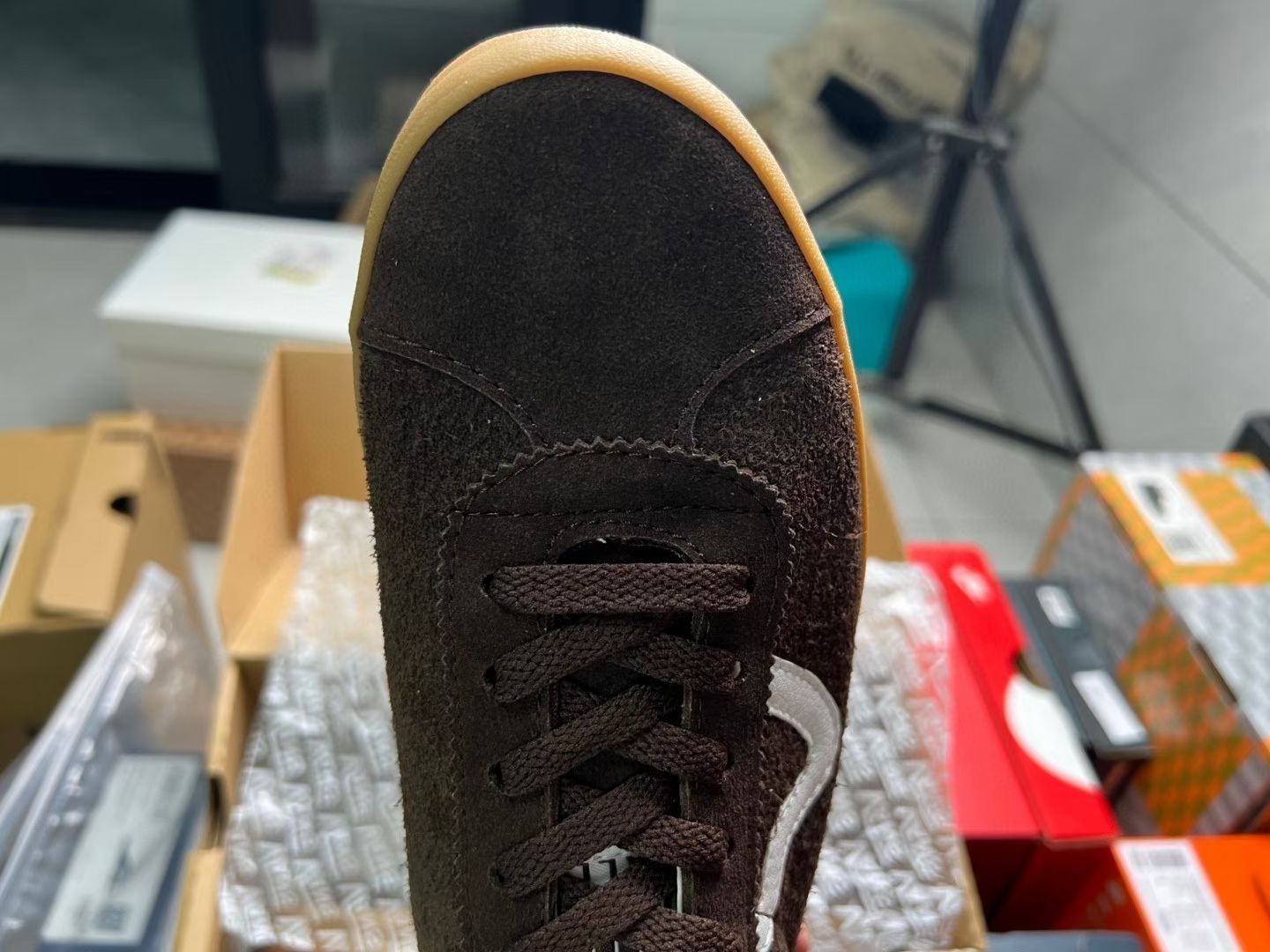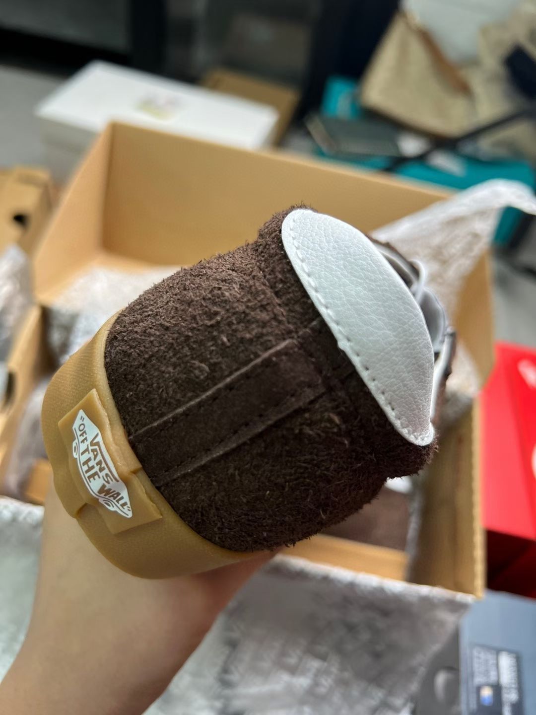 这是Vans的一款经典板鞋,展现了品牌一贯的街头潮流风格 外观设计:鞋面采用质感细腻的棕色麂皮材质,给人一种复古且温暖的感觉,同时也增添了鞋子的高级感。标志性的侧边条纹以白色呈现,形状独特且醒目,与棕色鞋面形成鲜明对比,成为整双鞋的视觉亮点, 彰显了万斯的品牌特色。鞋舌处清晰可见Vans的品牌标识,简洁又具有辨识度。鞋带同样是棕色,与鞋面颜色相呼应,整体风格协调统一。鞋底采用经典的生胶色,不...