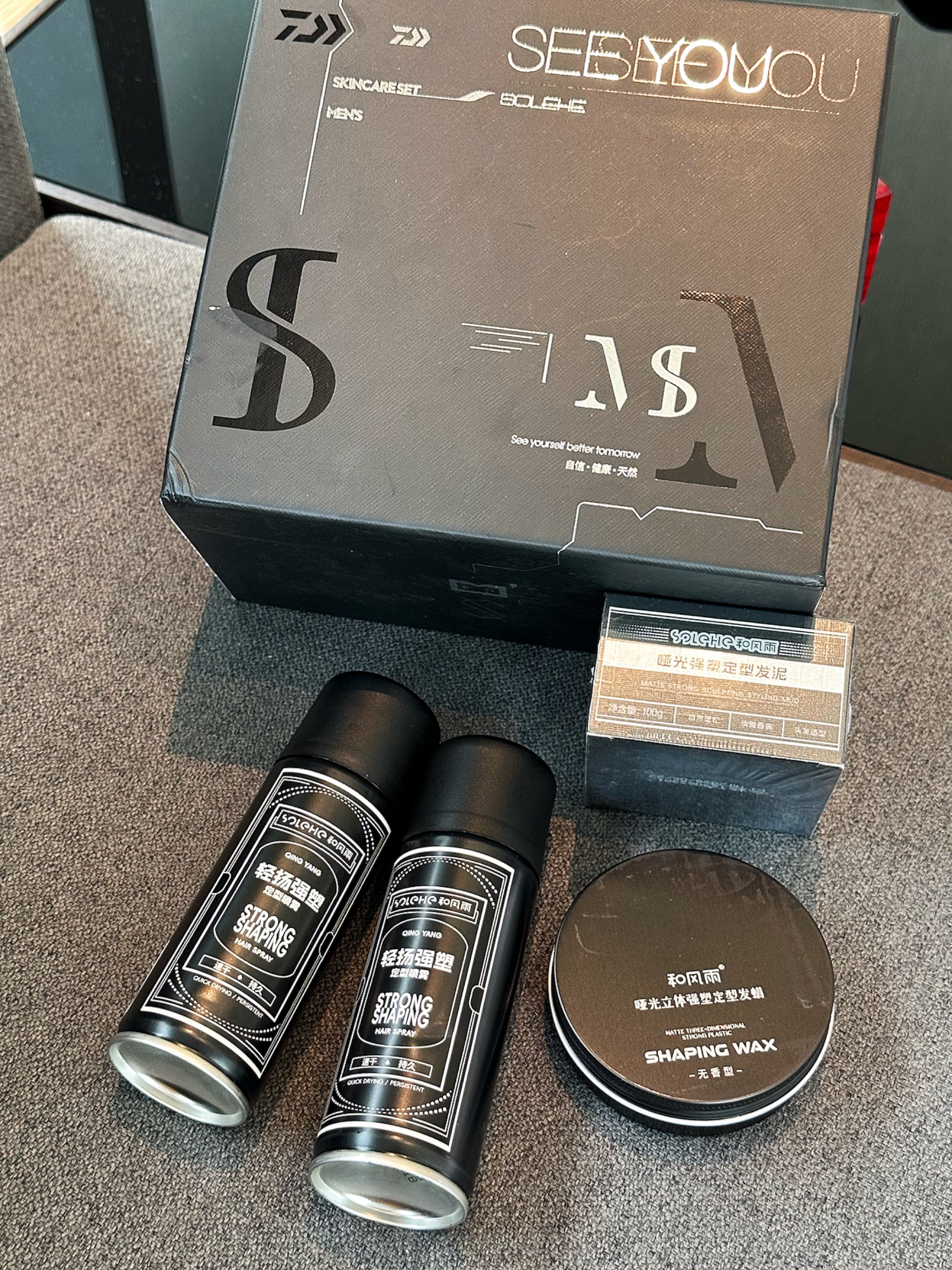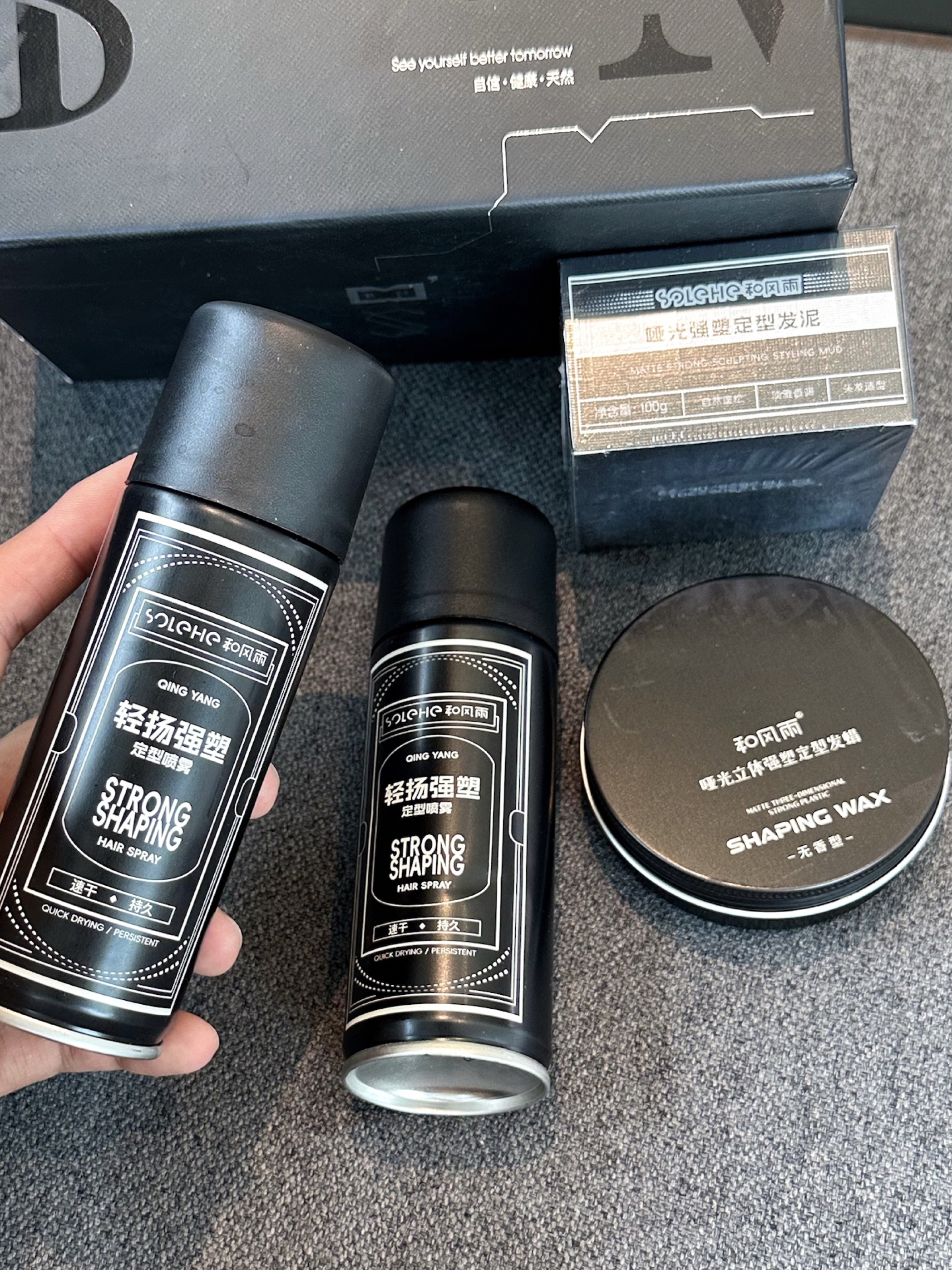 男士发型搞定风格轻松切换 出门发型搞一搞,真的会变得很精神 最近很爱用 SOLEHE 和风雨 家的男士造型礼盒 用起来很顺手,礼盒里有发胶和发泥,包装是简洁黑盒,质感在线,拿来送人也很不错! 这个发泥质地很细腻!做发型定型自然 哑光效果高级,一天下来发型稳稳的 发胶定型力也不错,喷完不会僵硬。 送兄弟、男友这类实用又有面的礼物很有面子!
