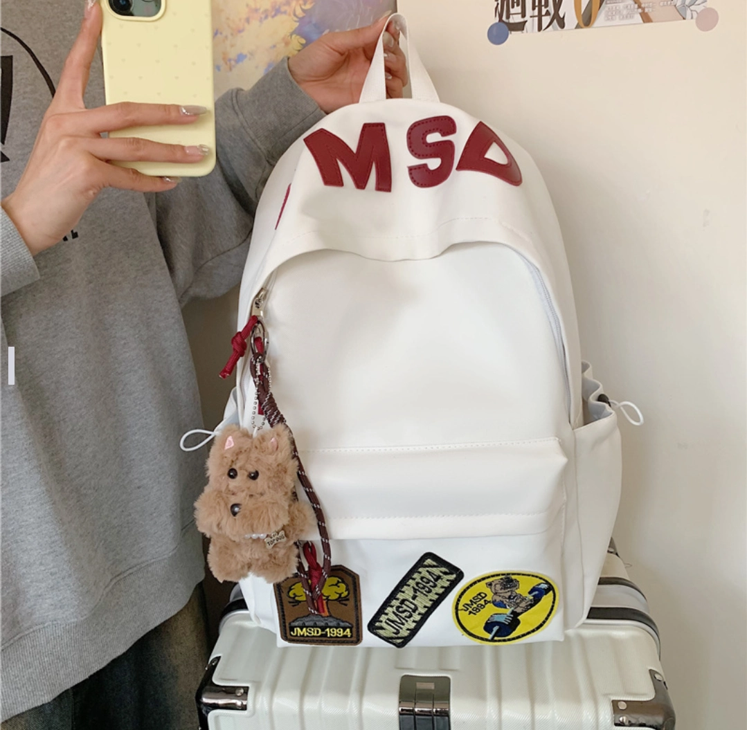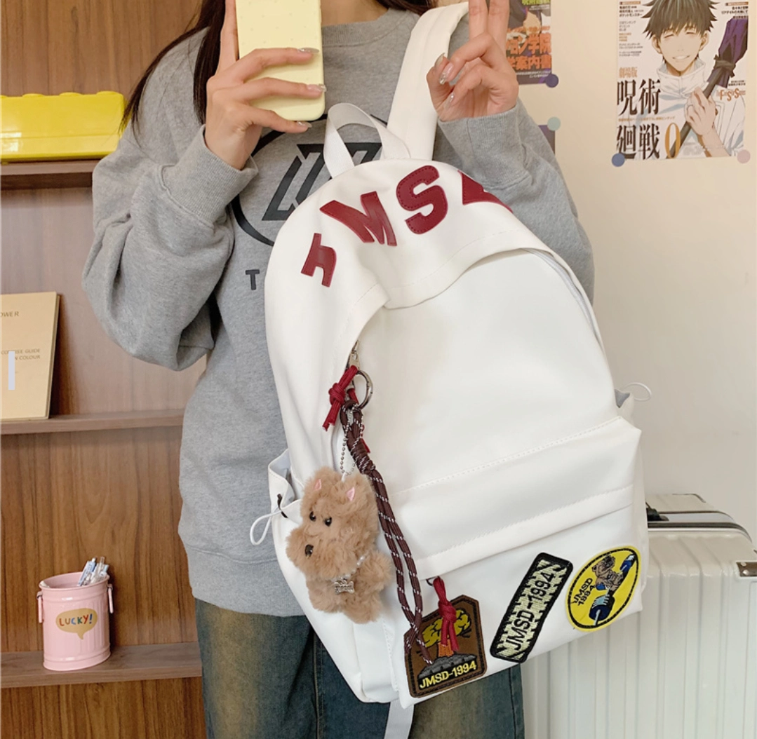一款超爱的双肩包~外观太有美式那味儿了,白色包身搭配红色字母,还能自己贴些个性小徽章,背出去超独特! 像我这种学生党或者上班族日常通勤都很合适,旅行背着也不错。容量也够大,能装下不少东西。 它价格也合理,性价比挺高。不过有个小缺点,就是没有夹层,东西多的时候找起来有点麻烦。 但总的来说,这样的风格真的很符合当下流行趋势,喜欢美式风的宝子可以冲!