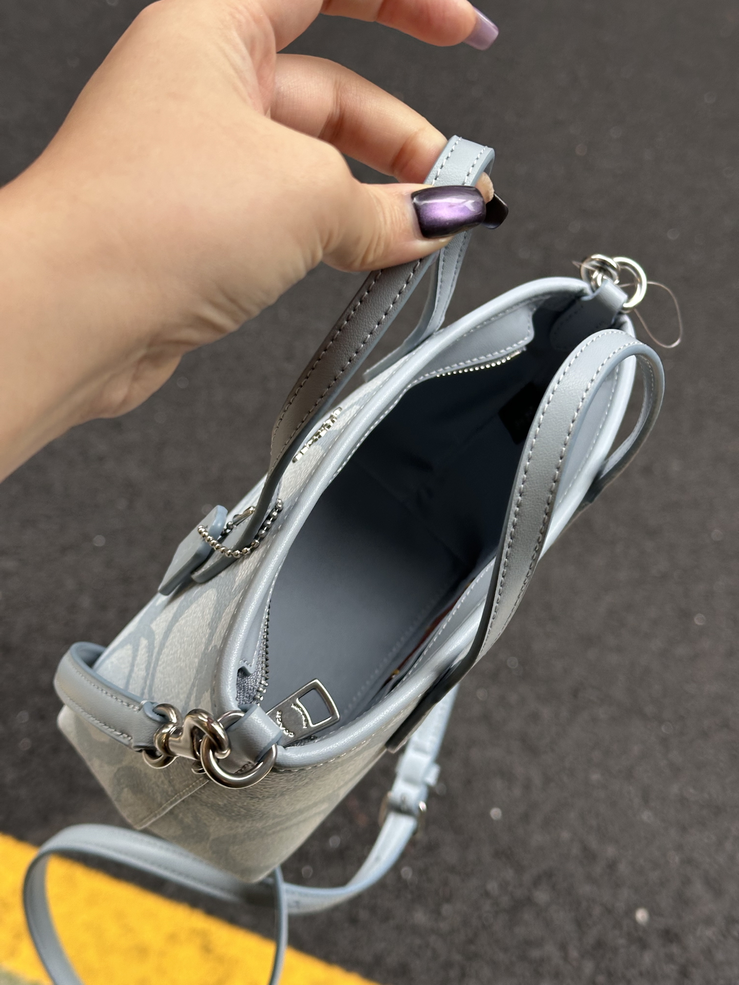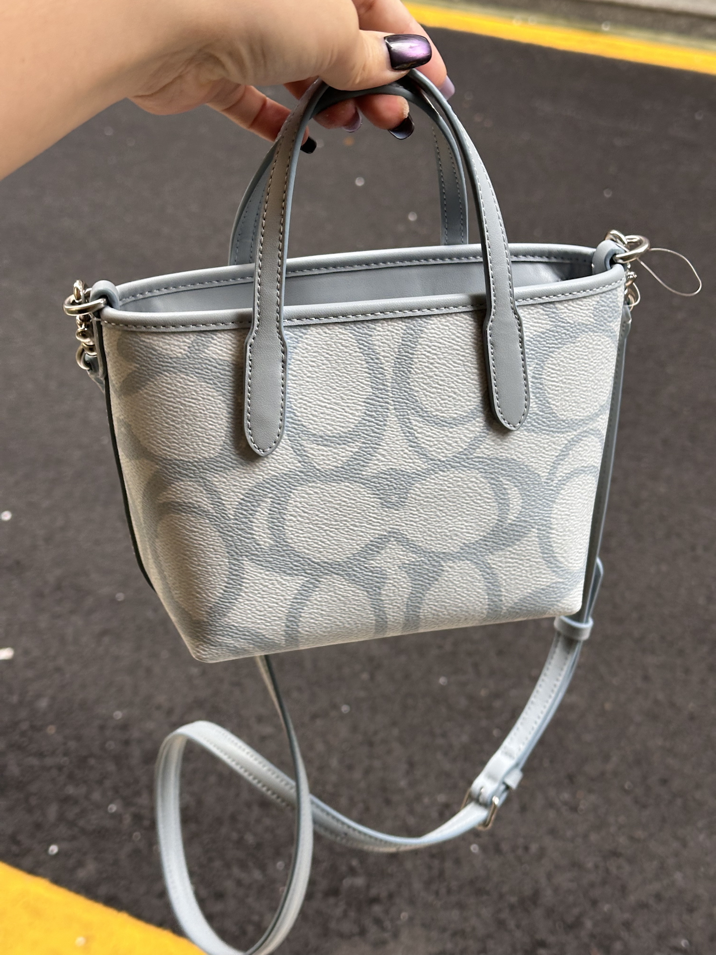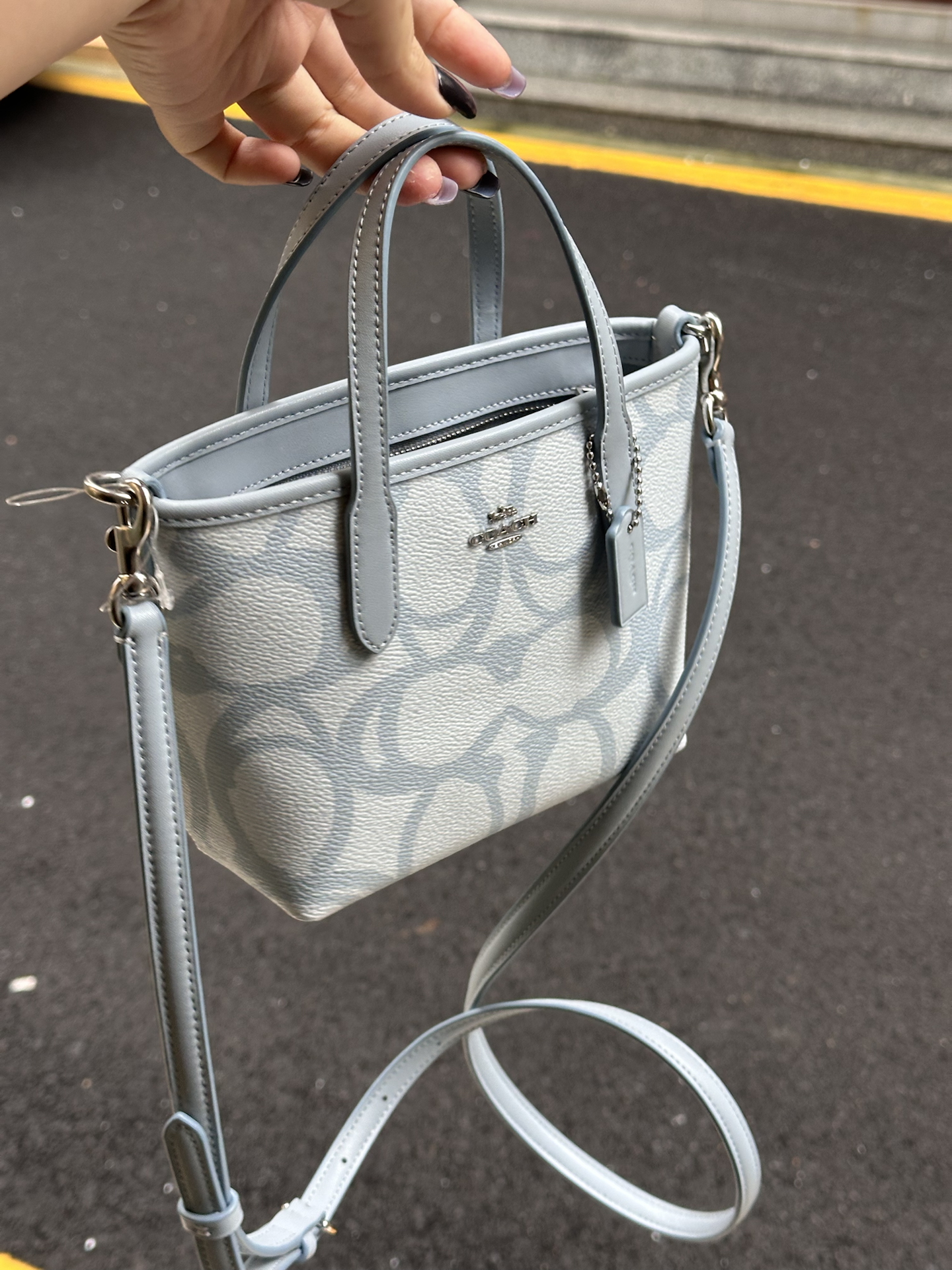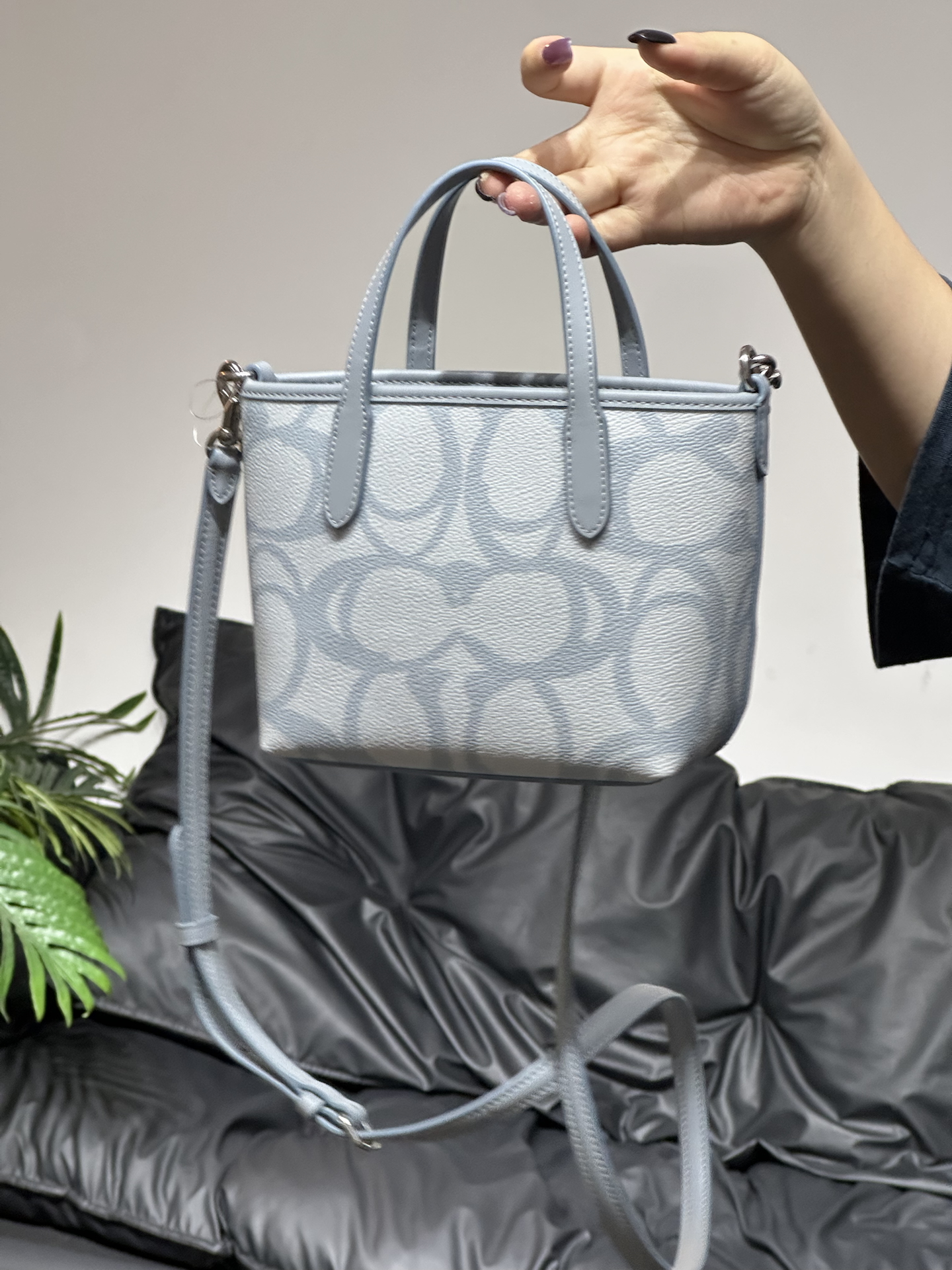 本篇笔记关联了Coach City 16 迷你 银色金属徽标标志涂层帆布购物袋单肩托特包手提包 冰蓝色等商品,为用户提供真实的使用体验和购买参考。