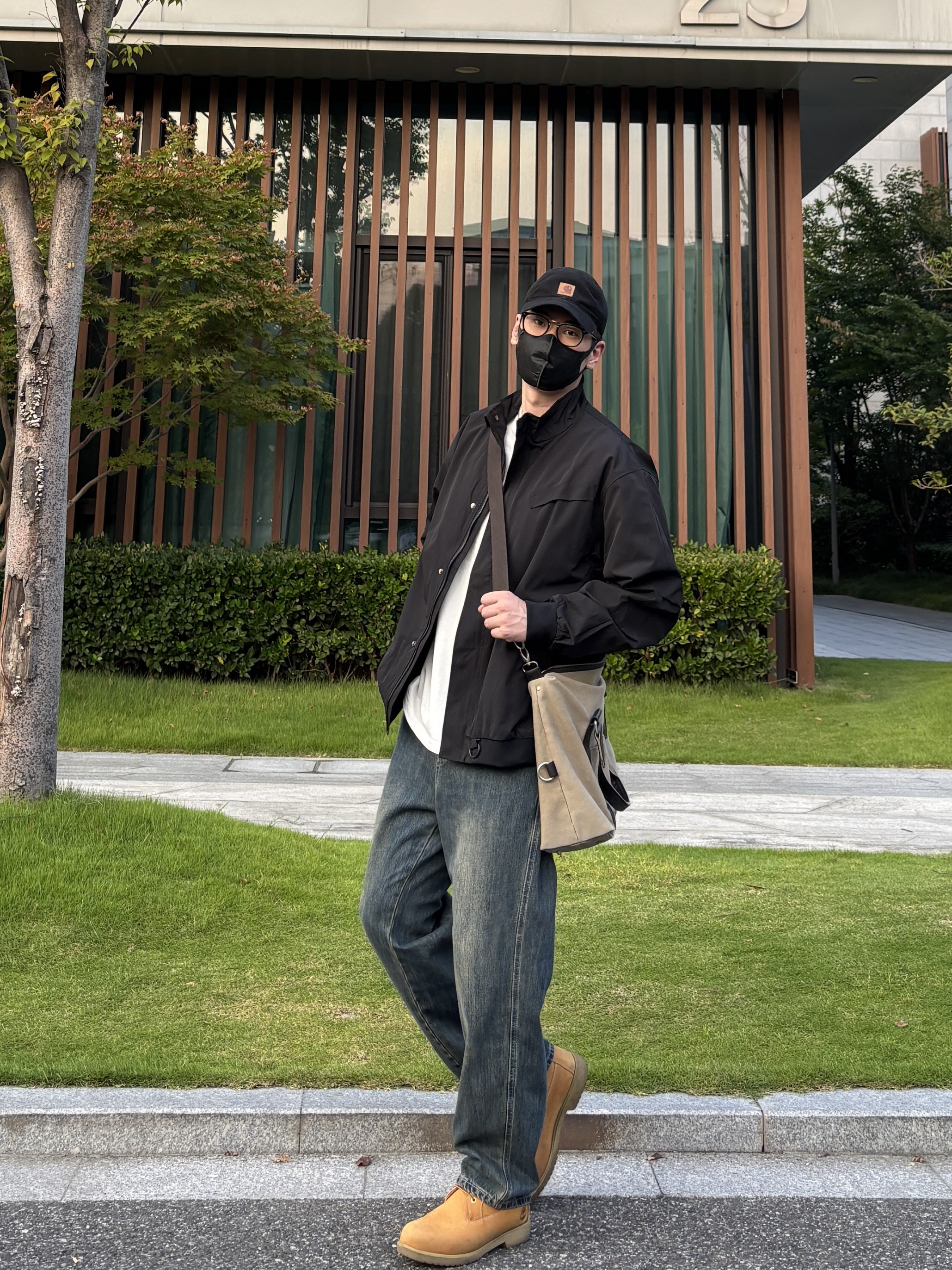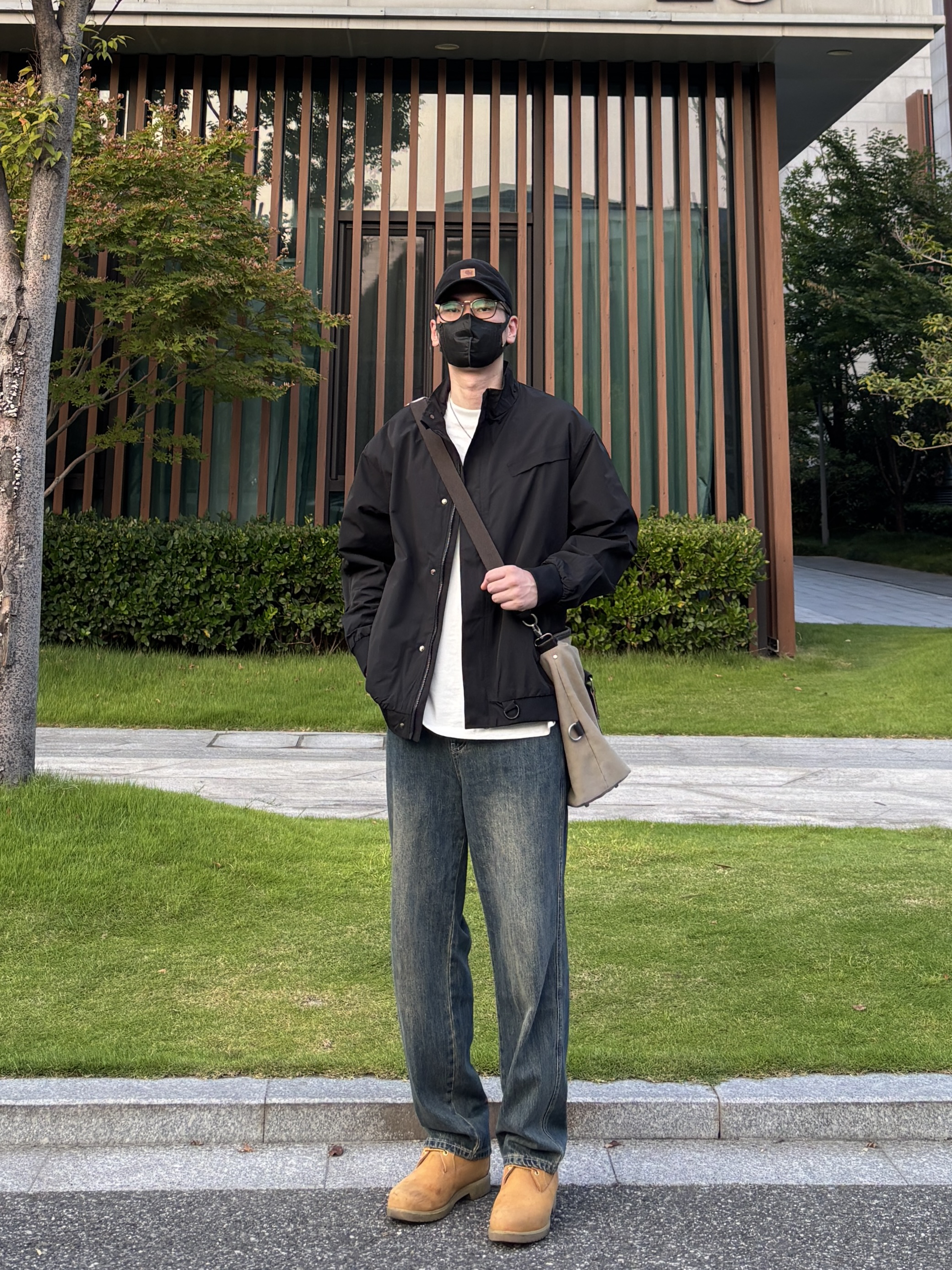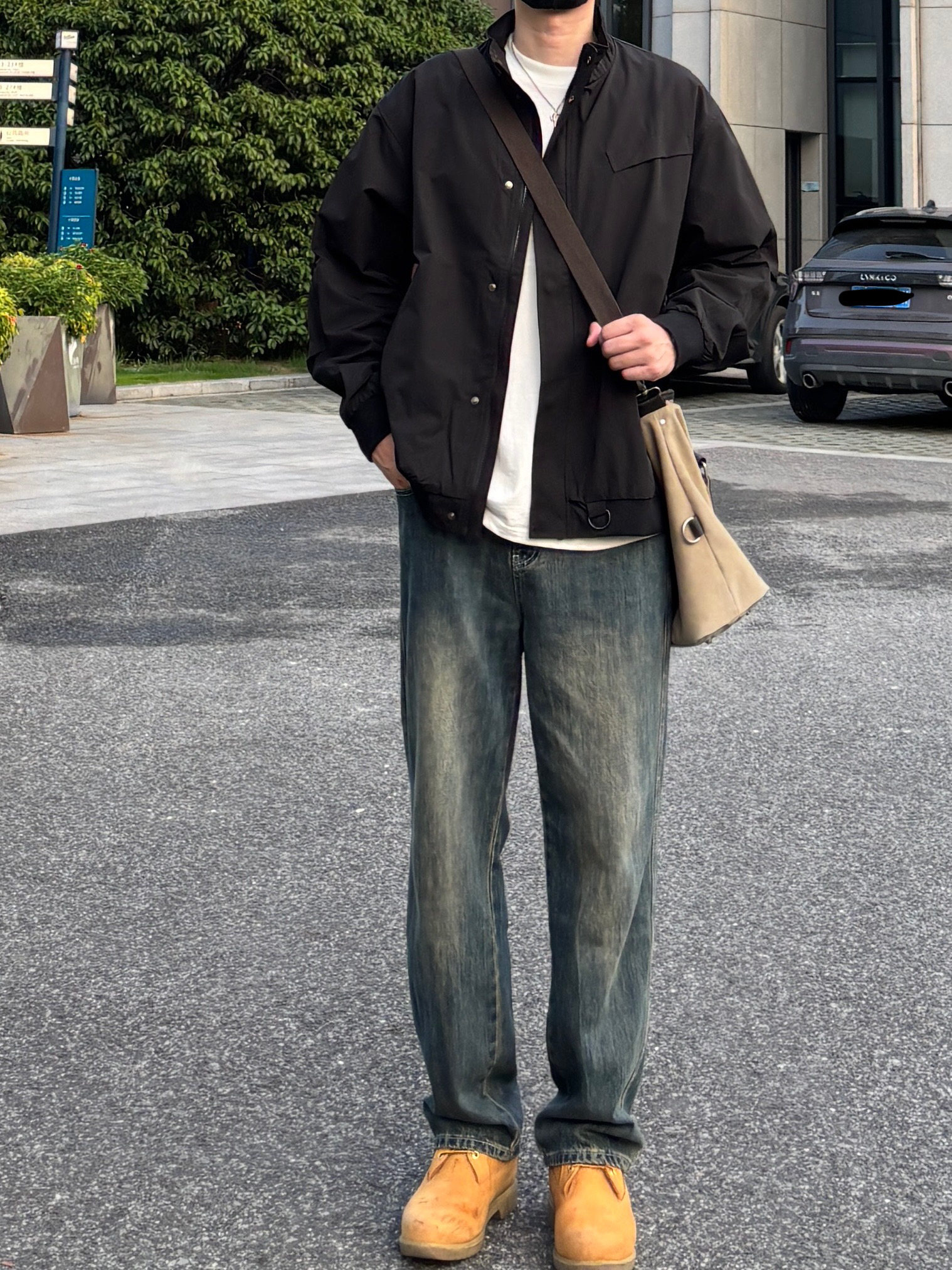 今天这套上衣穿了一件黑色宽松阔版防风立领工装夹克 ⬇️ 裤子选择不挑腿型的蓝色直筒水洗复古牛仔裤 ⬇️ 鞋子上脚硬汉必备的timberland工装靴 ⬇️ 最后背上卡其色帆布拼接手提斜挎包 - 今日搭配 衣服裤子:NICE LILI 鞋子:timberland