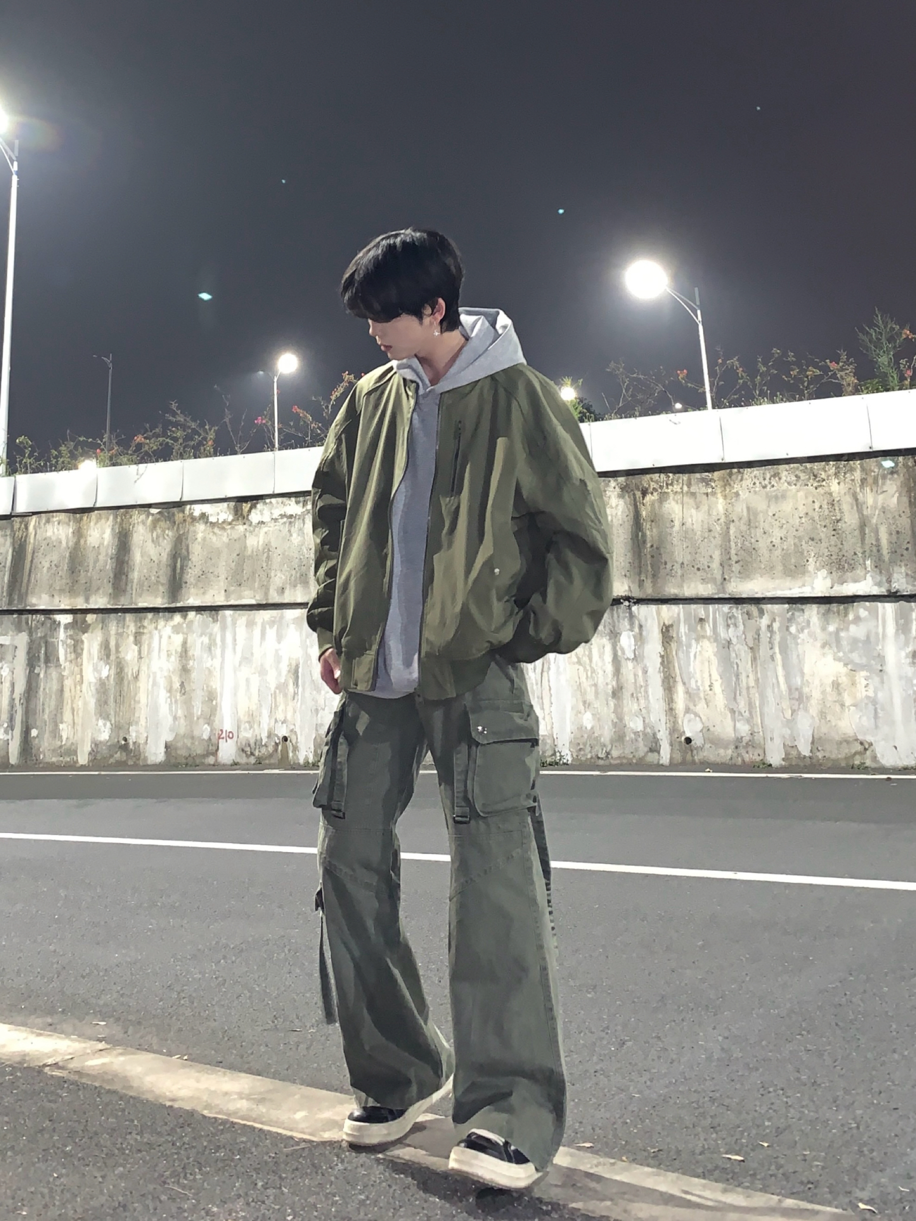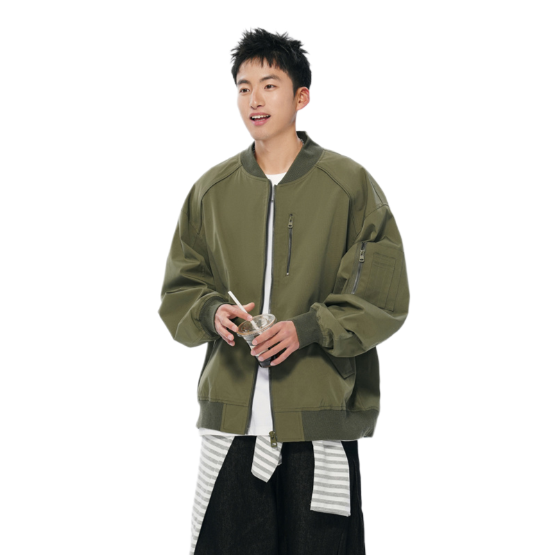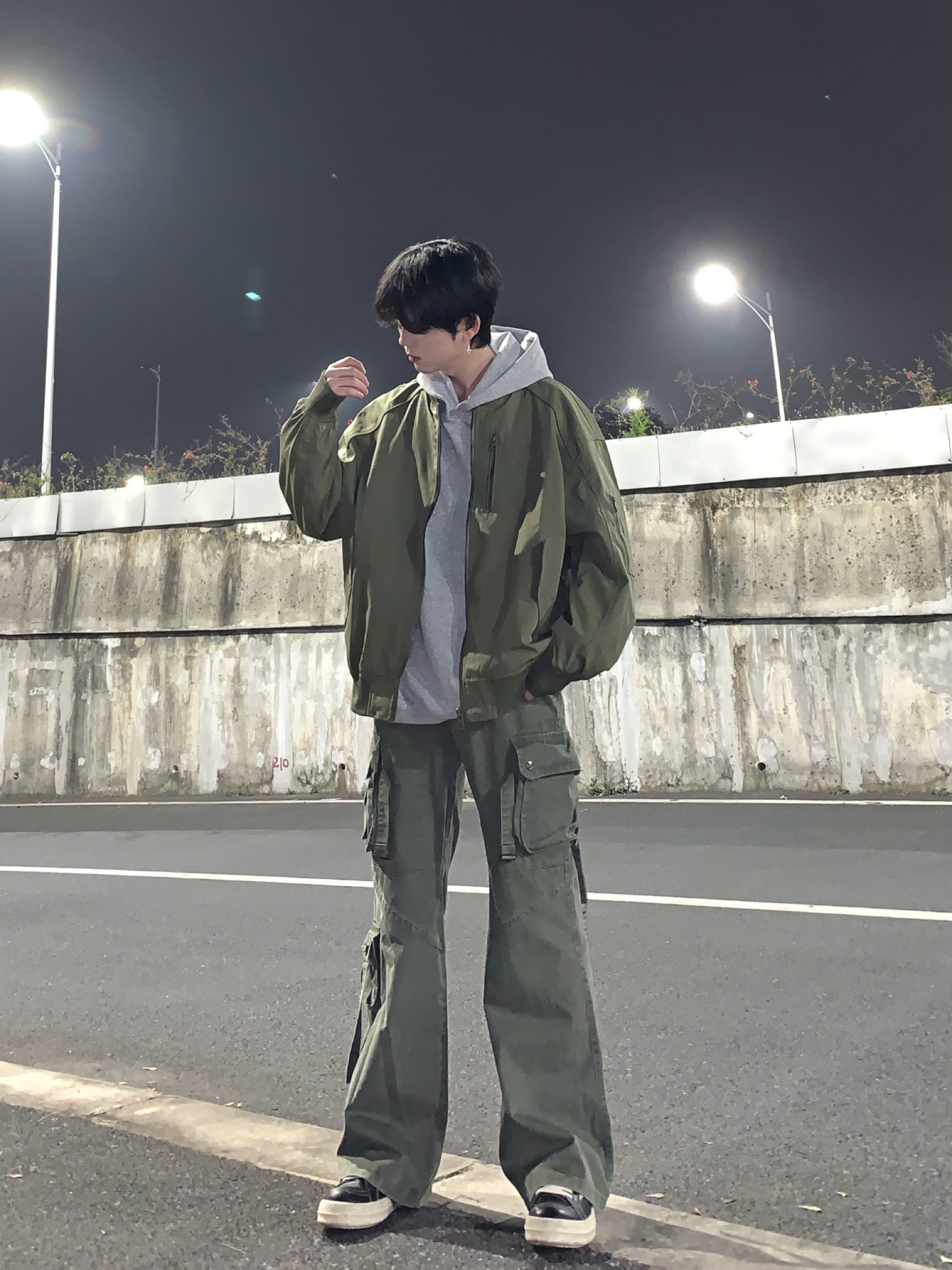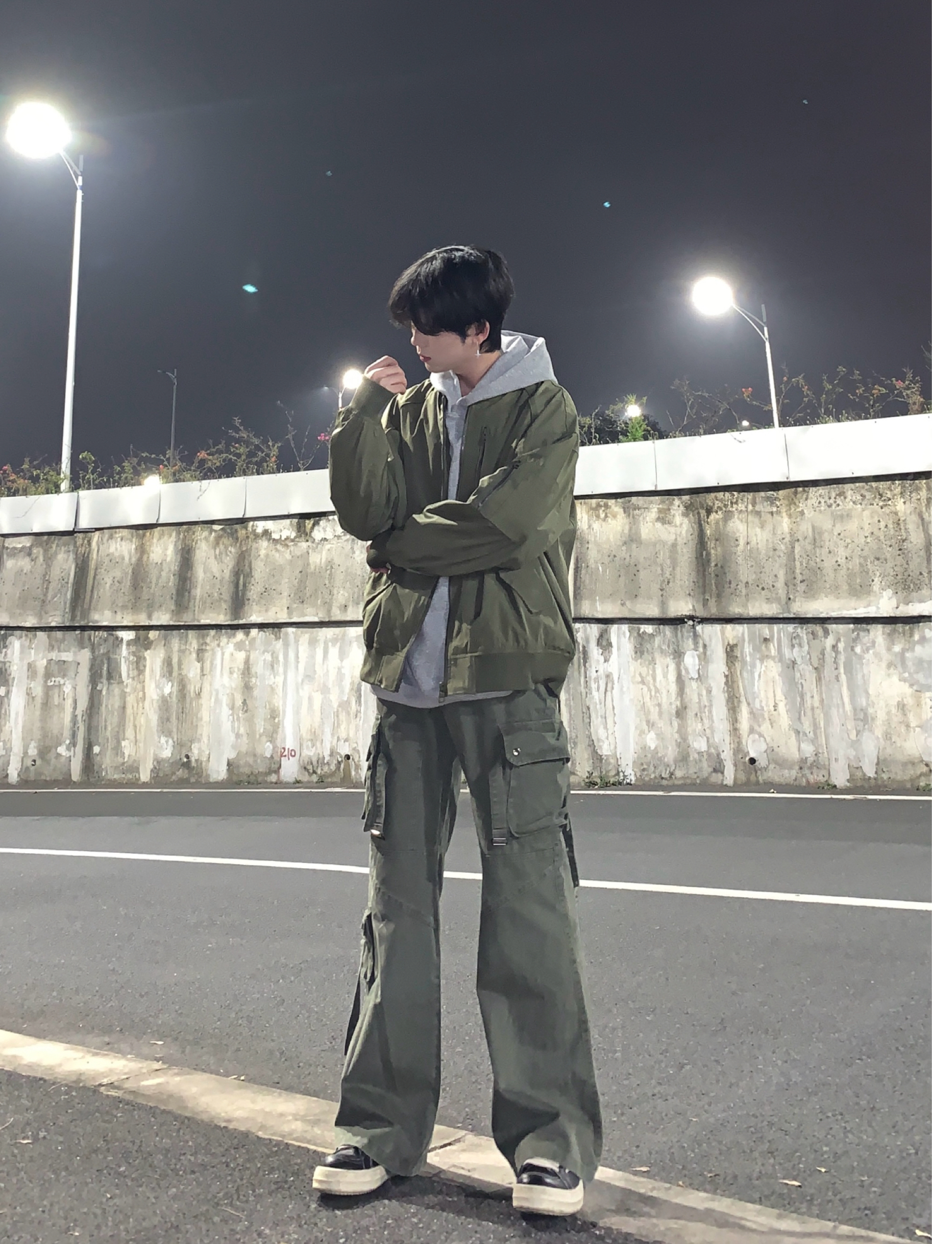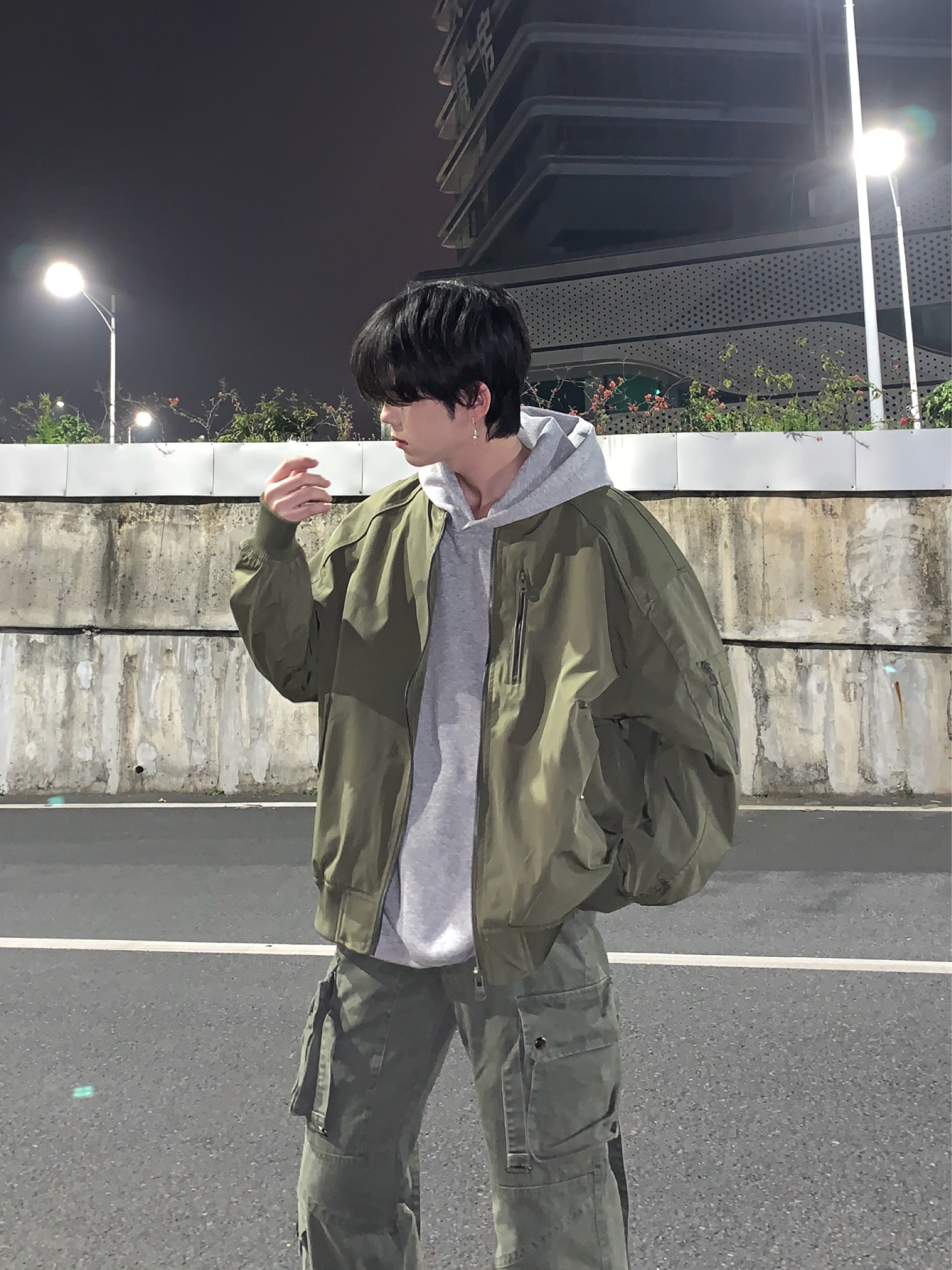 上身一件军绿色美式立领夹克 衣服短款版型穿上很显身型 面料顺滑有质感 袖口拉链设计点缀金属元素 日常出门单穿或者叠穿一个连帽卫衣叠穿都是氛围感满满!