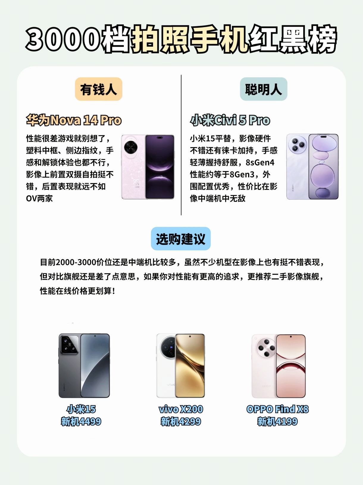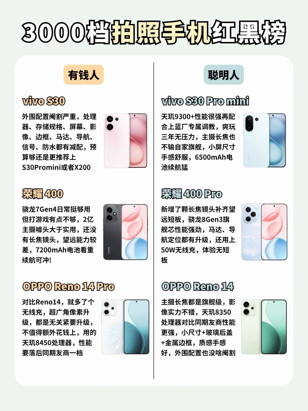 谁在3K价位乱卷拍照啊?!实测6台爆款机型 「有钱人版」和「聪明人版」作业直接抄👇(附实拍样张对比) ▪️黑榜|谨慎入手⚠️ 「vivo S30」— 阉割到只剩颜值 处理器/屏幕/影像/信号全面缩水 不如加几百上S30 Pro mini或X200! 「荣耀400」— 2亿像素噱头>实用 玩游戏掉帧明显❌无长焦镜头 虽然续航顶,但拍照党慎冲 「OPPO Reno14 Pro」— 反...