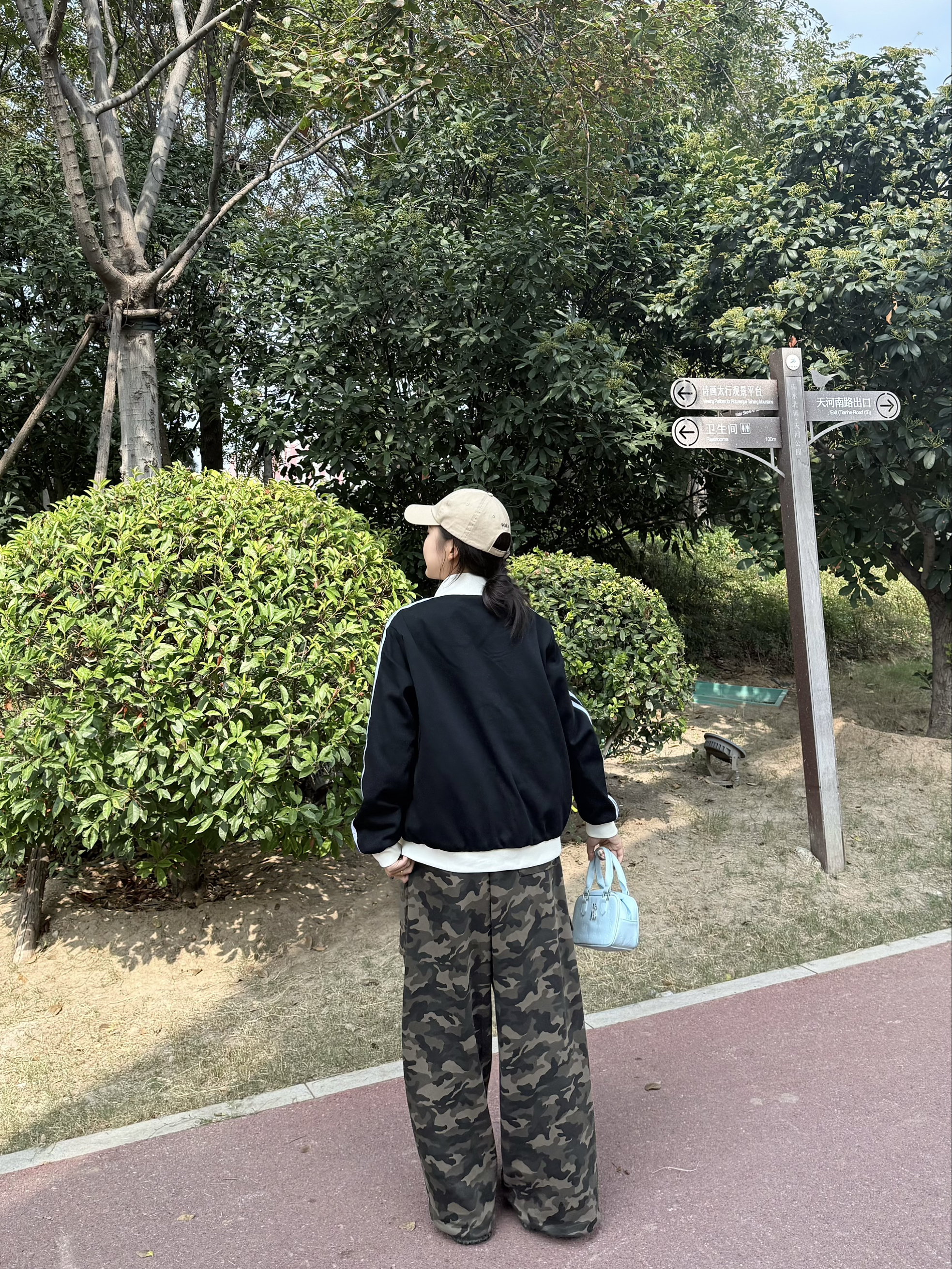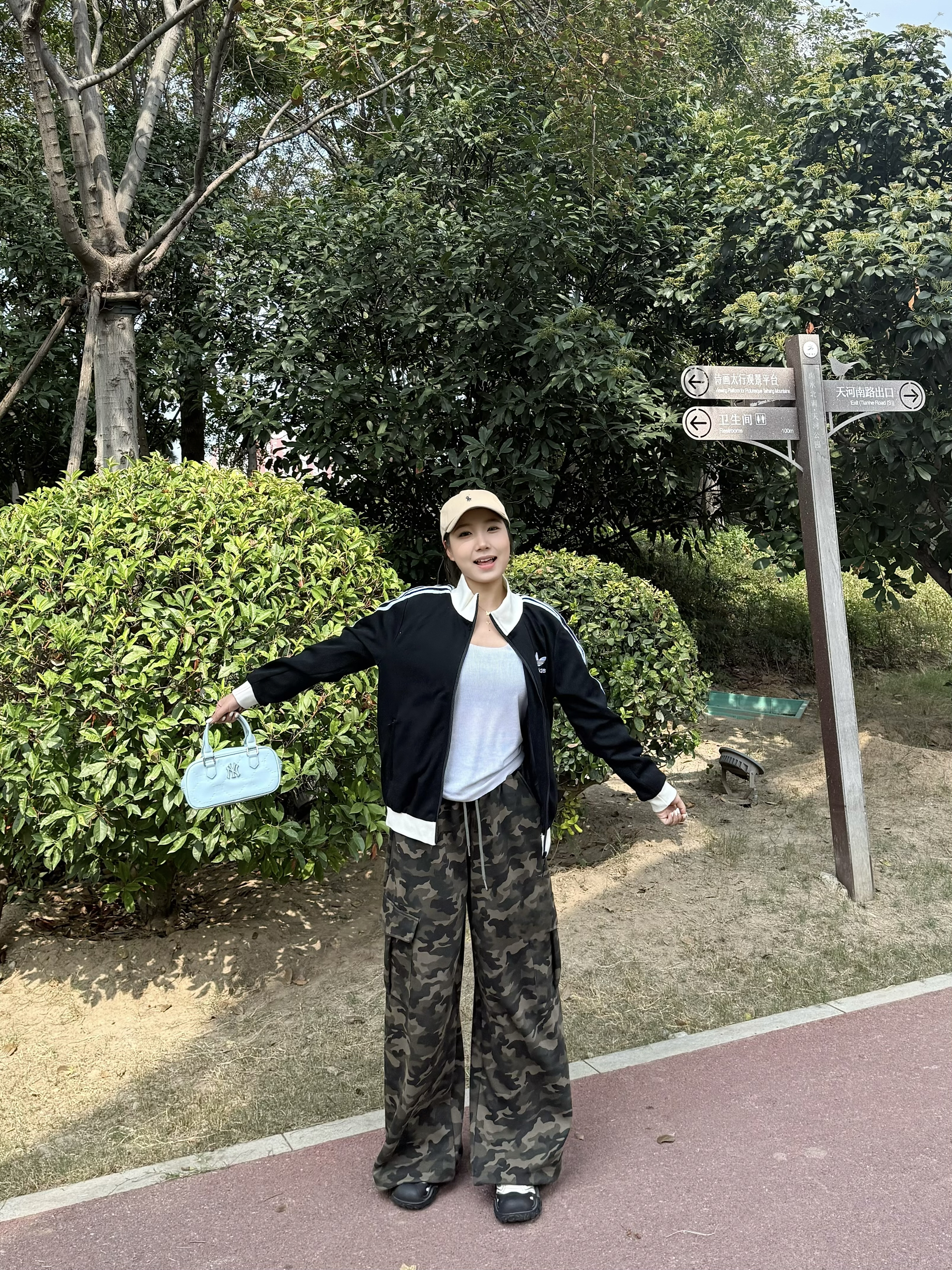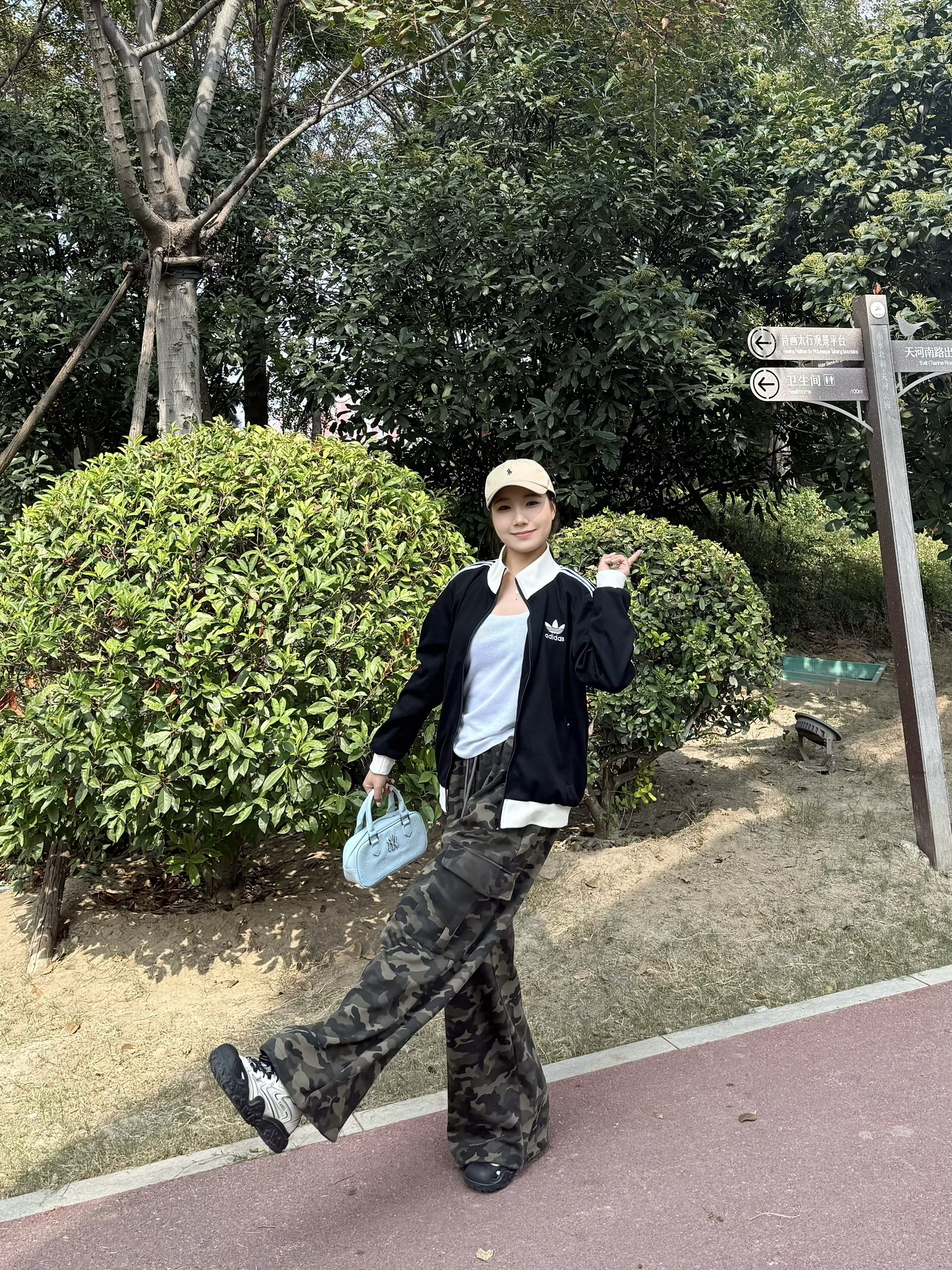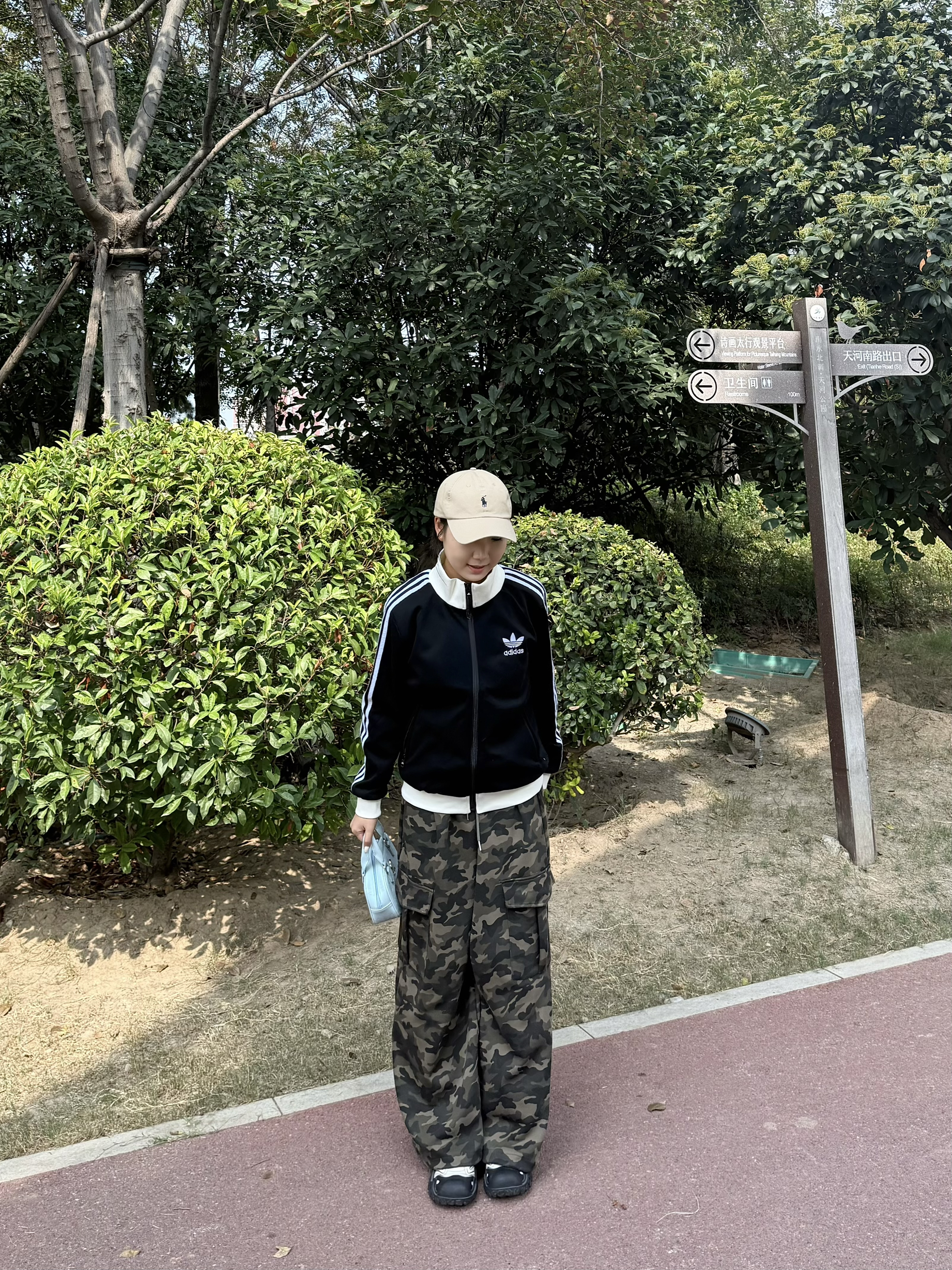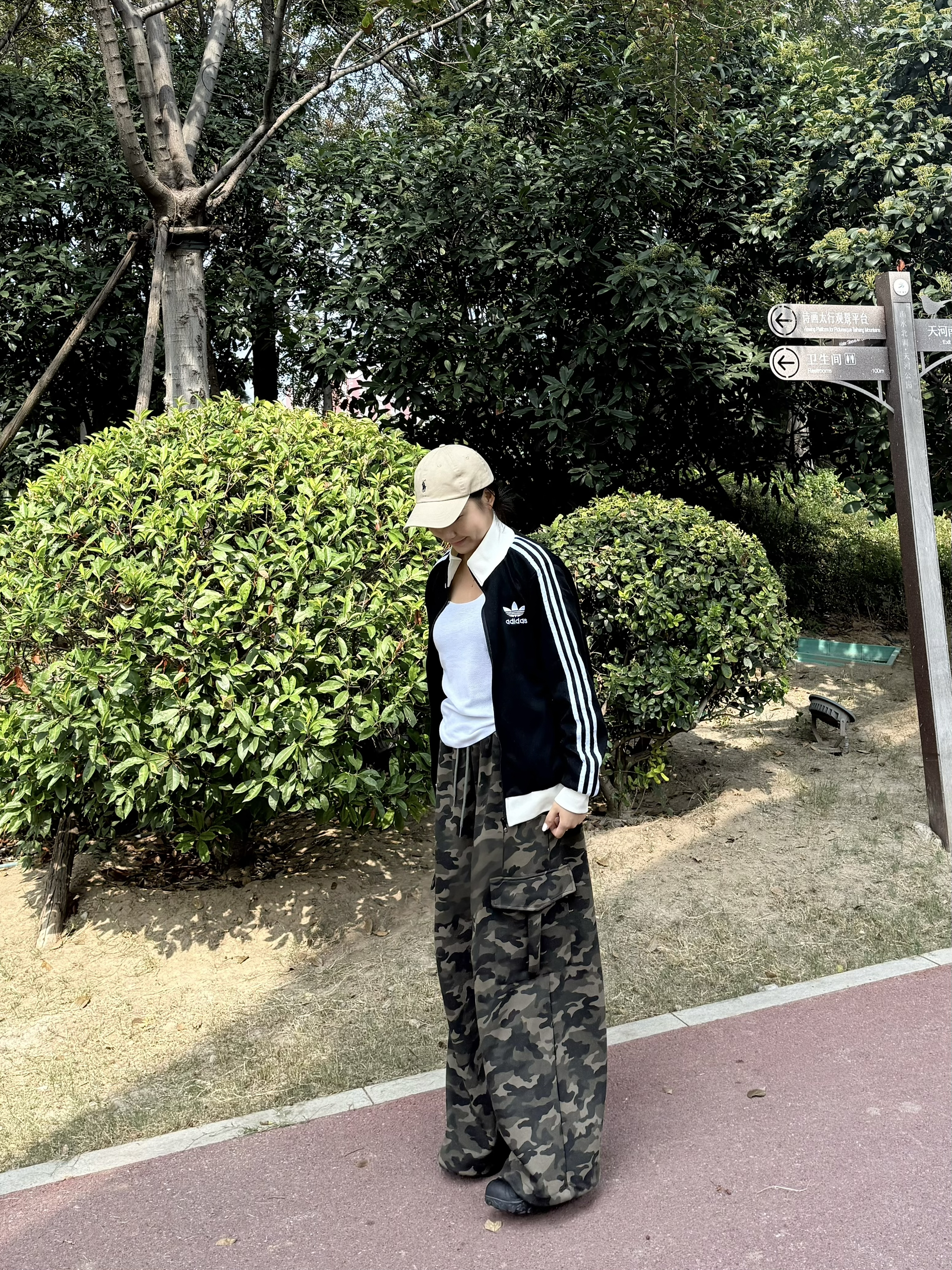 经典三叶草黑色外套,简约又有范儿,宽松版型藏肉又舒服,日常穿太戳我啦~ 内搭白色小衫,搭配迷彩阔腿裤,街头感拉满🌬️ 走路带风超显腿长,浅蓝小挎包一拎,卡其帽一戴,松弛感直接拉满💨 在绿树成荫的小路上随性站,随手一拍都是运动感大片📸 这种舒服又A的穿搭,逛公园、运动出街都超适配!
