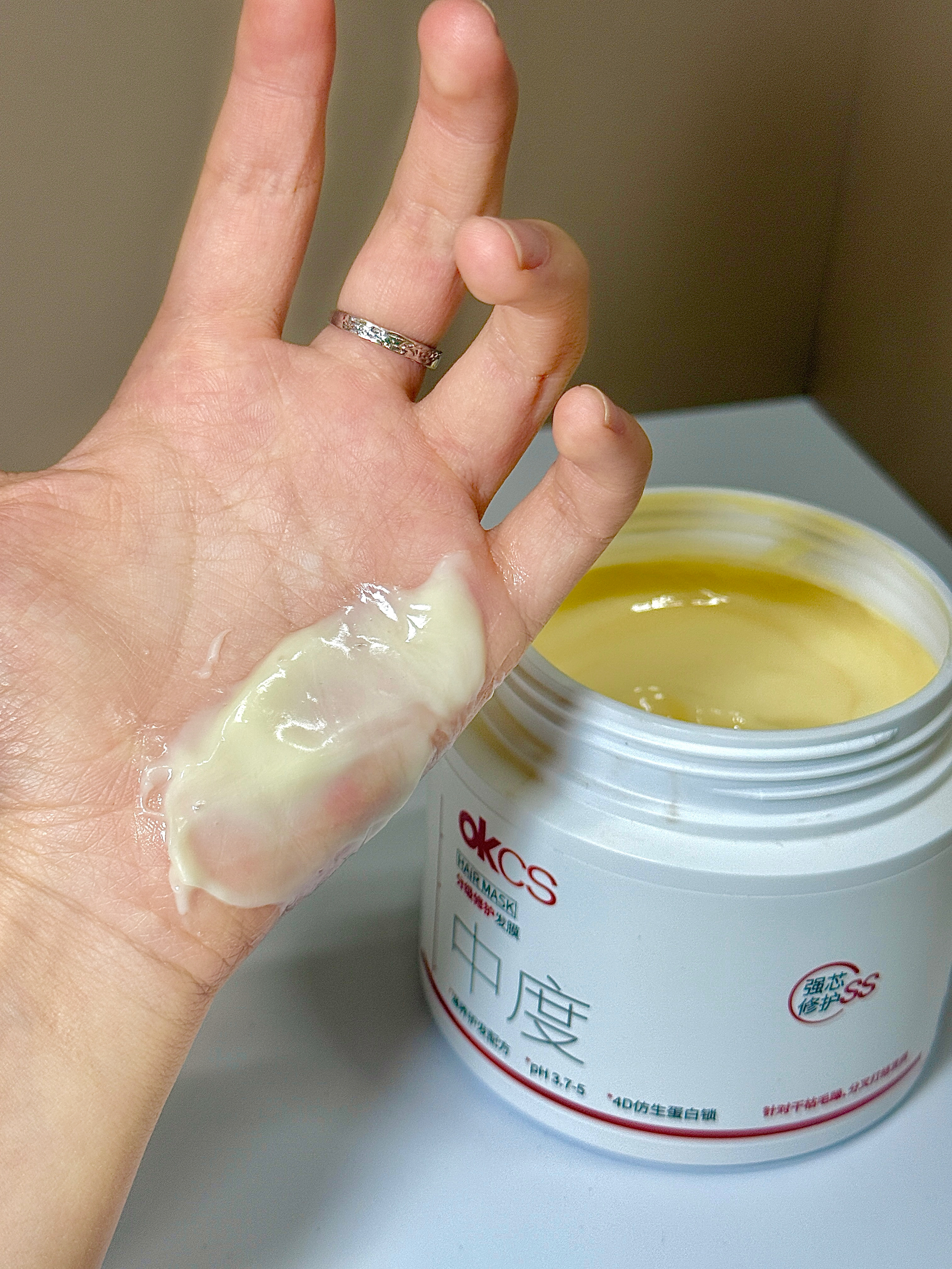 谁懂啊,头发烫染后那叫一个糙,跟枯草似的。直到用了okcs中度发膜,我才找回柔顺头发! 它质地是那种很润的乳霜状,抹在头发上很好推开,也不觉得黏腻。每次洗完头,我会在发梢多涂一些,等个几分钟冲掉。 用完之后,头发顺顺的,梳的时候也不怎么打结了,摸起来软软滑滑的,就像给头发做了个spa。而且它一大罐有500g,能用好久,性价比也不错~