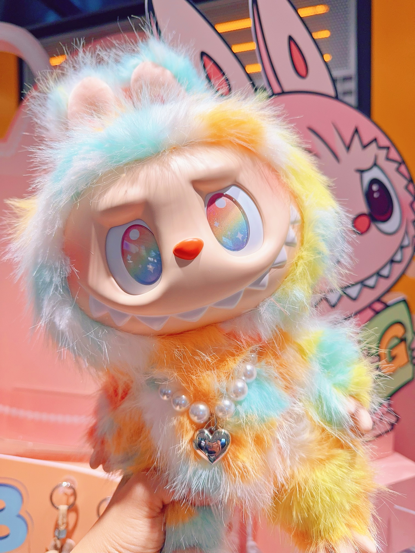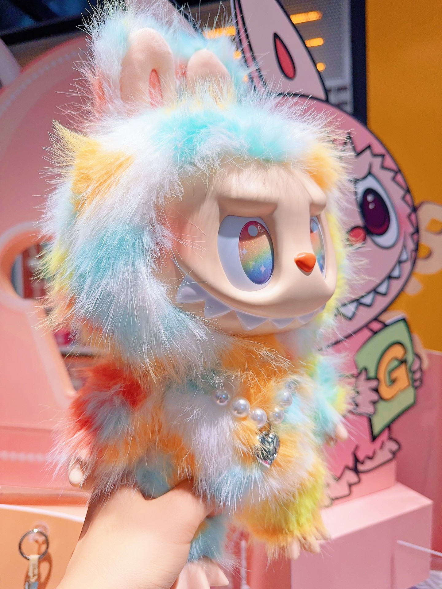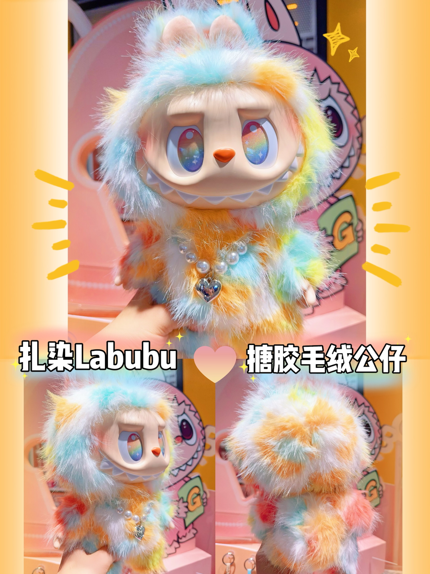全方位展示我最爱的Labubu‼️泡泡玛特前方高能扎染搪胶毛绒公仔太萌了✨一身梦幻的扎染拼色,连眼睛里都是彩虹的颜色,不管侧面还是背面从哪个角度看上去都色彩鲜亮又好看,又长又软的毛毛摸起来手感也很舒服,胸前还佩戴了爱心形状的珍珠项链,真的是细节满满太可爱了呢~图源网络侵删