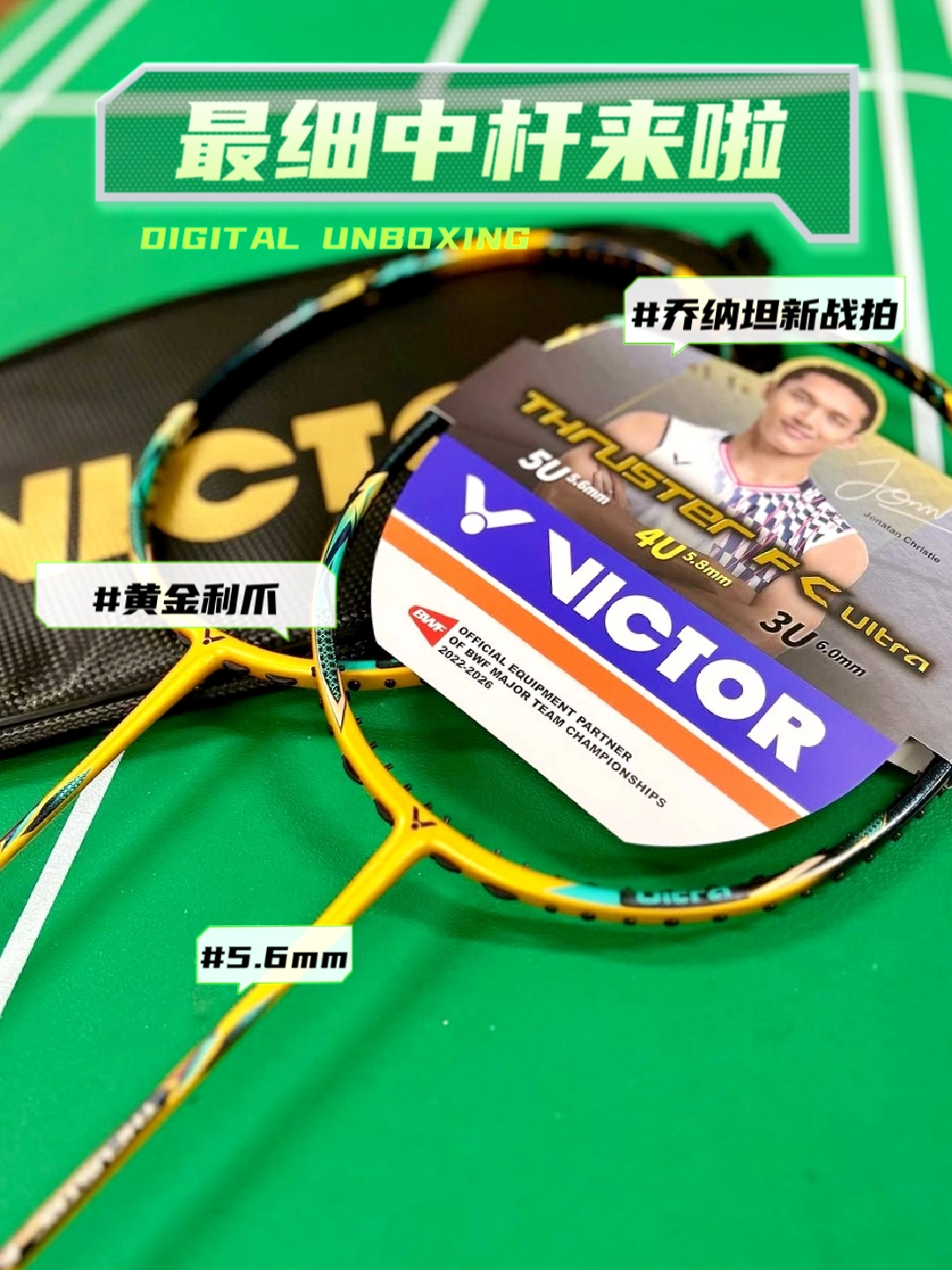 VICTOR THRUSTER F C Ultra(黄金利爪)来啦,这是乔纳坦的新战拍!颜值见仁见智,我是觉得很酷啦! 黄金利爪汇聚了多项科技,完成度非常高。 提供3种规格: 3U/G5 - 6.0 Shaft(硬) 32lbs 4U/G5 - 5.8 Shaft(中偏硬) 31lbs 5U/G6 - 5.6 Shaft(中) ...