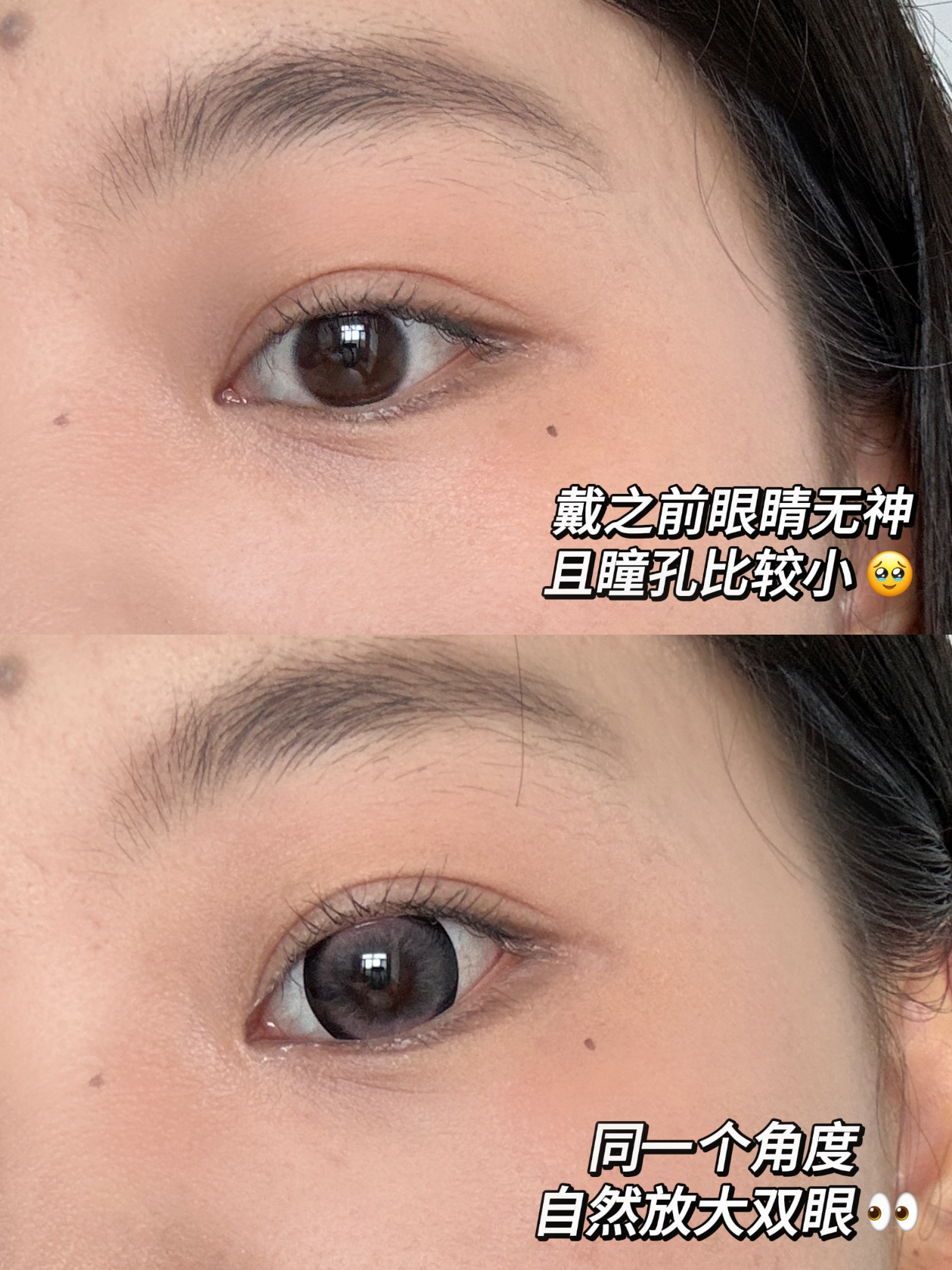 终于让我挖到了内双也能自然放大双眼的美瞳🥰~给大家分享一下我的佩戴经验叭~ ·第一次戴不上美瞳要进行脱敏,主要保持眼睛盯紧一个地方不动,把美瞳放进去,适应之后的就好啦😊 ·我是内双平时眼睛无神,化完妆不戴美瞳显得眼睛很小…介个可啦啦的美瞳是黑框锁边里面颜色是紫粉色渐变~敲自然的拥有呆萌感! ·自然光 | 室内 | 室外不同光线下显示感觉尊嘟hin水光眼🤩!主要是介个可啦啦的我佩戴起来没有异物感眼睛...