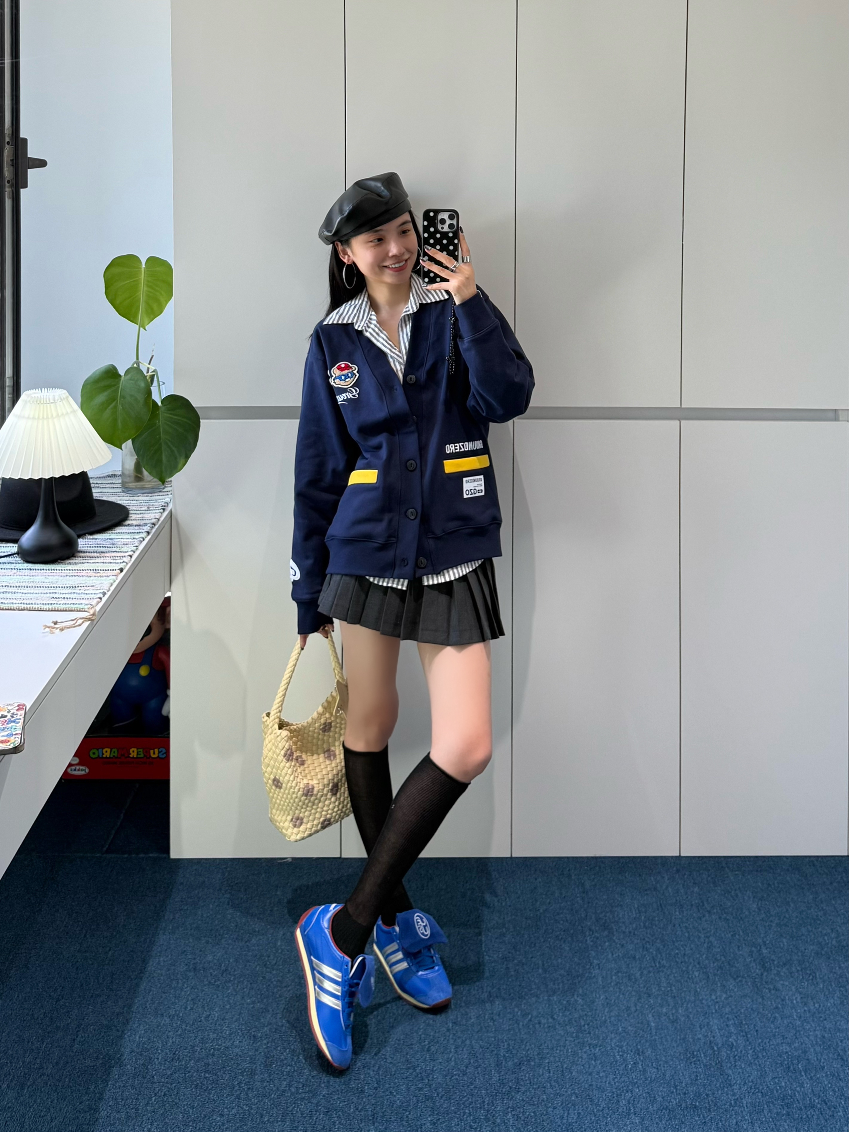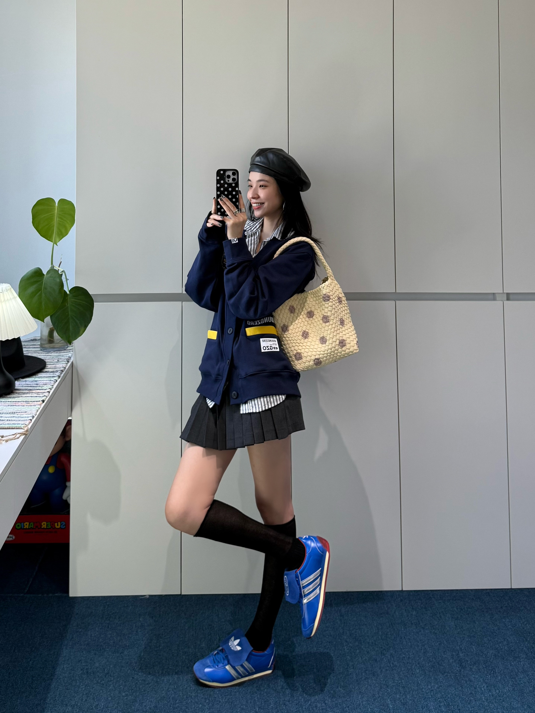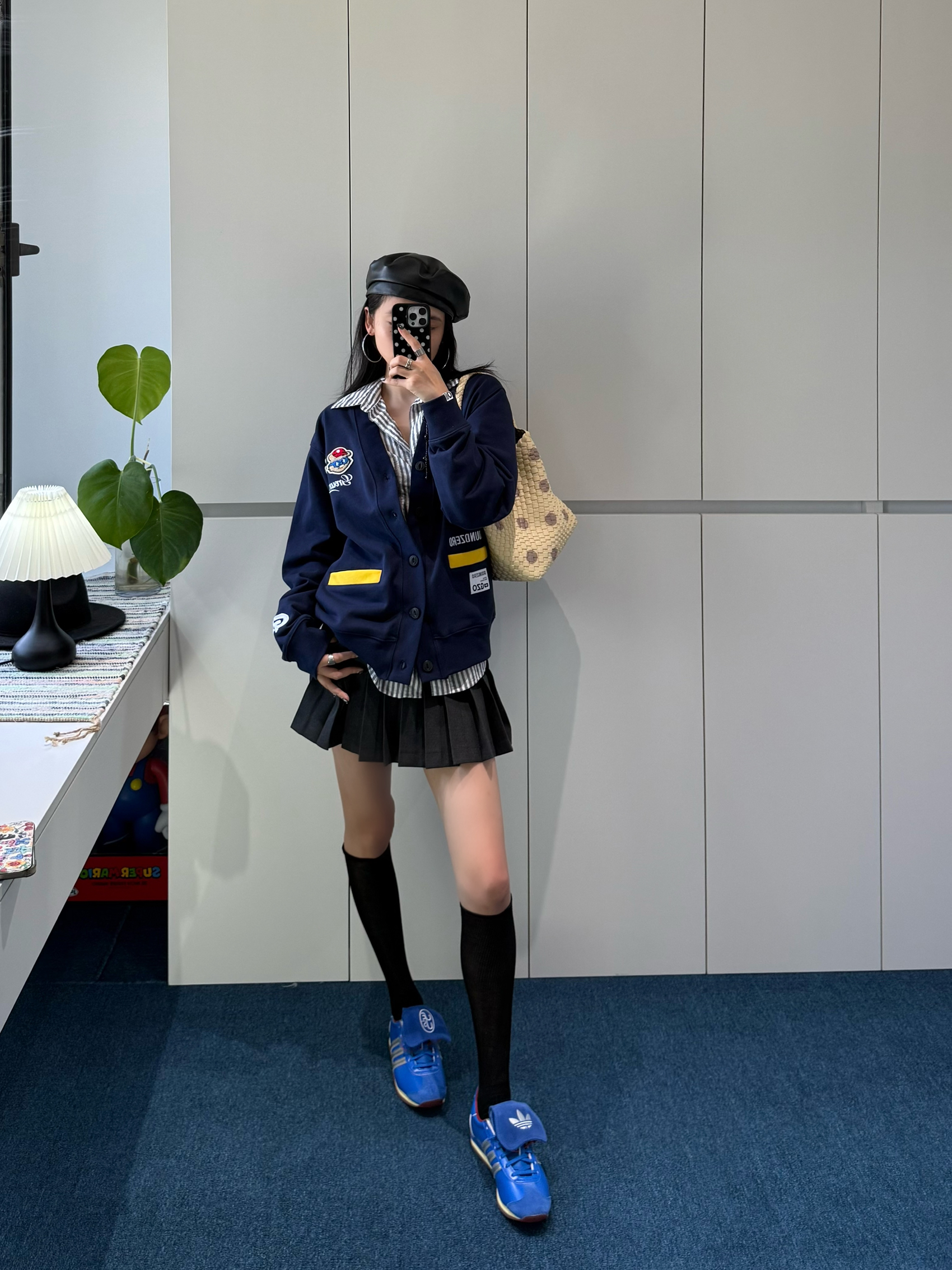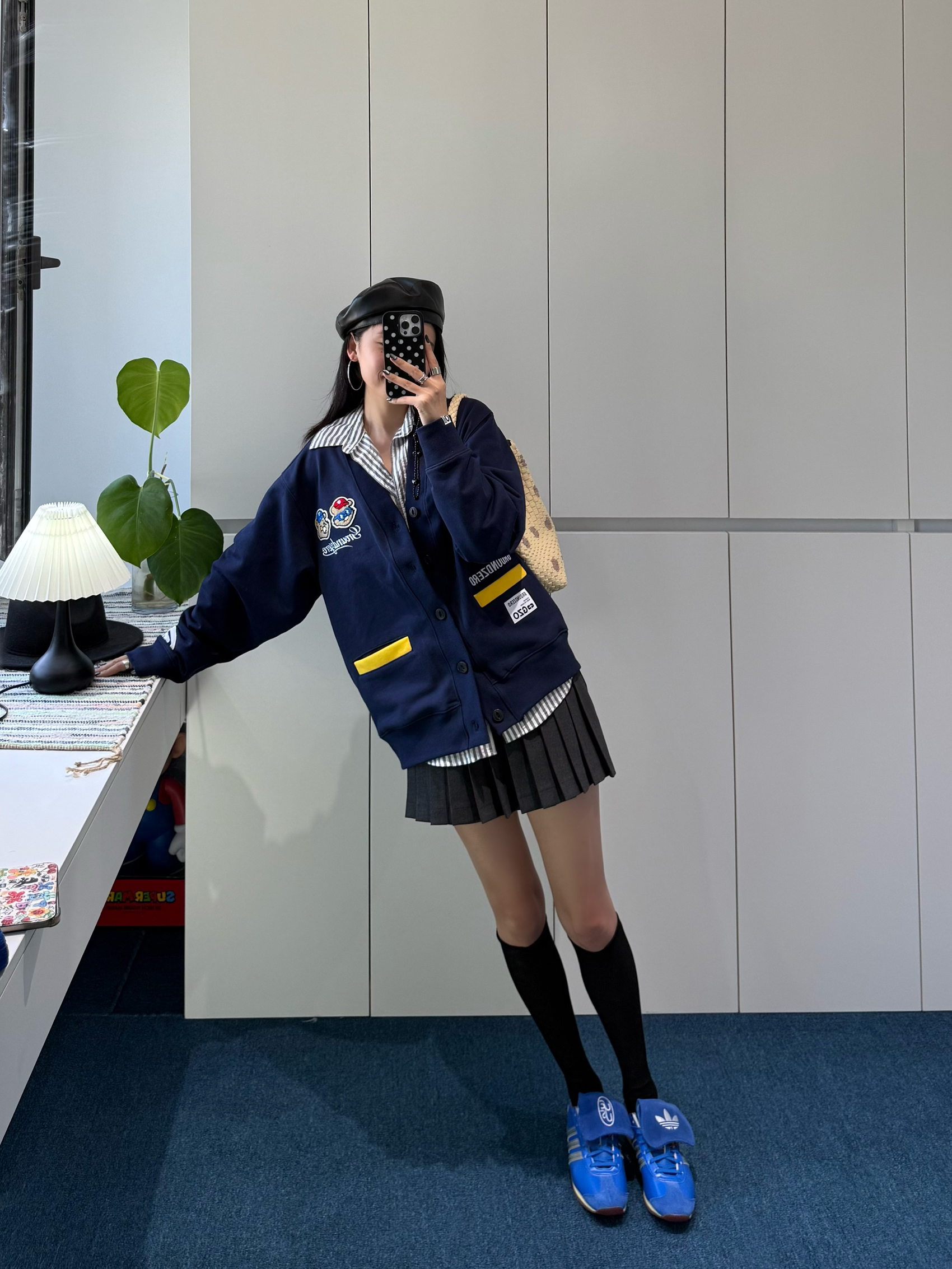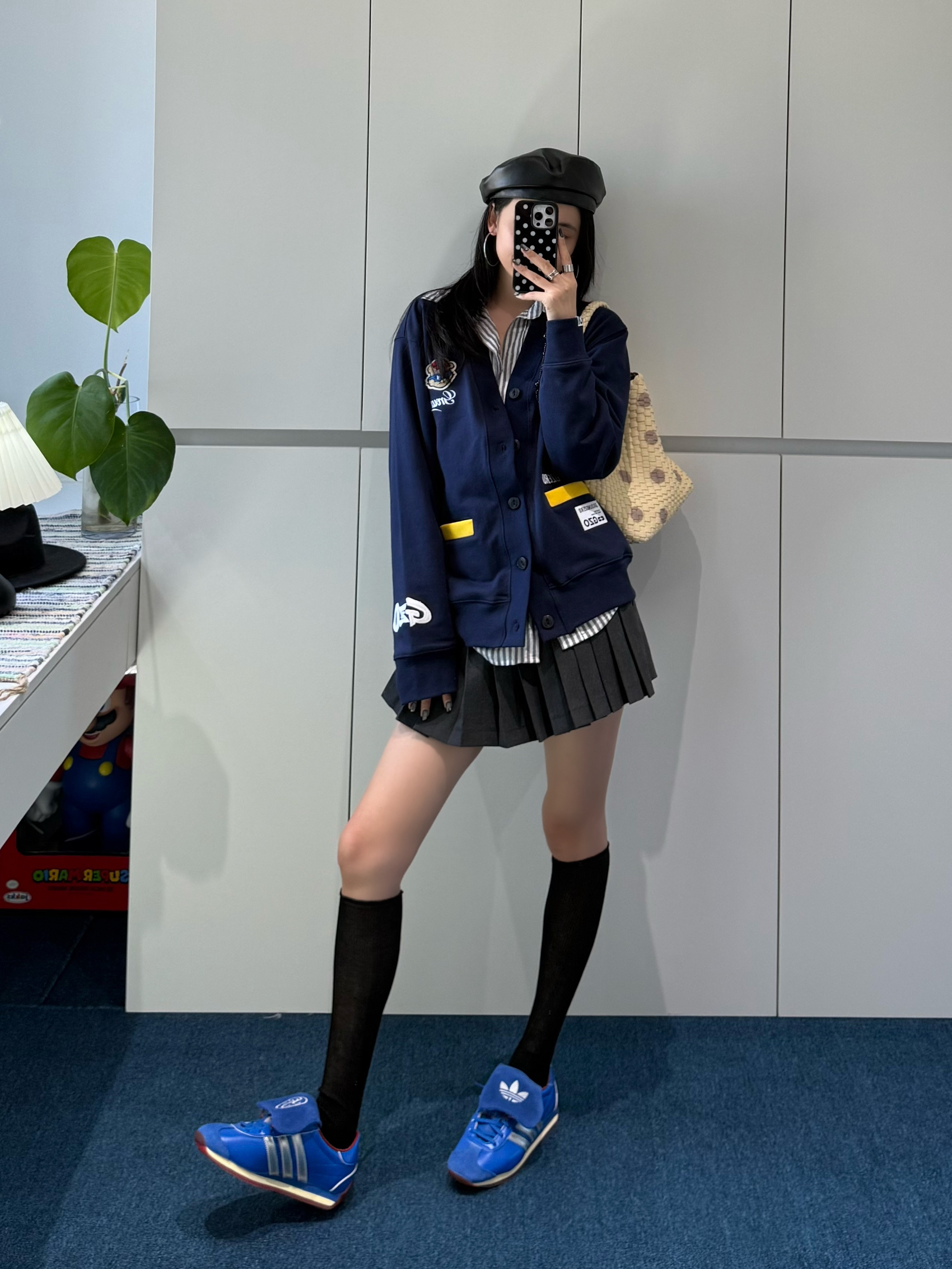 藏蓝色徽章开衫软乎乎的,徽章和黄色标点缀得好精致 内搭条纹衬衫,领口露出来瞬间让层次丰富了~ 黑色百褶裙一穿,学院那股子青春劲儿就出来了,配上黑长袜,腿型看着巨直! adidas运动鞋亮蓝色特别吸睛,还和开衫颜色隐隐呼应 再戴顶贝雷帽、挎个波点包,学院感里混着点复古俏皮✨